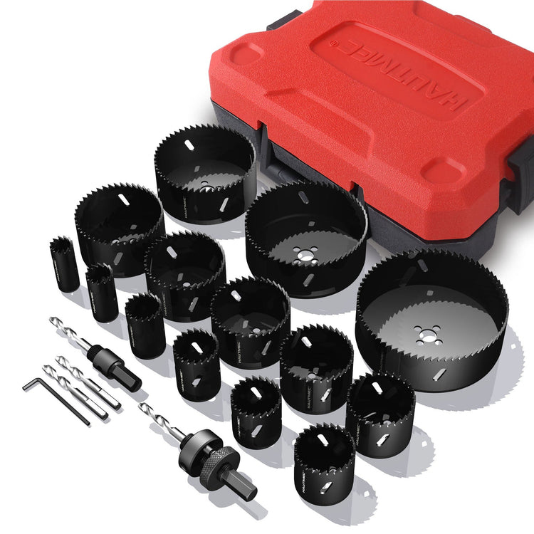 HAUTMEC 21-Piece Bi-Metal Hole Saw Kit, 3/4″–4-3/4″ (19–121mm), Heavy-Duty HSS Blades with 2 Arbors, 4 Drill Bits, Hex Key & Storage Case for Wood, Drywall, PVC & Thin Metal – HTHOH25013