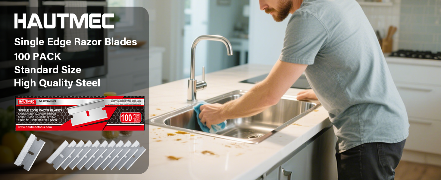 HAUTMEC 100 Pack Single Edge Razor Blades, Heavy Duty Edge Blades, Ultra Sharp, Rust-Resistant,Industrial & DIY Use, Fits most Standard Scraper & Utility Knife, for Removing Decals, Stickers HTPBM25029