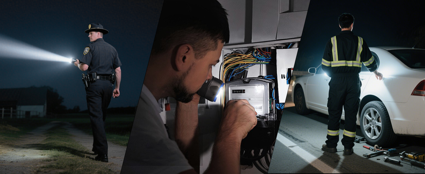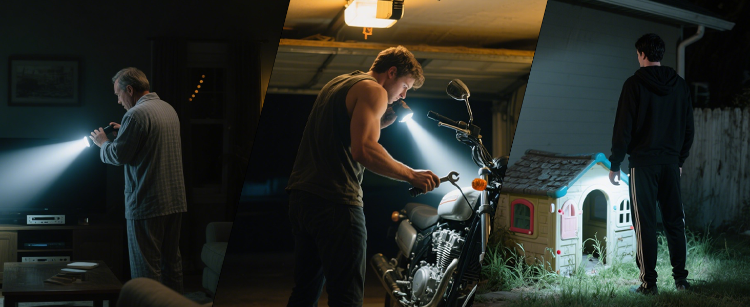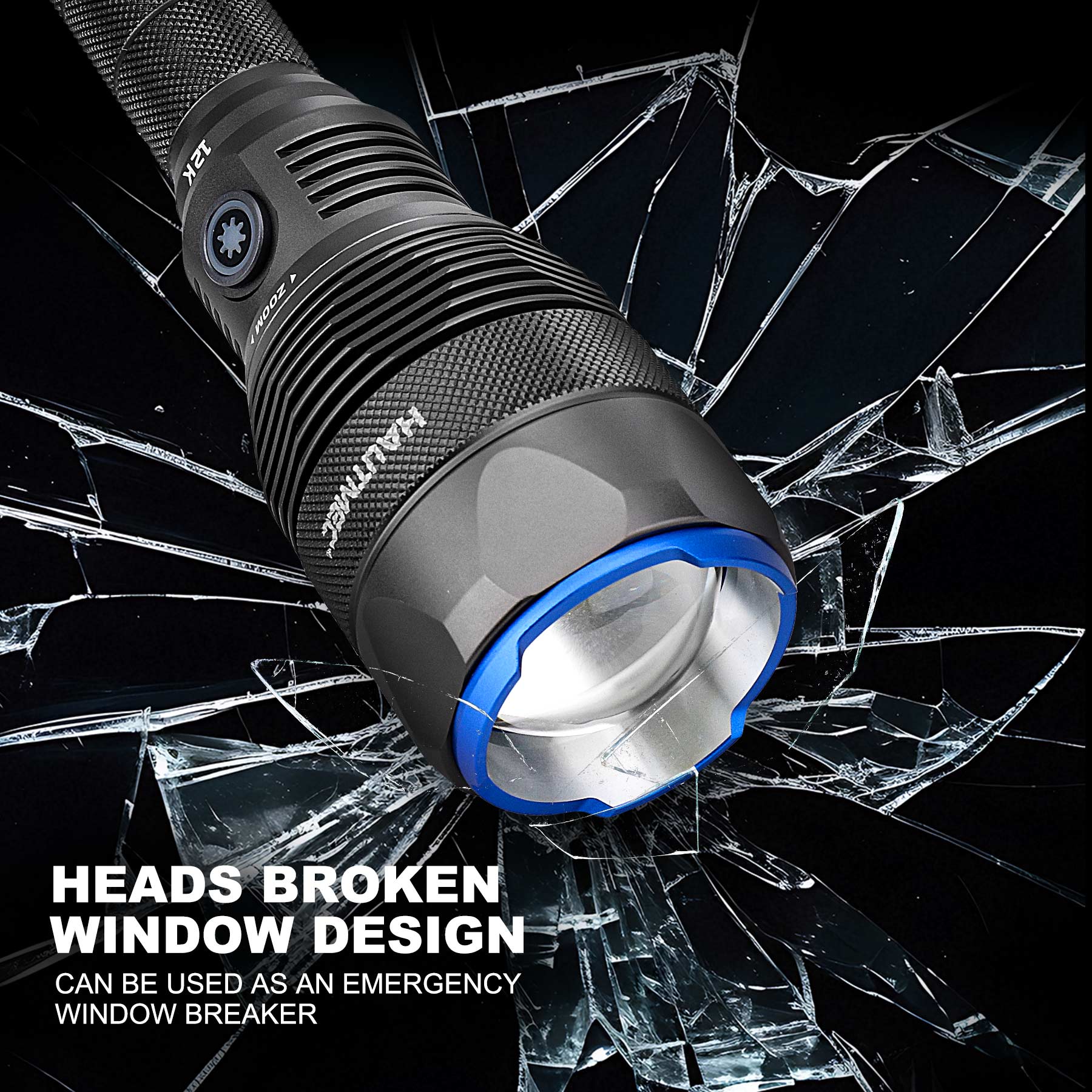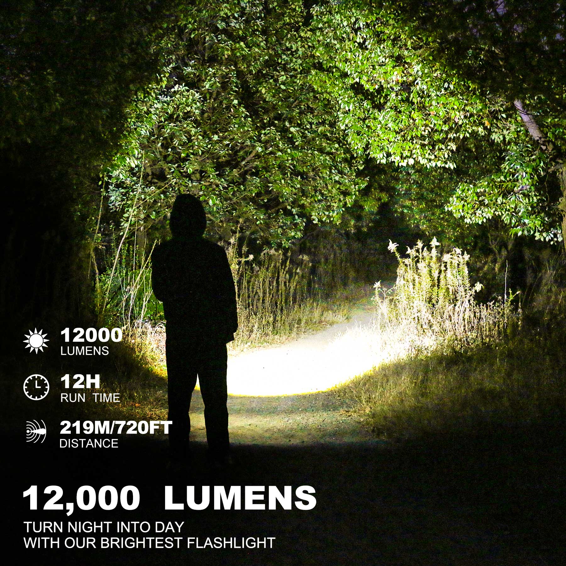 - 12000 Lumens Turbo Zoom: Light up the darkest nights with 12000 lumens Turbo mode (30-second burst) and 2X adjustable zoom—switch seamlessly from a long-distance spotlight (500m+) to a wide-angle floodlight, perfect for camping, emergencies, or tactical use. COB LED rechargeable flashlight ensures crisp, even illumination.