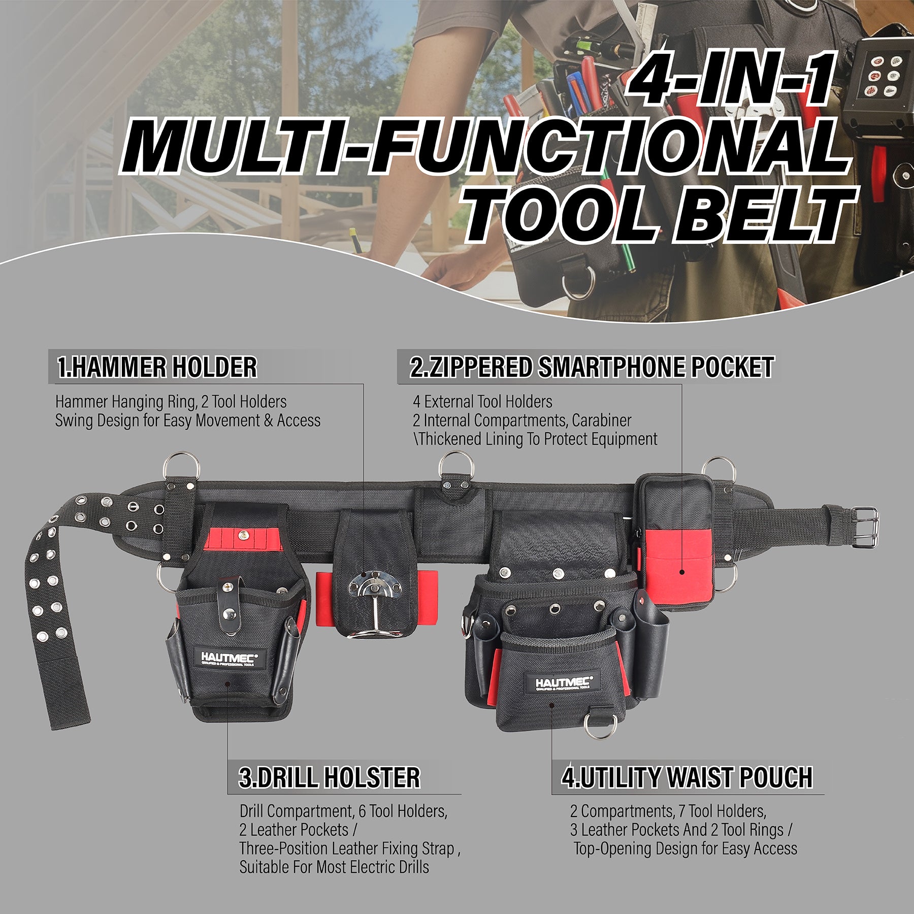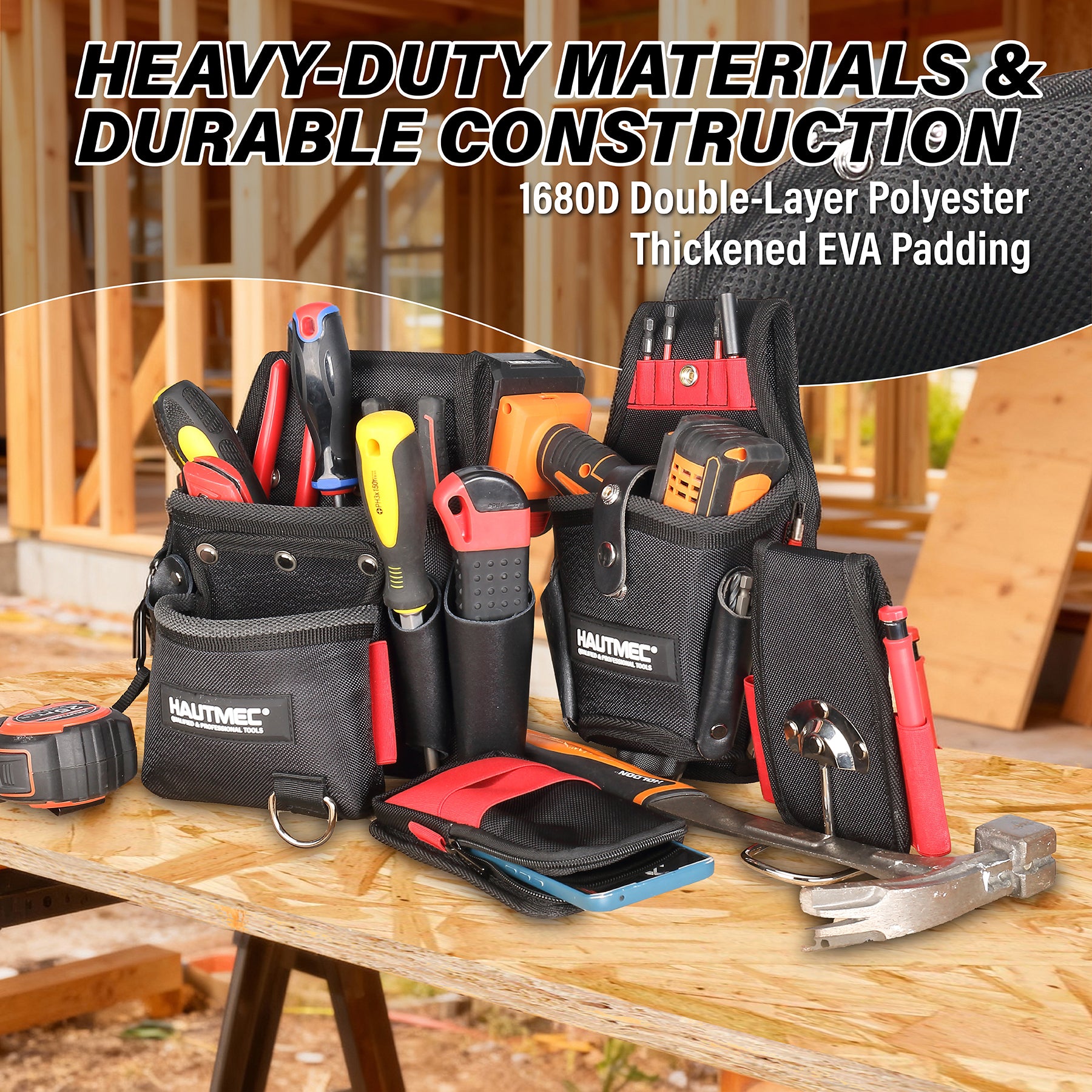 HAUTMEC 4-in-1 Heavy Duty Tool Belt Set with Leather Pockets, 1680D Polyester & EVA Reinforced Construction, 37 Pockets Organizer, Adjustable 35"-50" Belt – Fits Drill, Hammer, Phone & Measuring Tools – HT0409