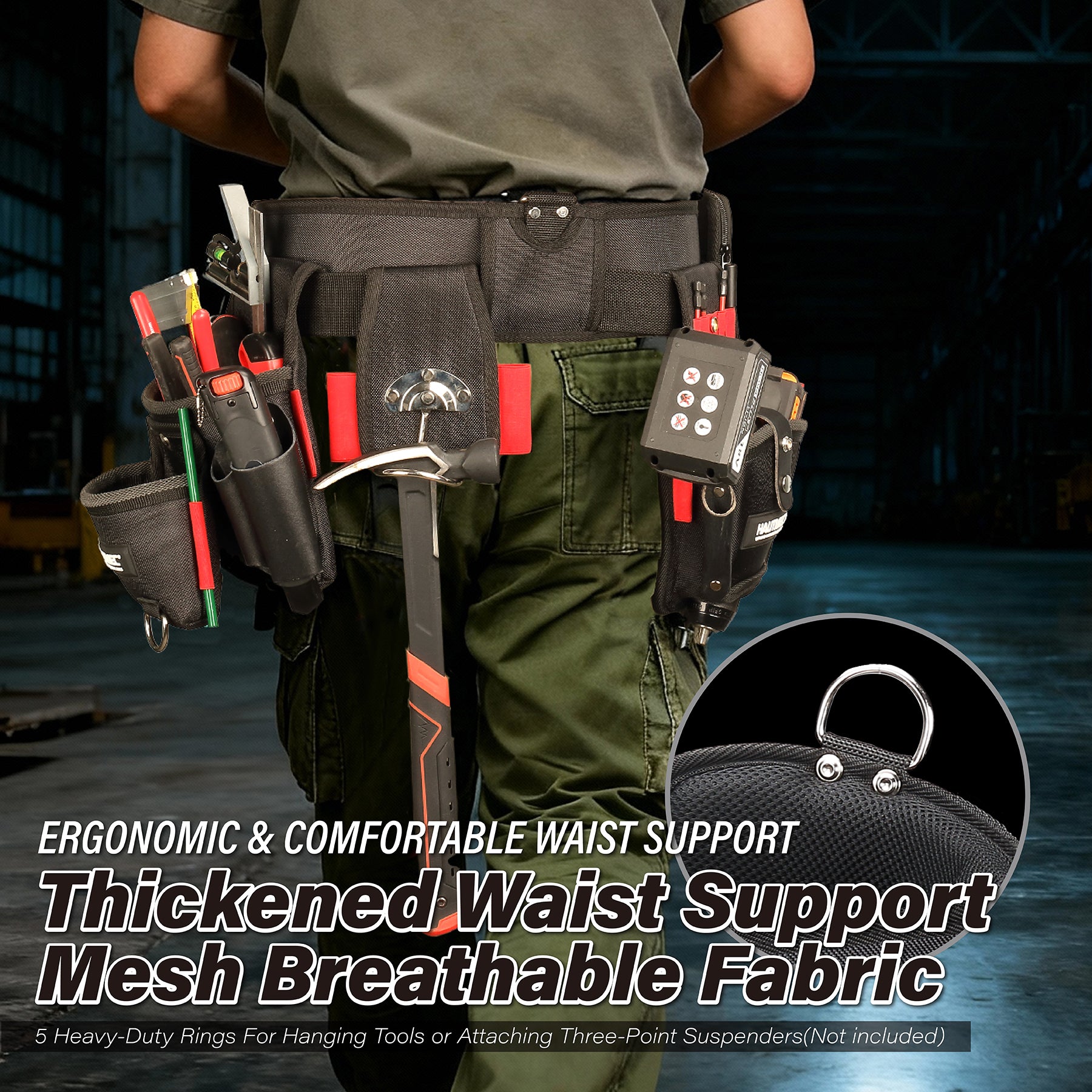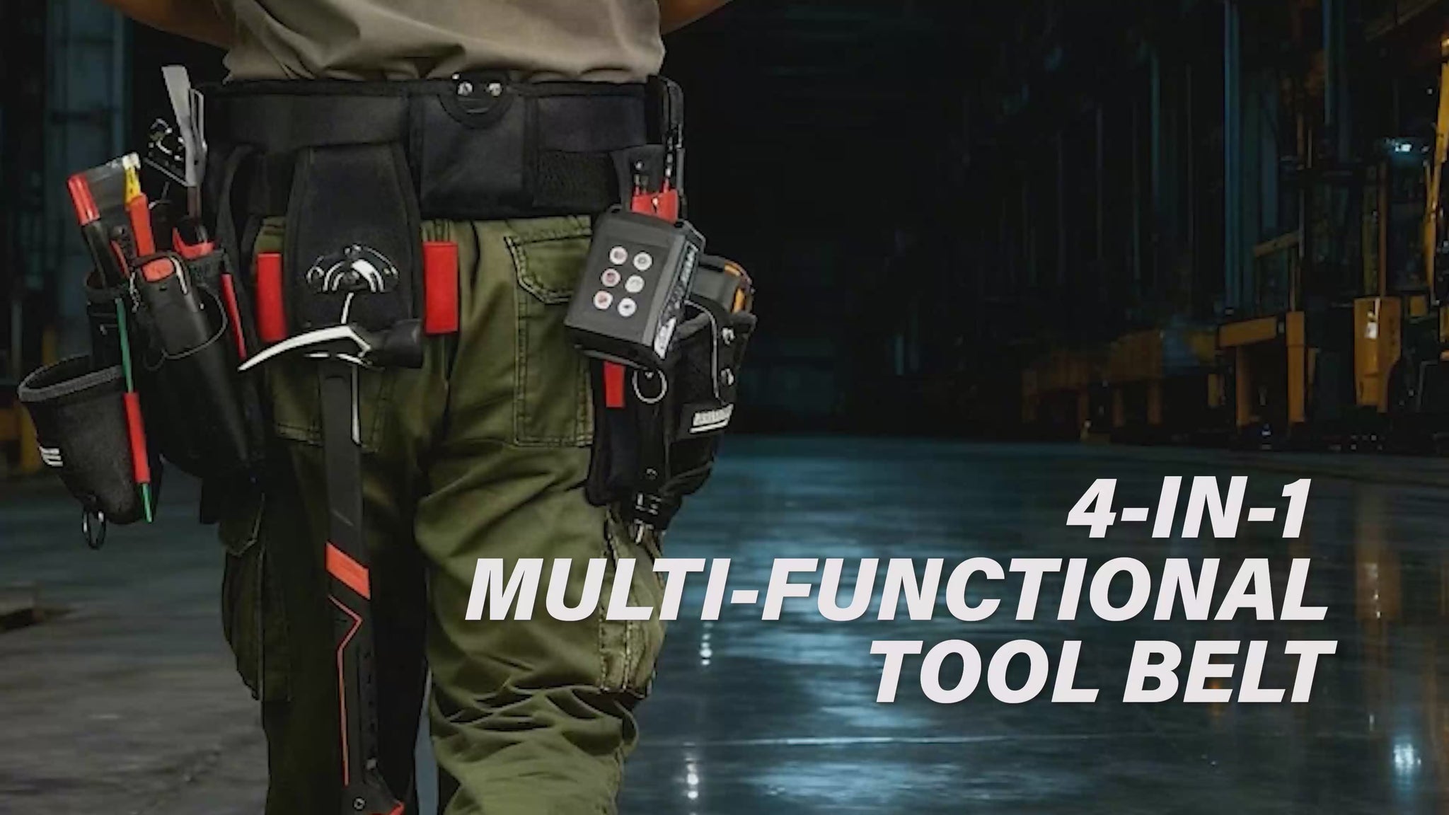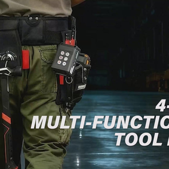 Includes a drill holster, hammer holder, utility waist pouch, and phone/tool bag — a total of 37 functional pockets & holders for screwdrivers, pliers, nails, drills, rulers, and more. Perfect for organized, hands-free work on any job site.