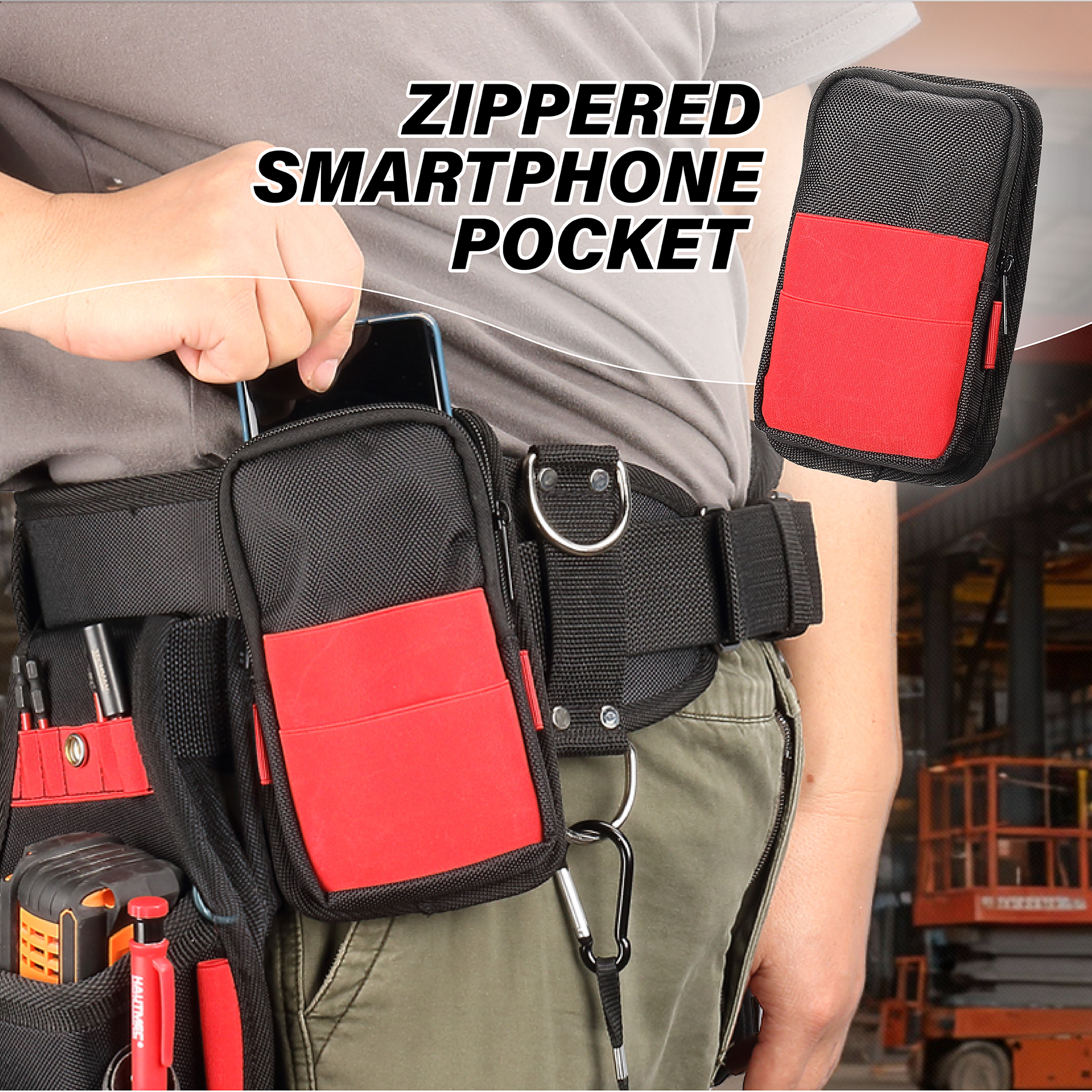 Features a zippered phone pouch, card slot, elastic drill loops, and a leather snap holder for cordless tools. Hammer loop swings naturally to prevent bumping; every pouch reinforced with PE board for shape retention.