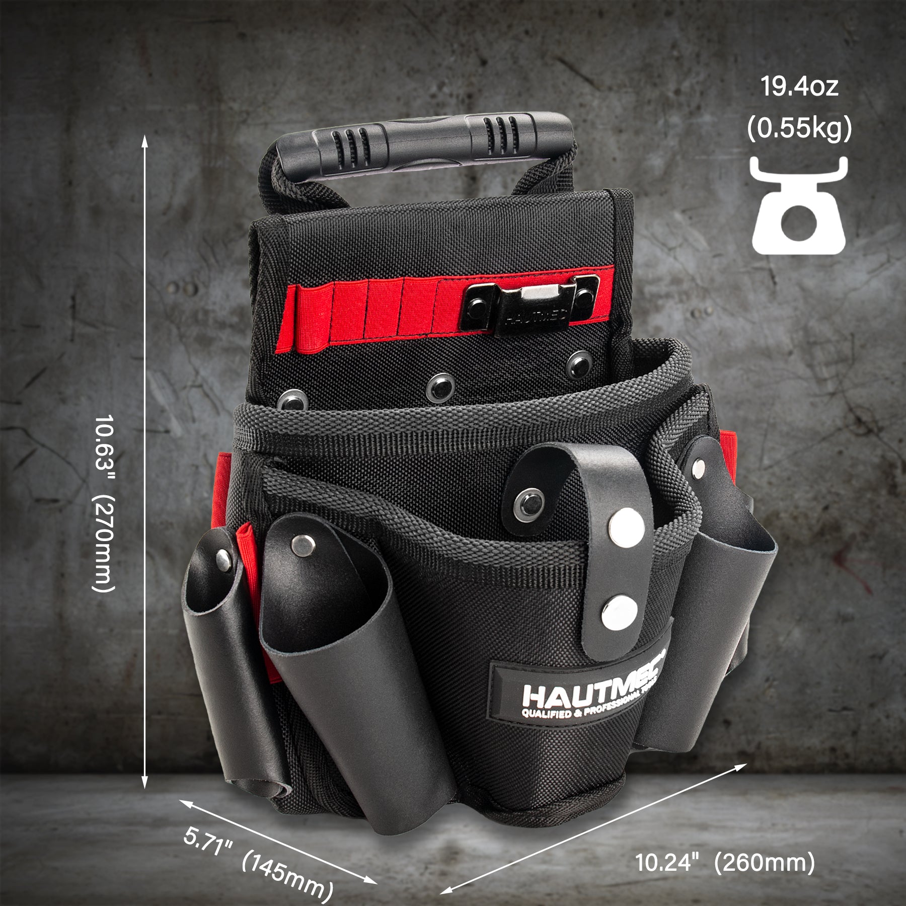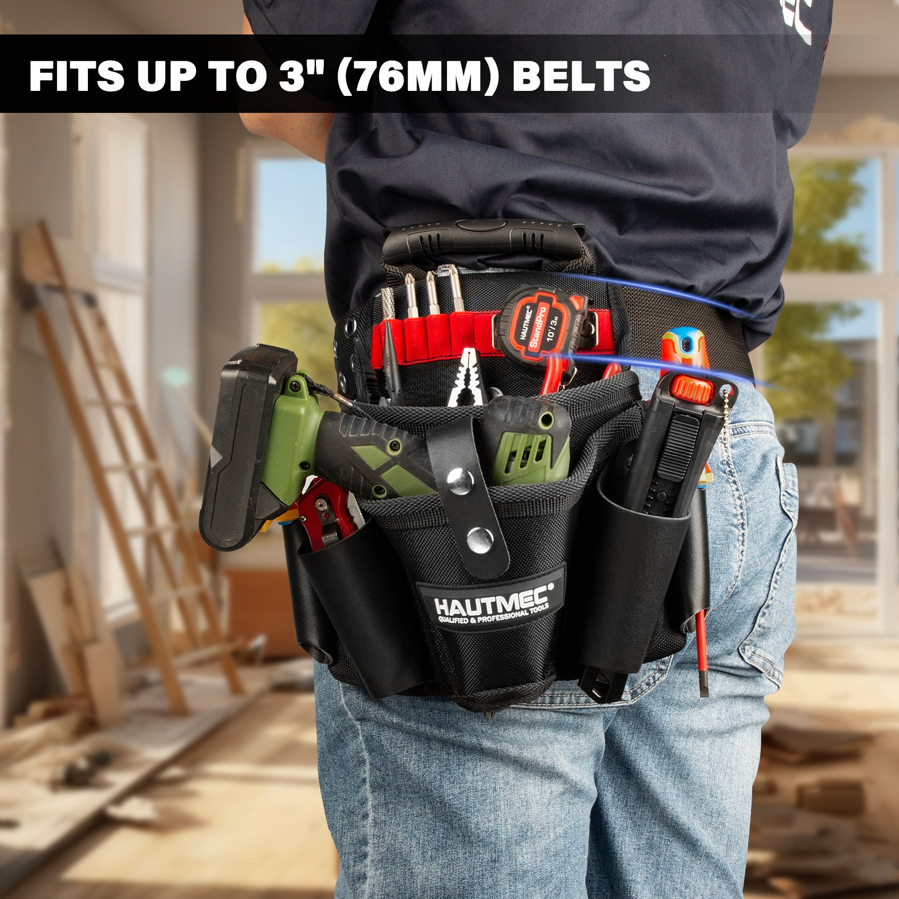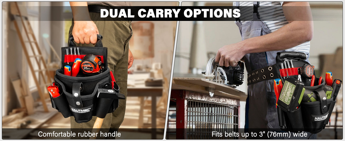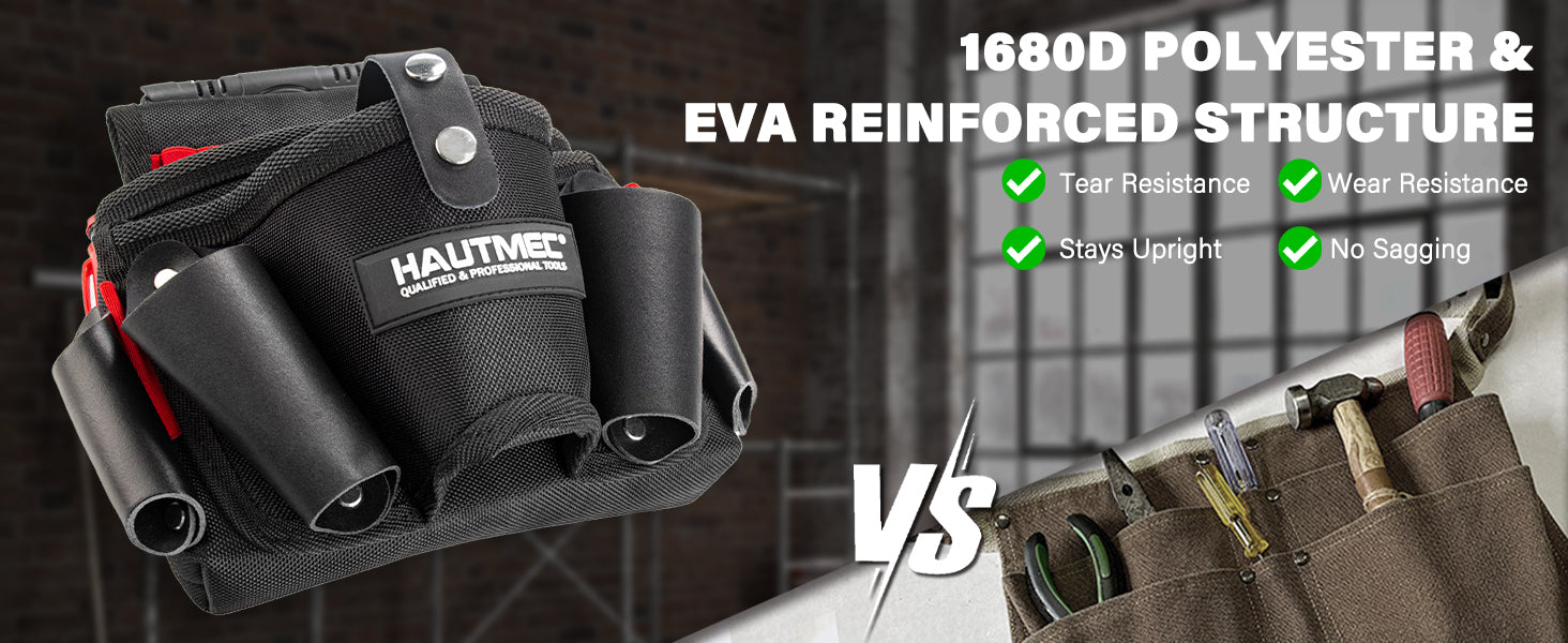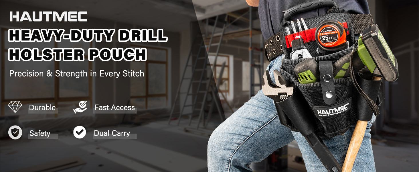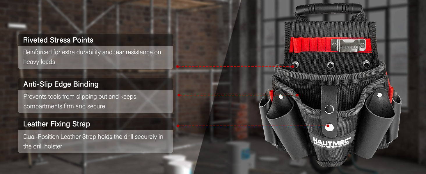 HAUTMEC Heavy-Duty Tool Pouch with Drill Holster, 1680D Tool Bag for Belt with Rubber Handle, 2 Main Compartments, 4 Leather Pockets, 11 Elastic Loops, Tape Measure Holder – HT0410