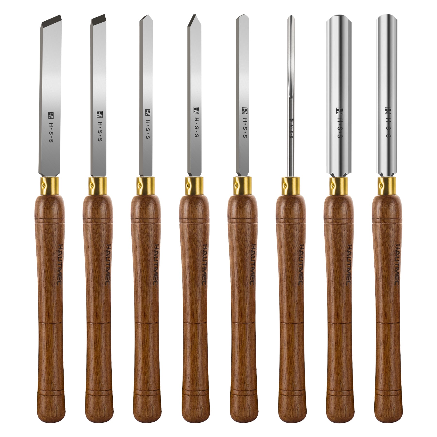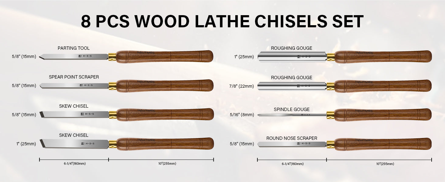 - 【Complete 8-Piece Woodturning Set】Cover all your turning projects from roughing to fine detailing. This comprehensive set includes 2 Roughing Gouge-1" (25mm) & 7/8" (22mm), 1 Spindle Gouge-5/16" (8mm), 2 Skew Chisel -1" (25mm) & 5/8" (15mm), 1 Parting Tool – 5/8" (15mm), 1 Round Nose Scraper – 5/8" (15mm), 1 Spear Point Scraper – 5/8" (15mm). Everything you need to start creating bowls, spindles, and other beautiful wood pieces right out of the box