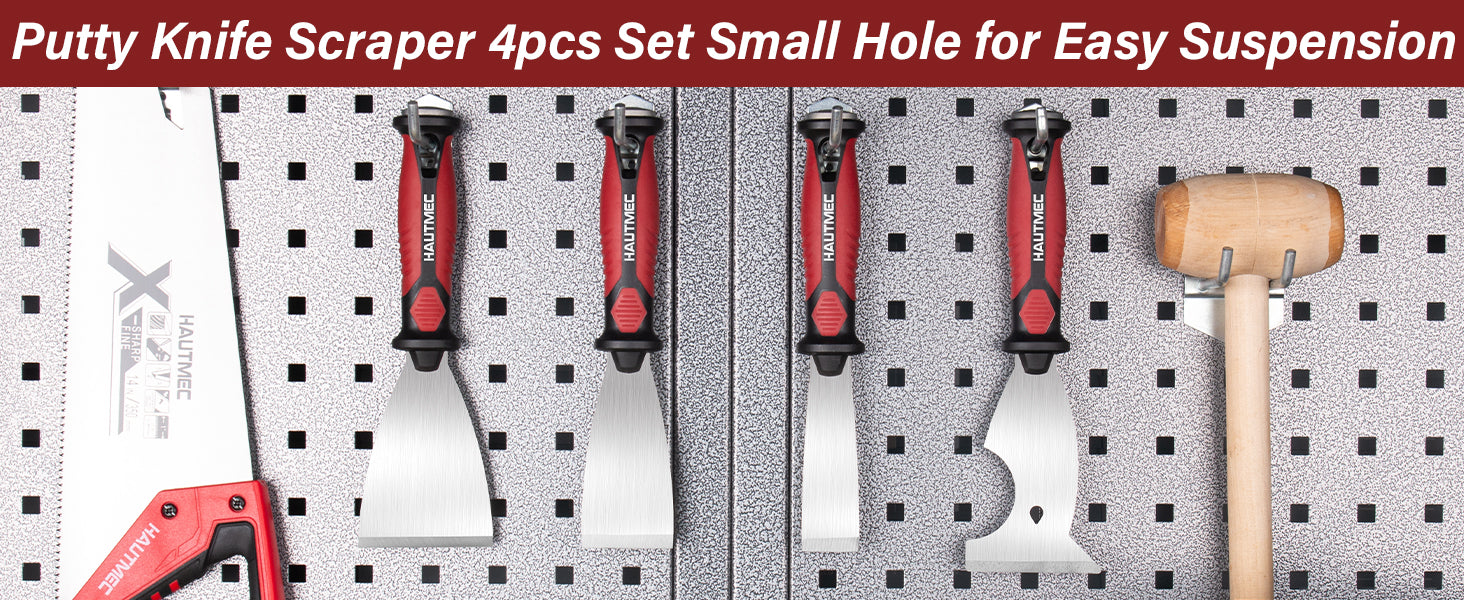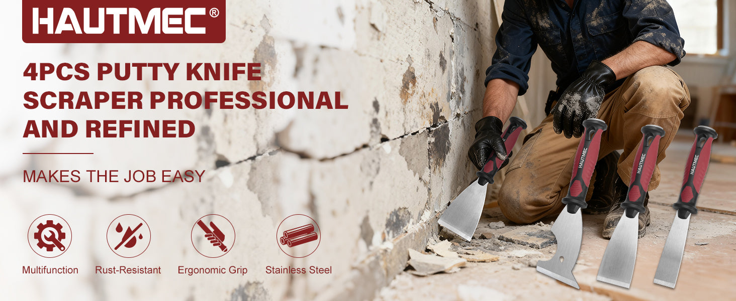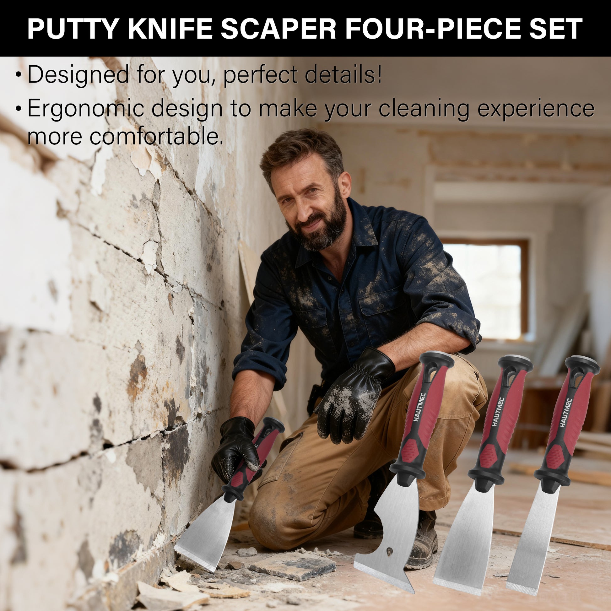 HAUTMEC Putty Knife 4 PC Set, 1.25",2",3" Paint Scraper & 3" 8-in-1 Paint Stripper, Heavy Duty Stainless Steel Blade and Hammer End for Removing Wallpaper, Plaster, Cement HTPSH25060