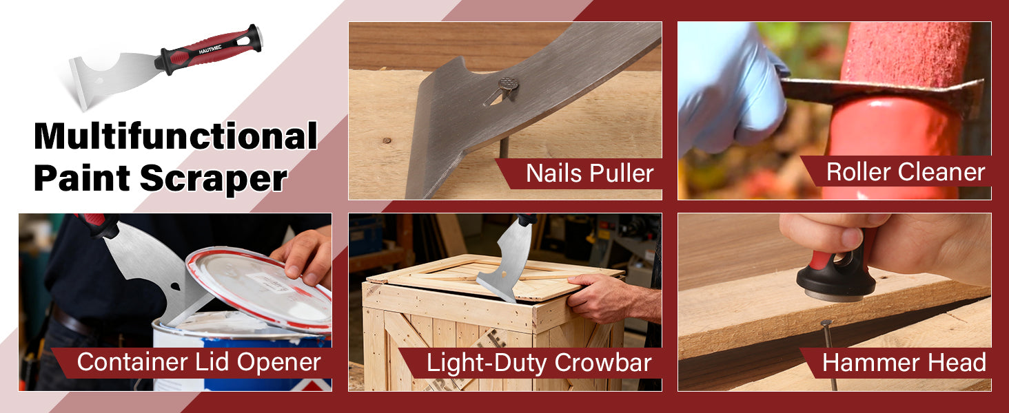 - 【8-in-1 Multi-Paint Stripper】: This 3" 8-in-1 tool combines scraping, applying, can opening, nail pulling, and cleaning functions. It effectively removes paint and adhesives, while also working well for applying putty, caulk, and other materials - meeting various project needs