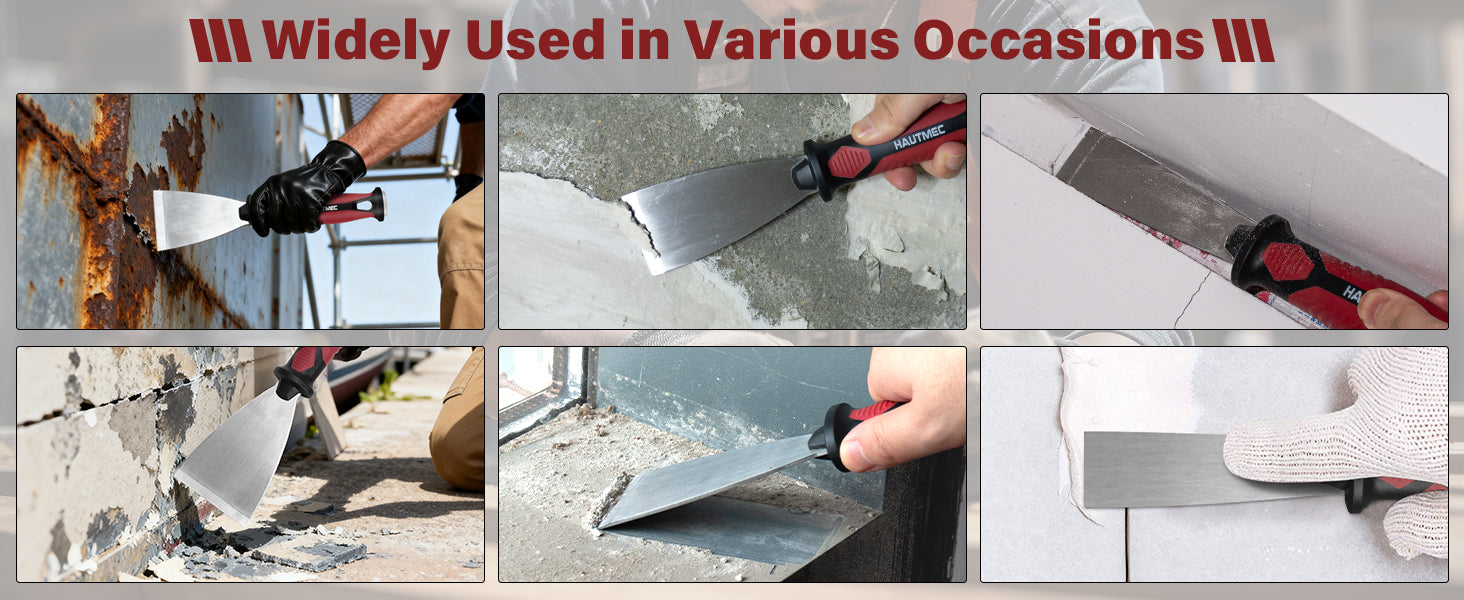 - 【Professional Putty Knife 4Pc Set】: This curated set includes 1.25" (detail work), 2" (general application), 3" (broad surfaces) scrapers and a 3" 8-in-1 stripper. Ideal for various tasks like scraping, spreading, and stripping on interior/exterior surfaces, including wallpaper removal, putty/spackle application, and plaster/cement repair