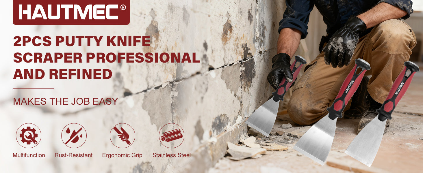 HAUTMEC 2pc Putty Knife Set, 2.5 in Staight and 3 in Offset Scrapers, Heavy Duty Stainless Steel Blade and Hammer End for Removing Wallpaper, Applying Putty, Plaster, Cement HT0061