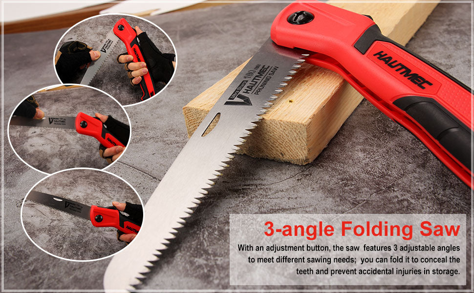 - Safety and Multi-angle Use - Equipped with an adjustment button, the saw has 3 adjustable angles for the blade in order to meet different sawing needs; to safeguard your safety, you can also lock it up by folding it to conceal the teeth and prevent accidental injuries in storage