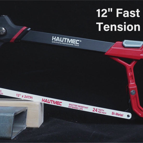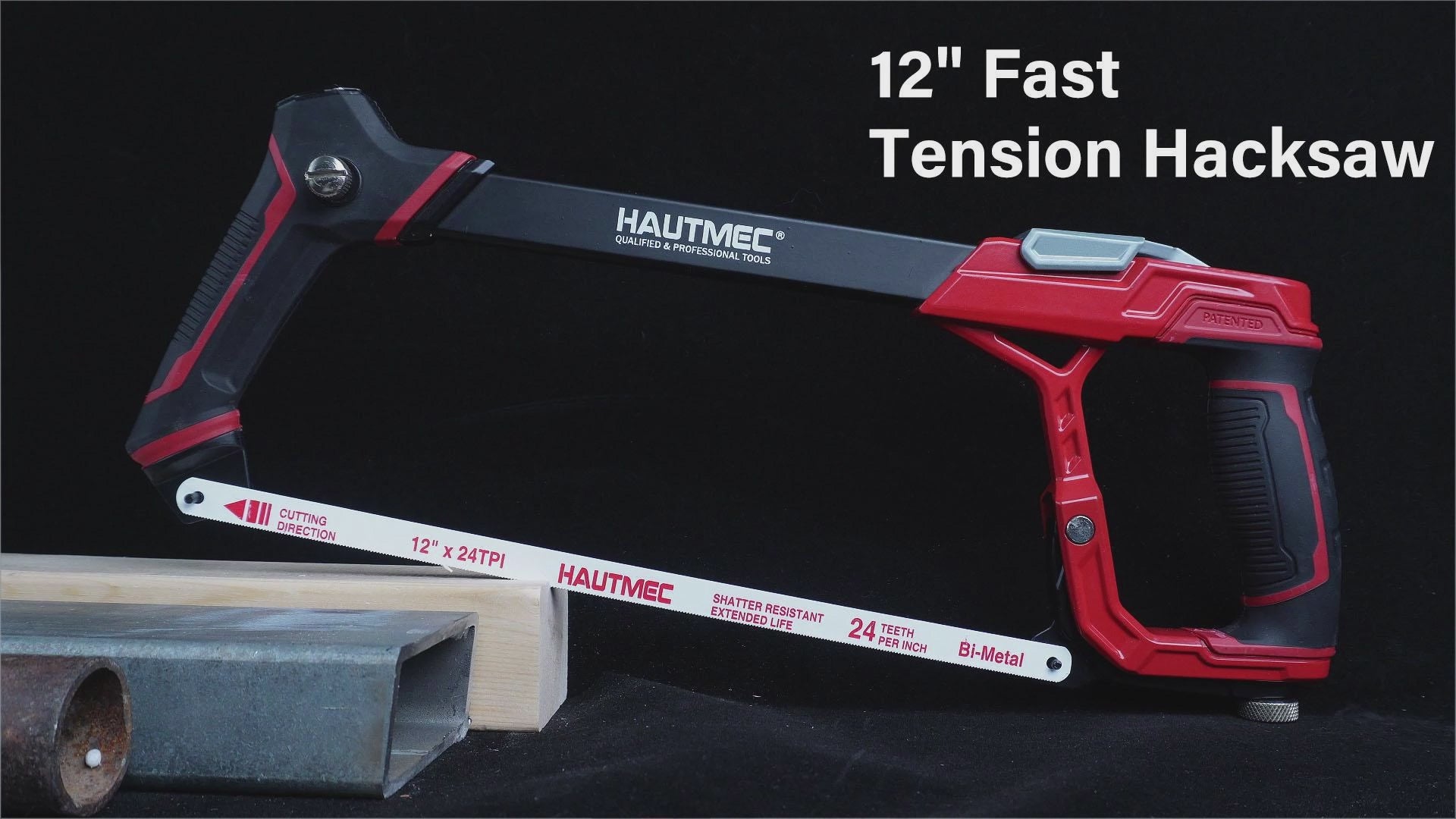 HAUTMEC 12" Fast Tension Hacksaw with Extra 5 HSS Blades, Heavy-Duty Aluminum Frame, Quick-Change Tension, Blade Storage, Pro Hack Saw with Dual Cutting Angles for Metal, PVC, Wood - HTHSH25034