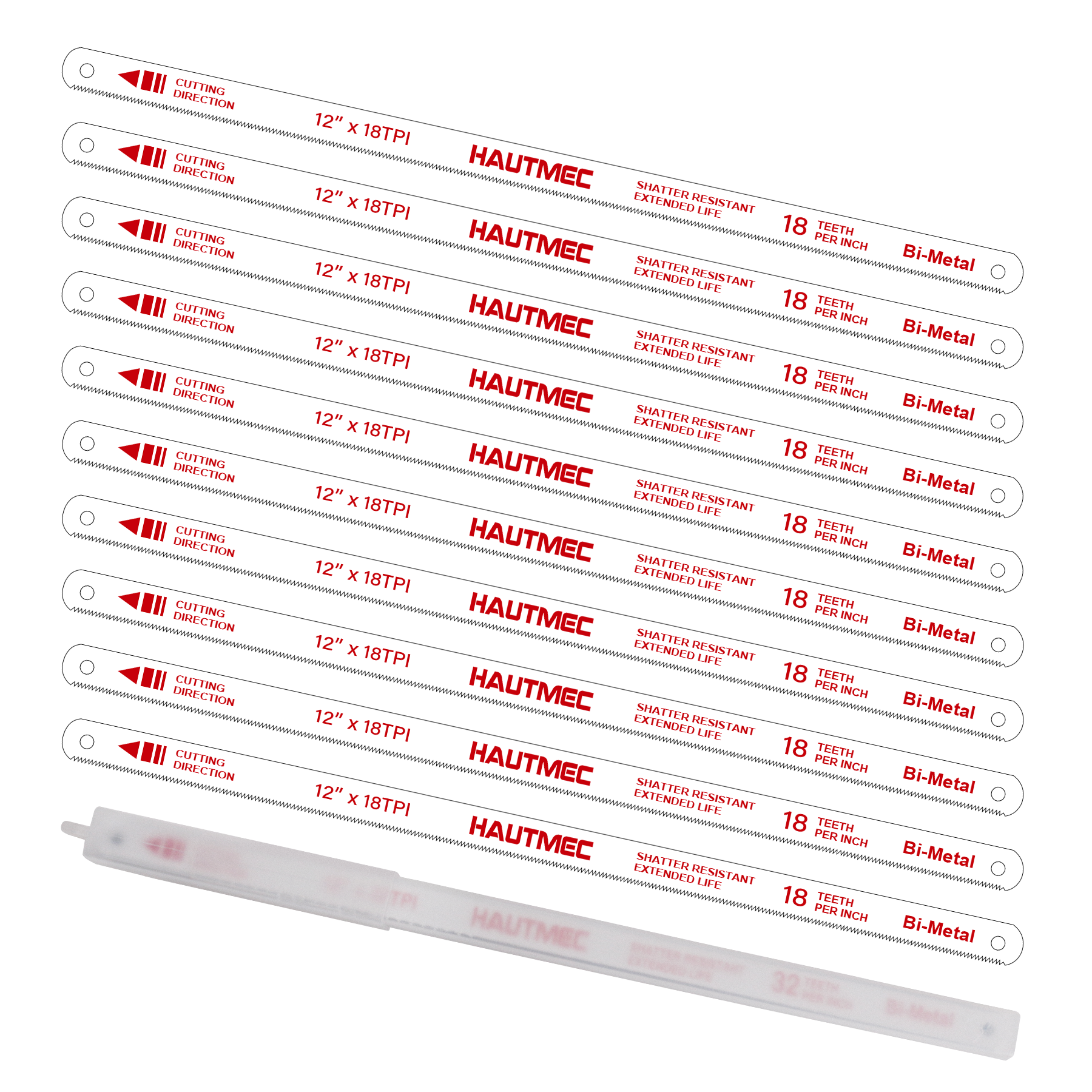 HAUTMEC 12" Hacksaw Blades Replacement Bi-Metal(10 Pack) 18 TPI High Speed Steel Grounded Teeth HT0016-CT