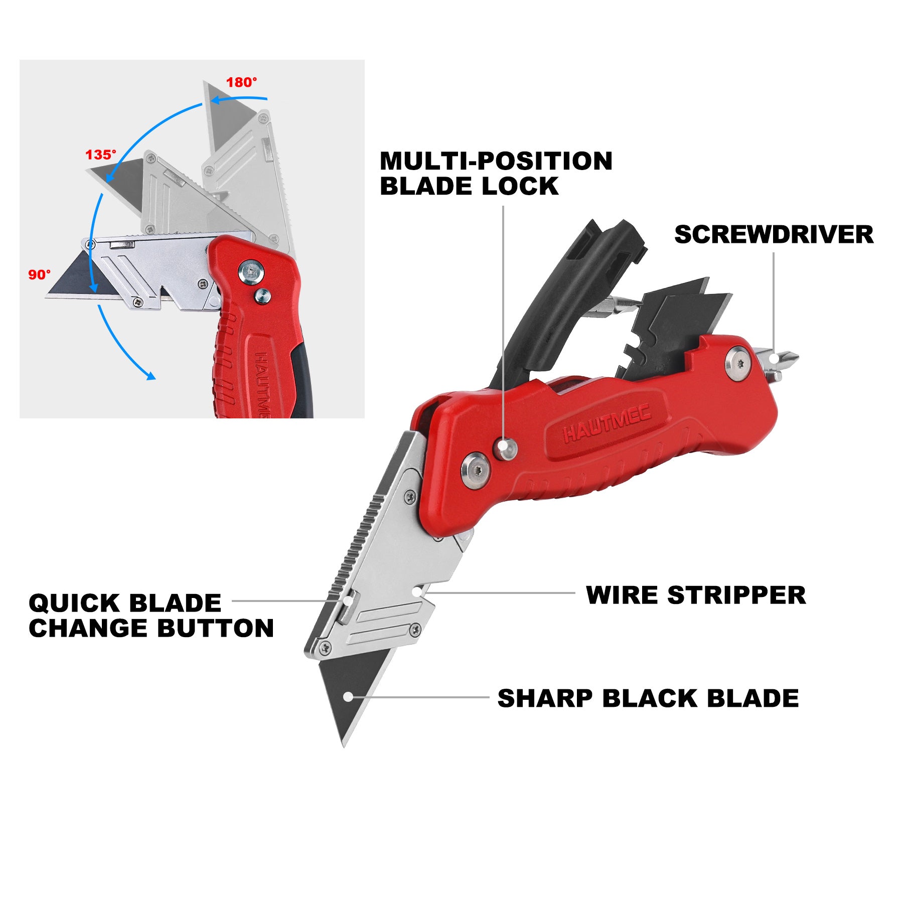 HAUTMEC Folding Utility Knife with Screwdriver, Heavy-Duty Aluminum Box Cutter with Quick-Change Blade, Wire Stripper, Blade Storage & Safety Lock, Multitool Work Knife for DIY & Jobsite - HT0294