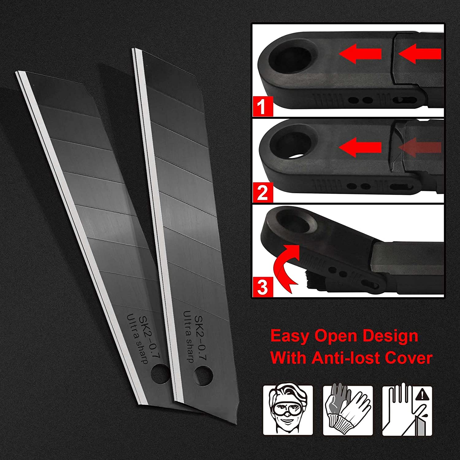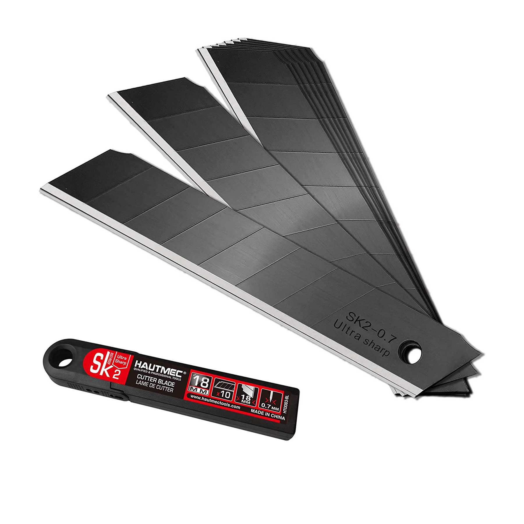 - 【Quality SK2 Blade】18mm carbon steel SK2 blade boasts ultra hardness, edge retention, sharpness, durability, helping you spend once but save more money; triple cutting edge tech increasing 50% extra sharpness; laser cutting edge hardening tech increase the hardness by 2 degrees (HRC: 65); black treated rust-proof material offers long-time cutting edge resistance