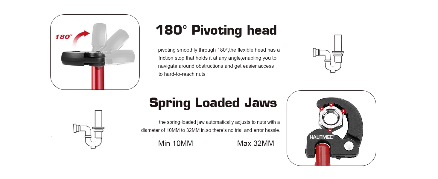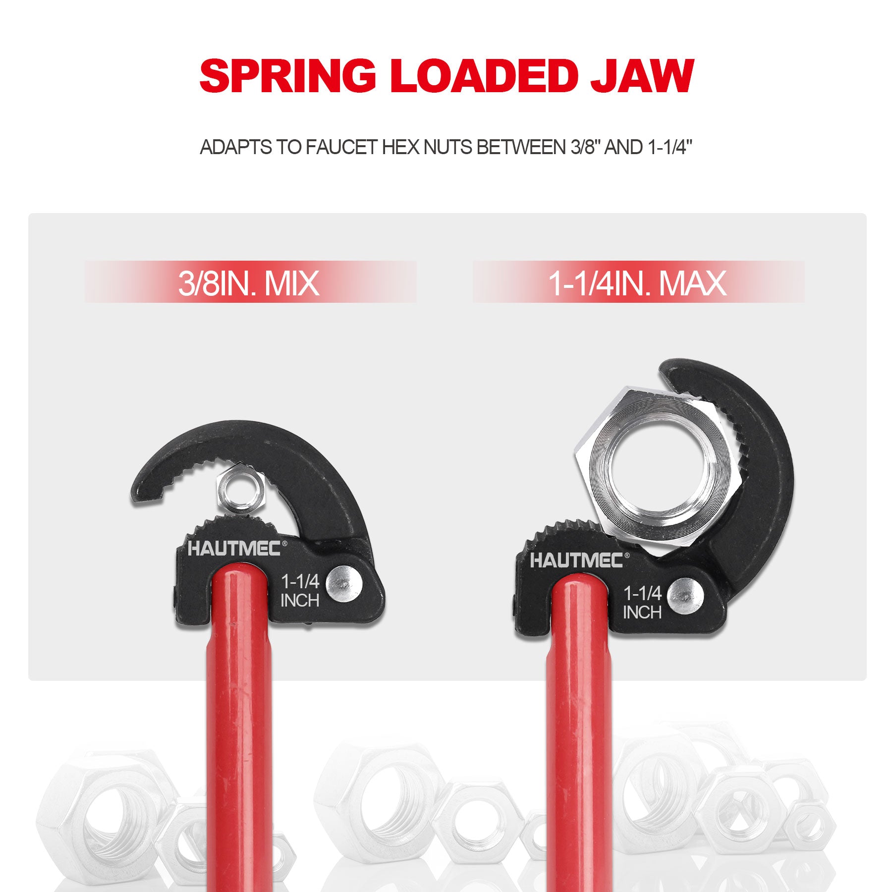 - ADJUSTABLE JAWS - The spring-loaded jaw is auto-adjusting for one-handed operation, adapting to 3/8 inch to 1-1/4 inch hex nuts of the faucets, fill valves, drain pipes and water supply lines