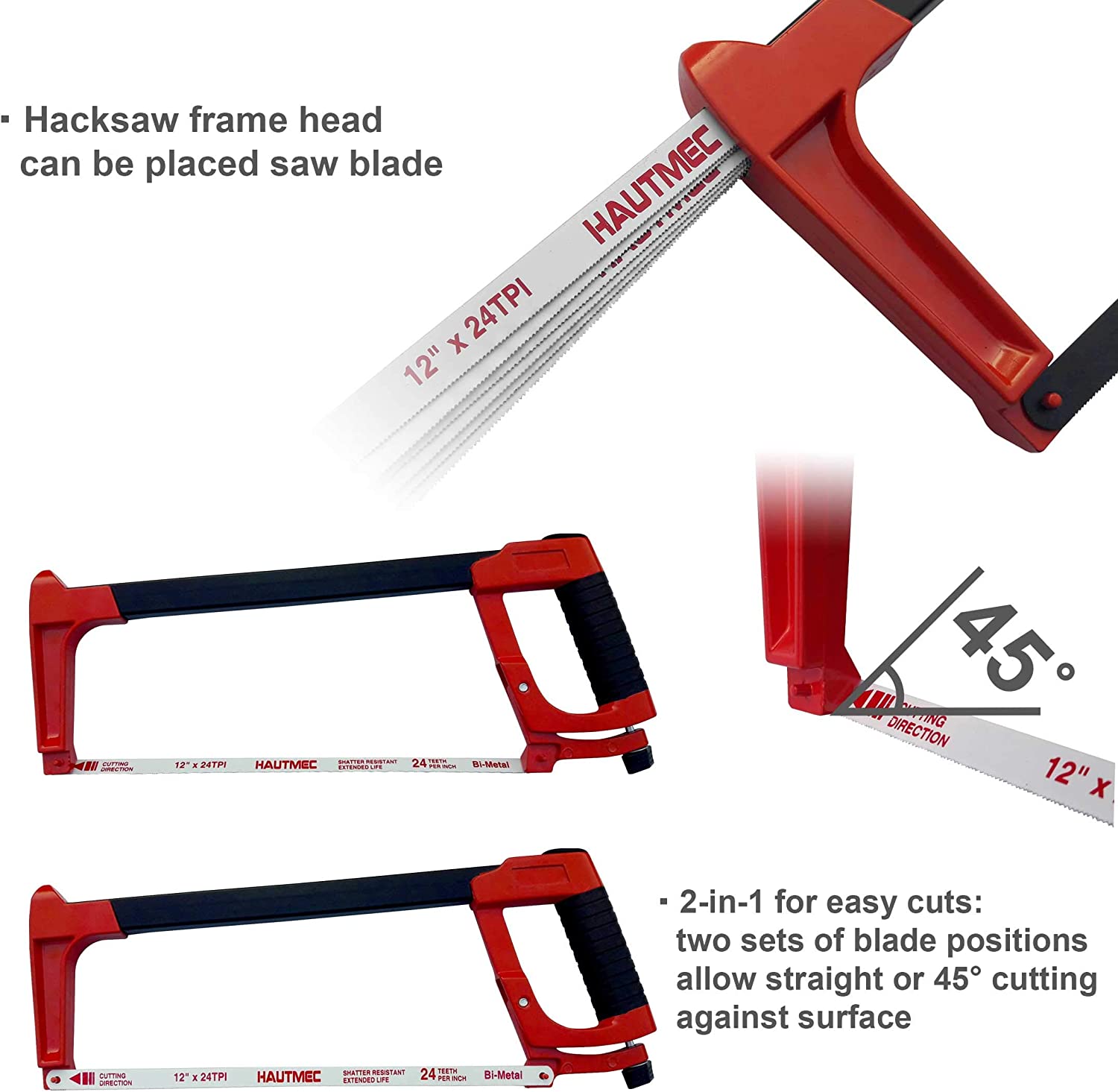 HAUTMEC 12 Inch Adjustable Hacksaw Frame With Blade Cabin, Heavy Duty 45°/90°2 Sawing Angles, 24 TPI High Tension Bi-metal HSS Blade, for Metal, Steel Pipe, PVC, Wood HT0015-CT
