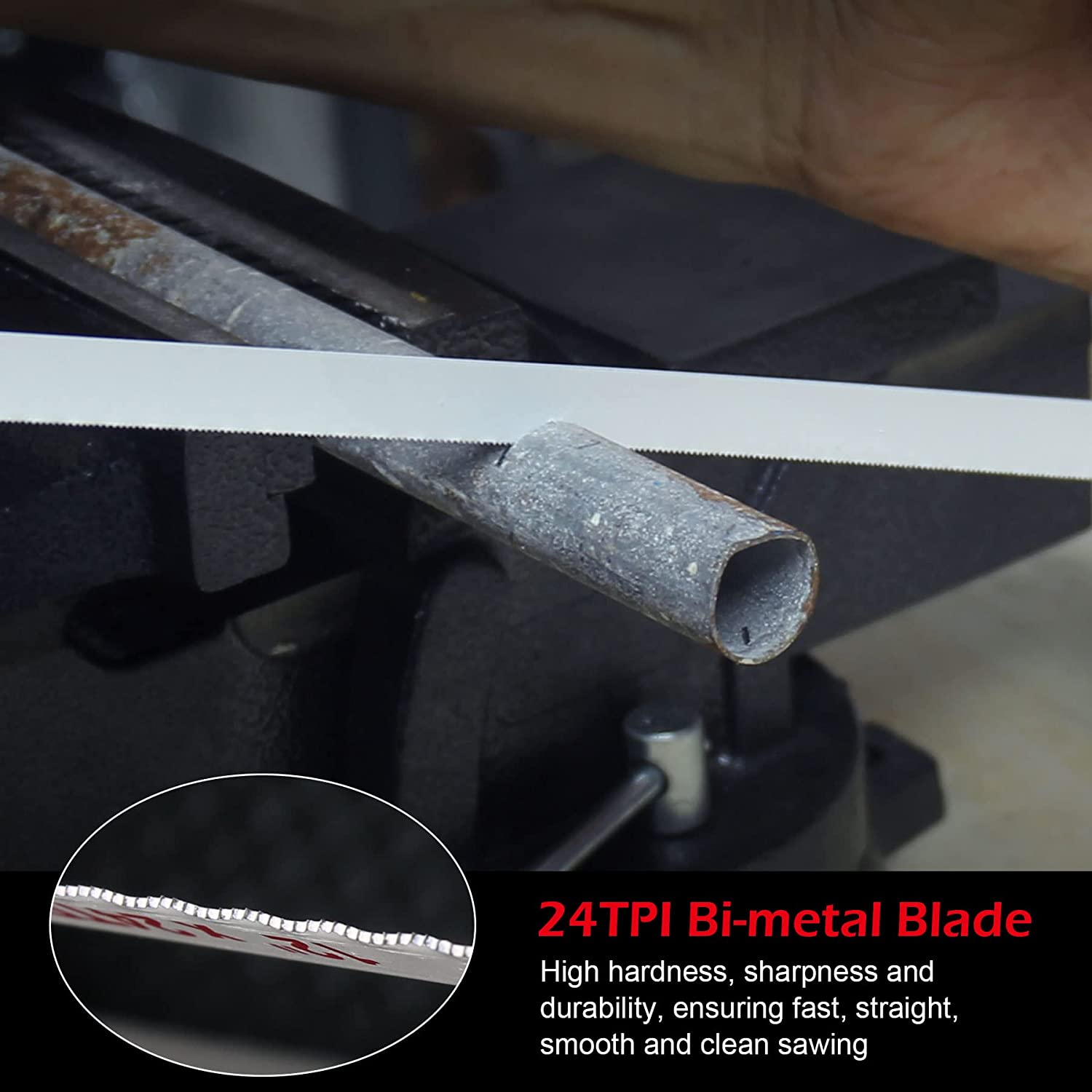 - STURDY CONSTRUCTION - Come with a high-quality blade(HSS Bi-metal 24TPI ) which boasts high hardness, sharpness and durability, ensuring fast, straight, smooth and clean sawing. Heavy-duty, lightweight, die-cast aluminum I-beam frame provides excellent strength and durability
