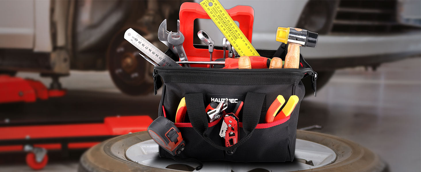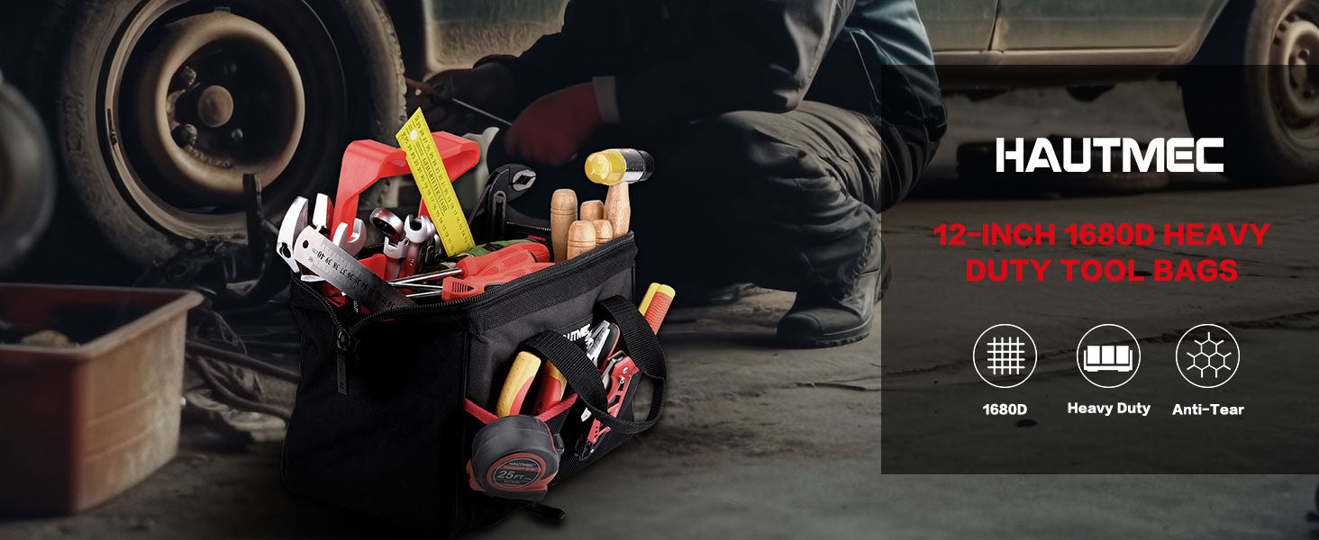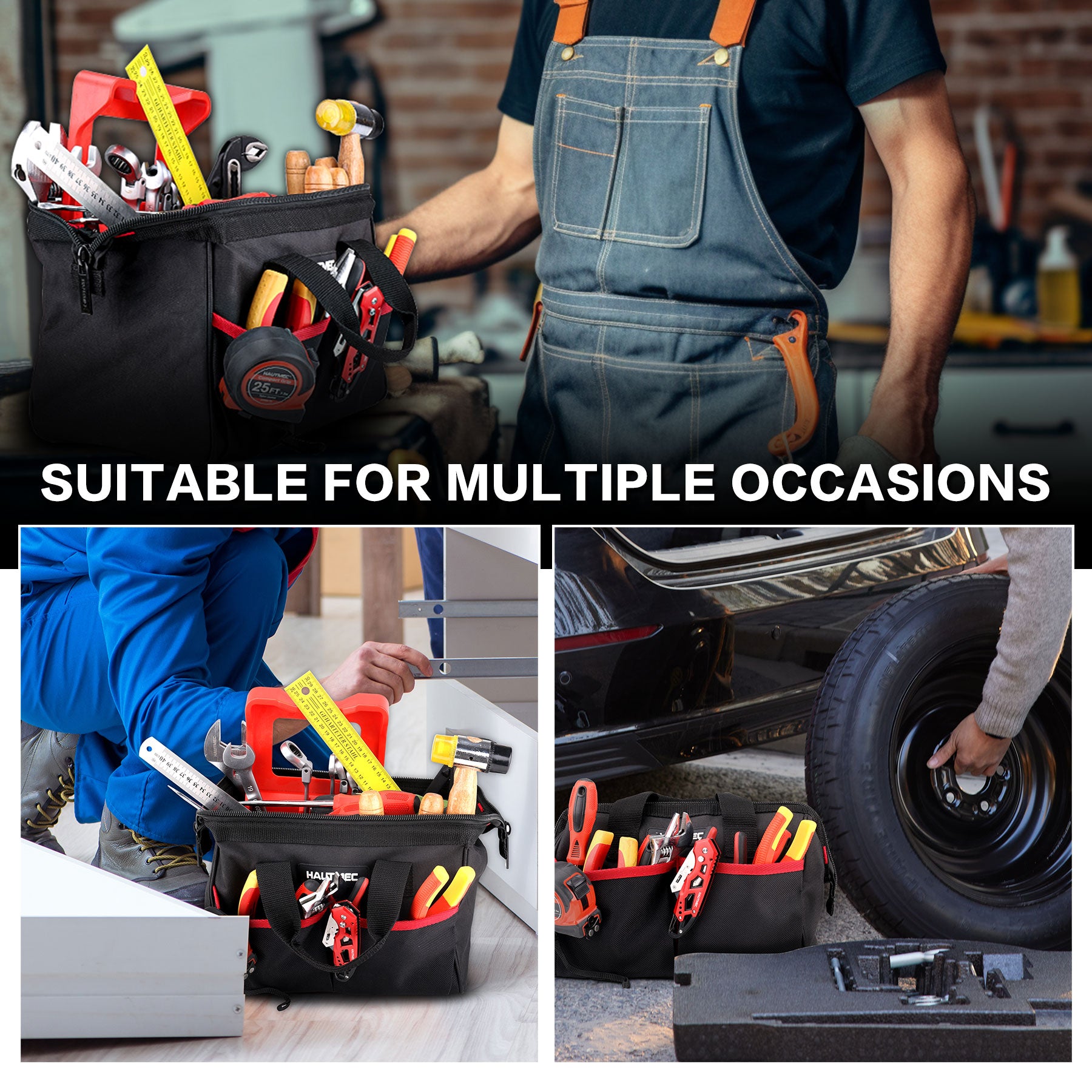 HAUTMEC 12 Inch Small Tool Bag, 1680D Wide Mouth Tool Box Organizer, Portable Utility Bag with Wear-Resistant Non-Slip Base and Double Zipper Design, HT0286
