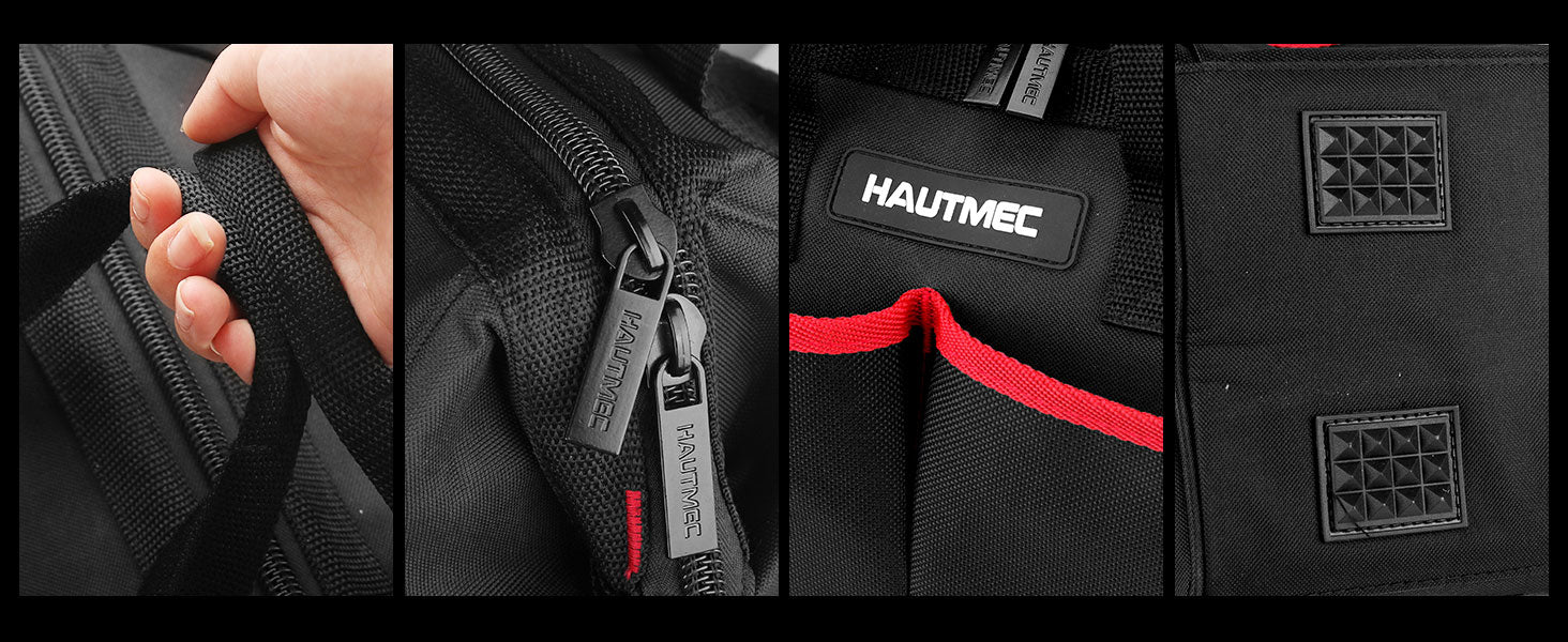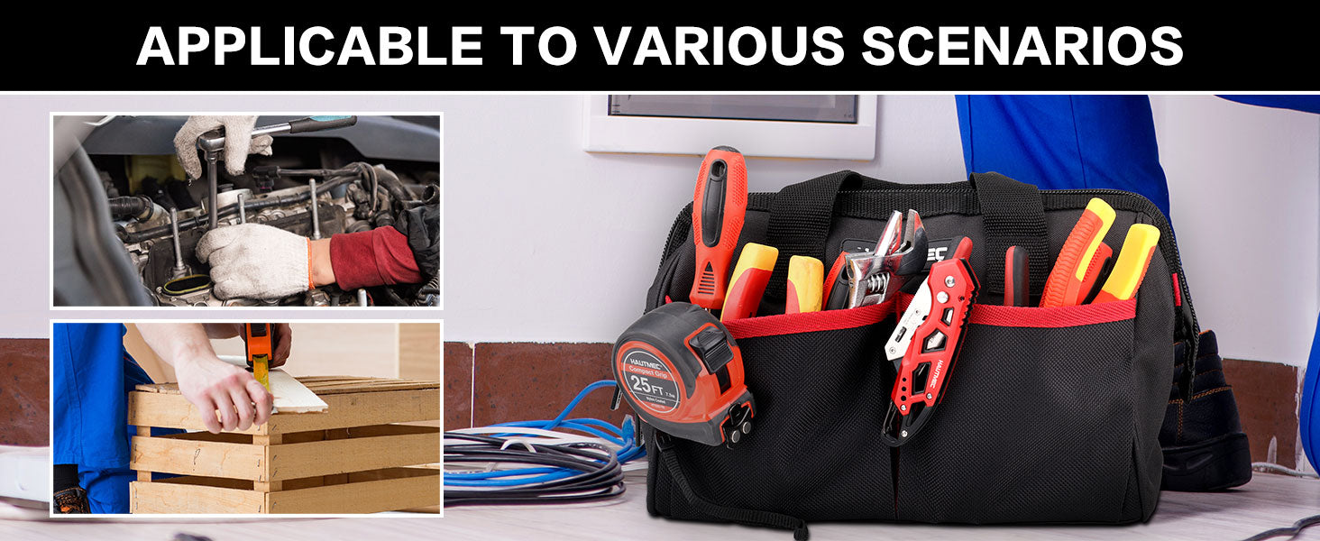 - Dual-zipper main compartment for storage of different sized items.Wide open mouth with an internal metal frame not only maintains the shape of the tools bag, but also allows quick access to the tool