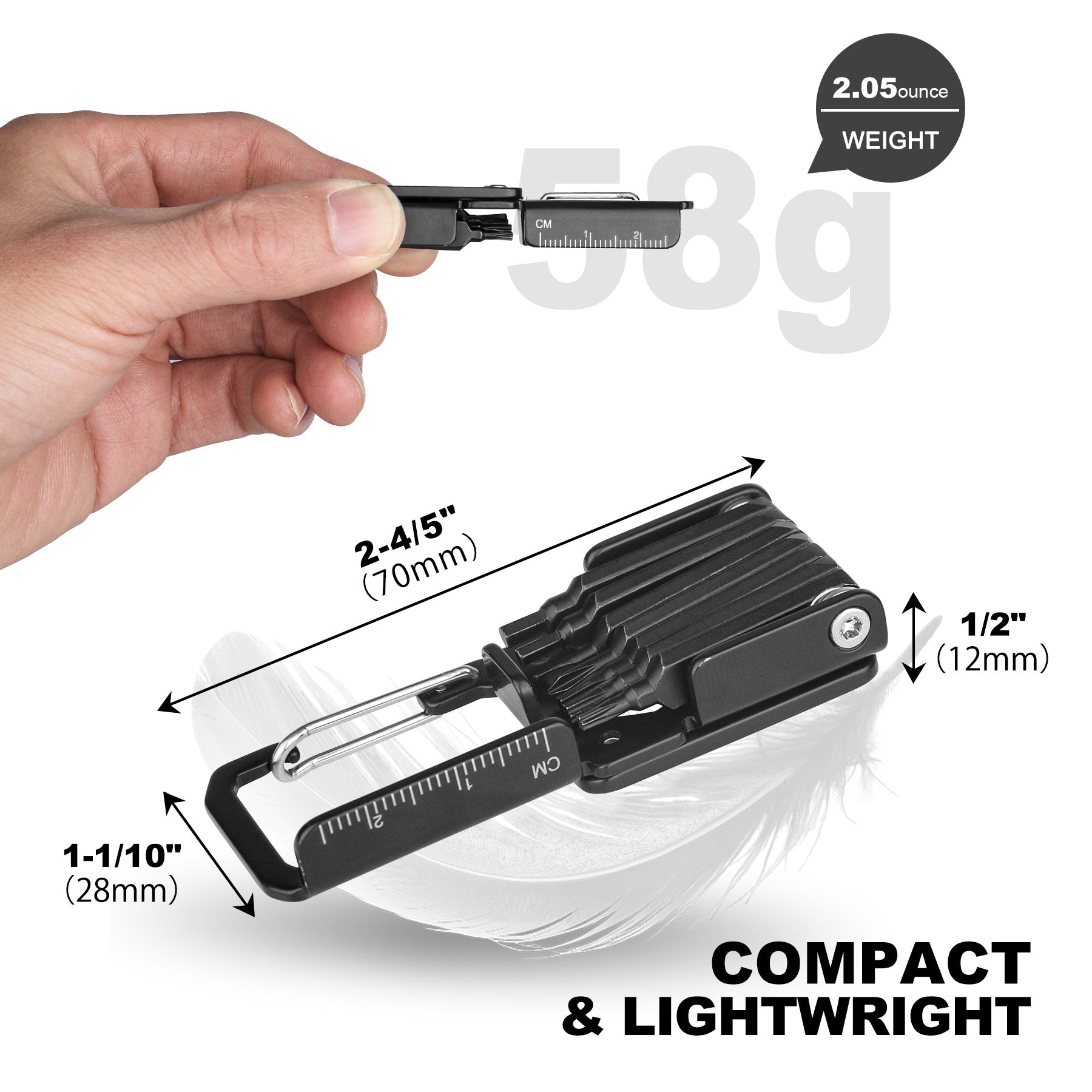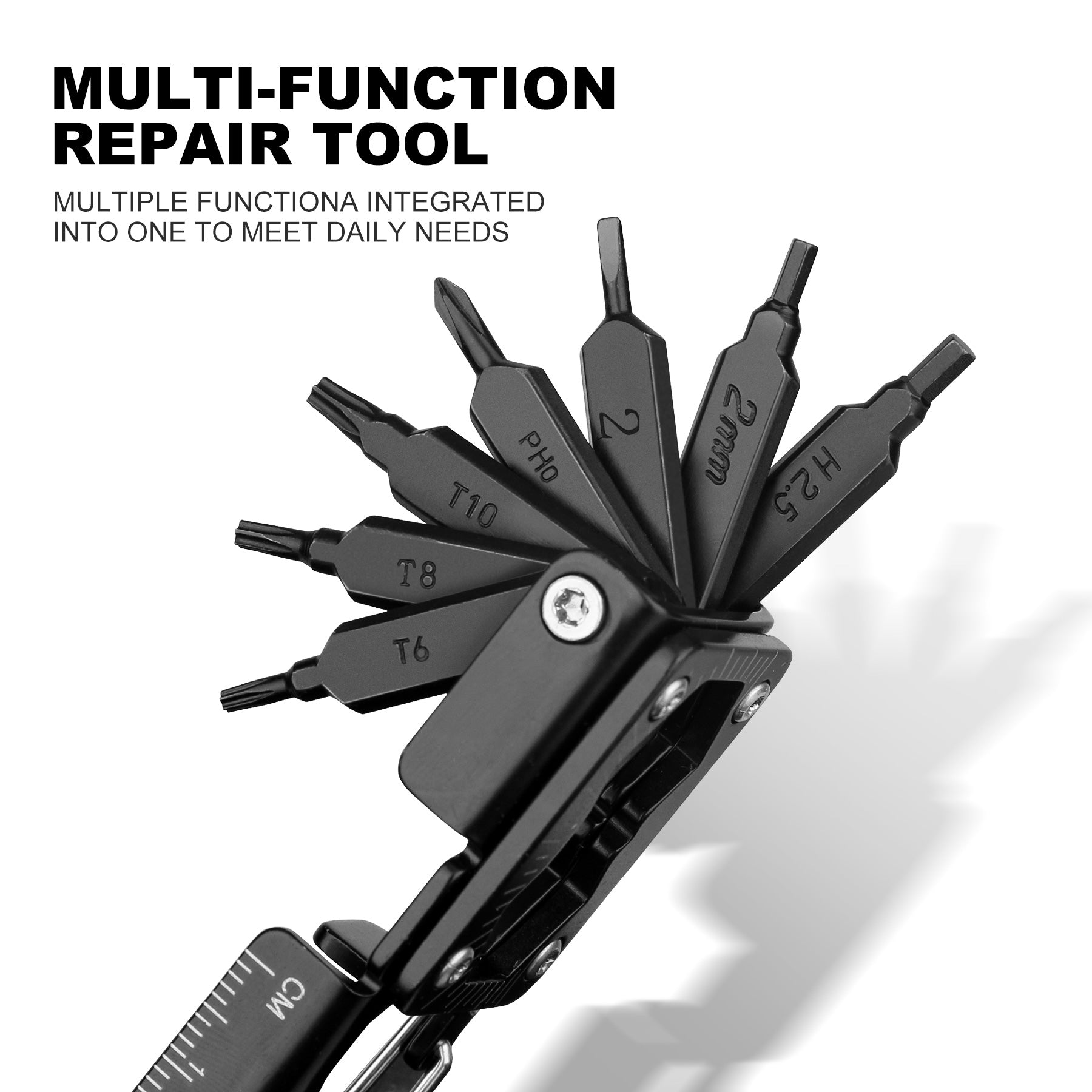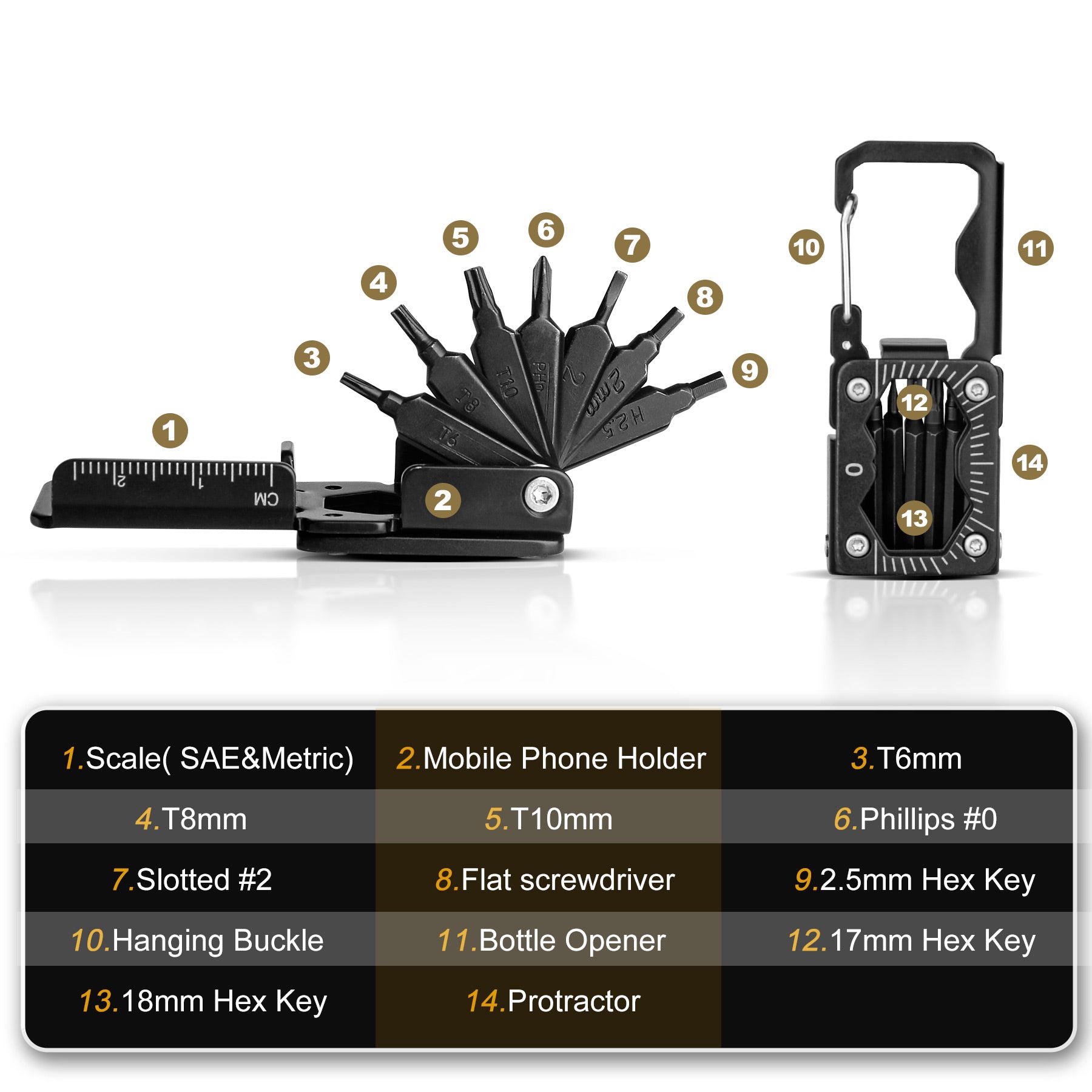- 【14 in 1 PRECISION TOOLS】The bike multi tool features ruler, mobile phone holder, T6/8/10mm wrenches, 2/2.5mm hexagon wrench, flat screwdriver, phillips screwdriver, hanging buckle, bottle opener, 17/18mm hexagon wrench, protractor, suitable for a wide range of needs.