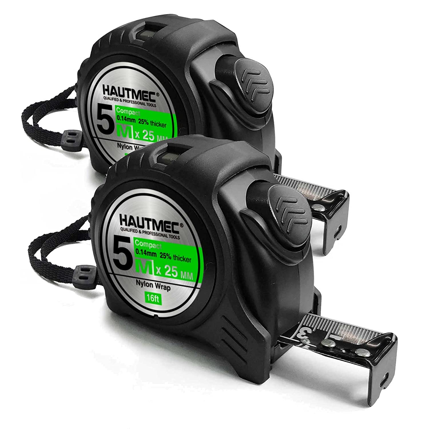 HAUTMEC 16 Ft (5m) Heavy Duty AutoLock Black Tape Measure, Self-Lock, 1" Wide Black Rigid Blade, Dual Sided Rule Print 2 Pack, HT0100-2PC
