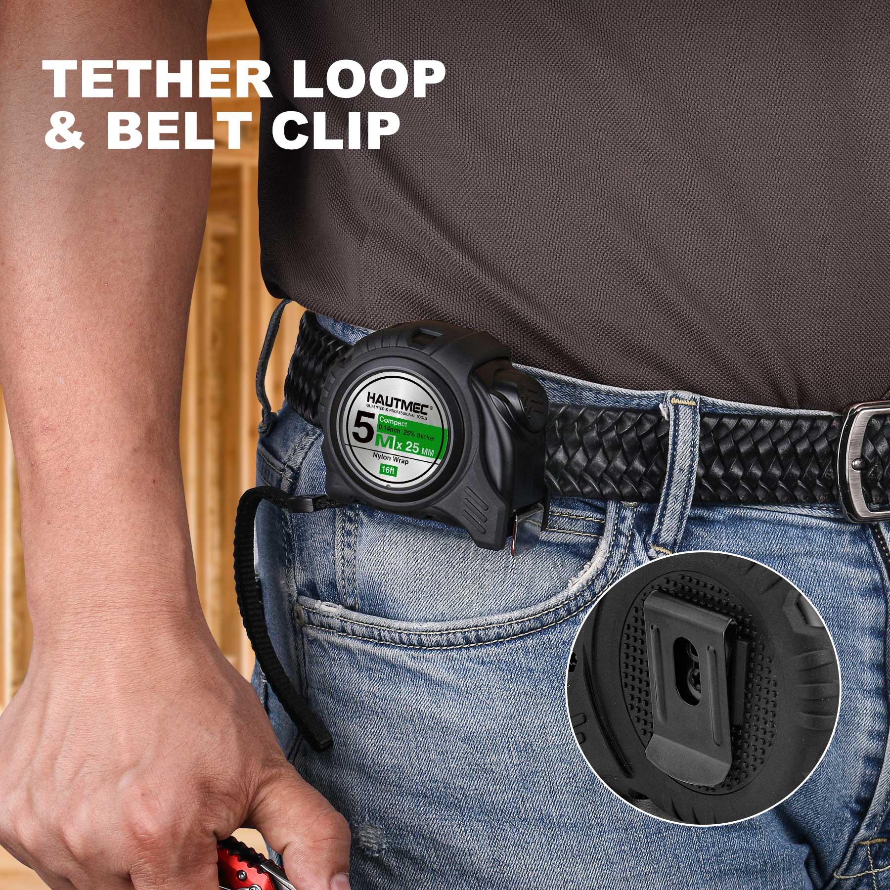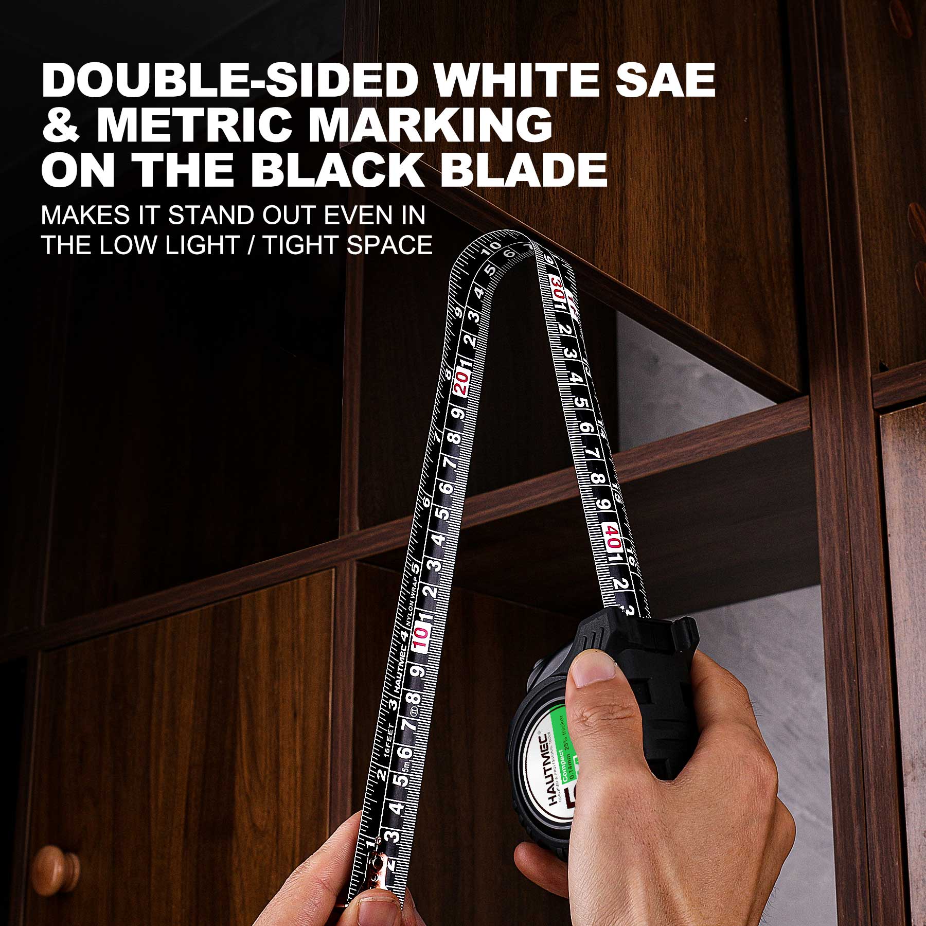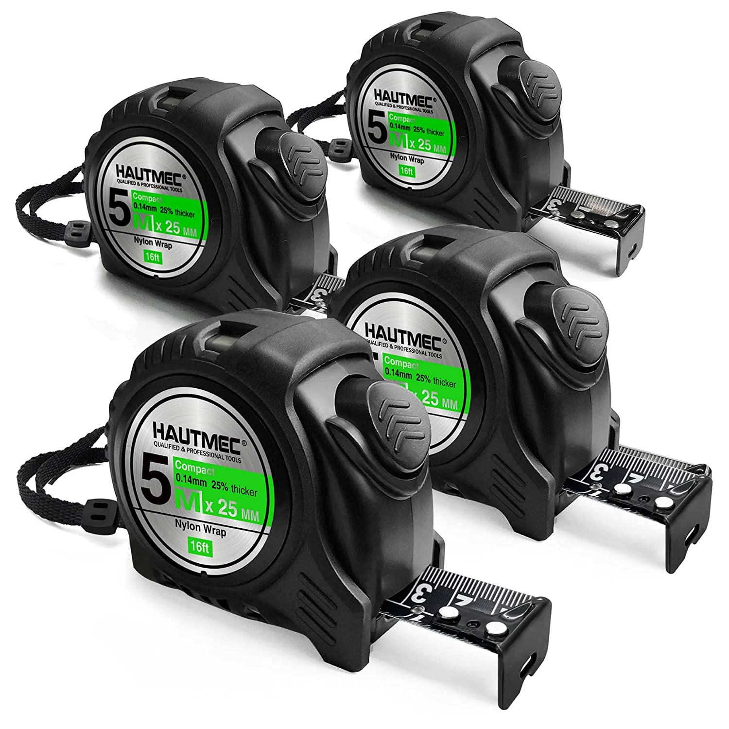 HAUTMEC 16 Ft (5m) Heavy Duty AutoLock Black Tape Measure, Self-Lock, 1" Wide Black Rigid Blade, Dual Sided Rule Print 4 Pack, HT0100-4PC