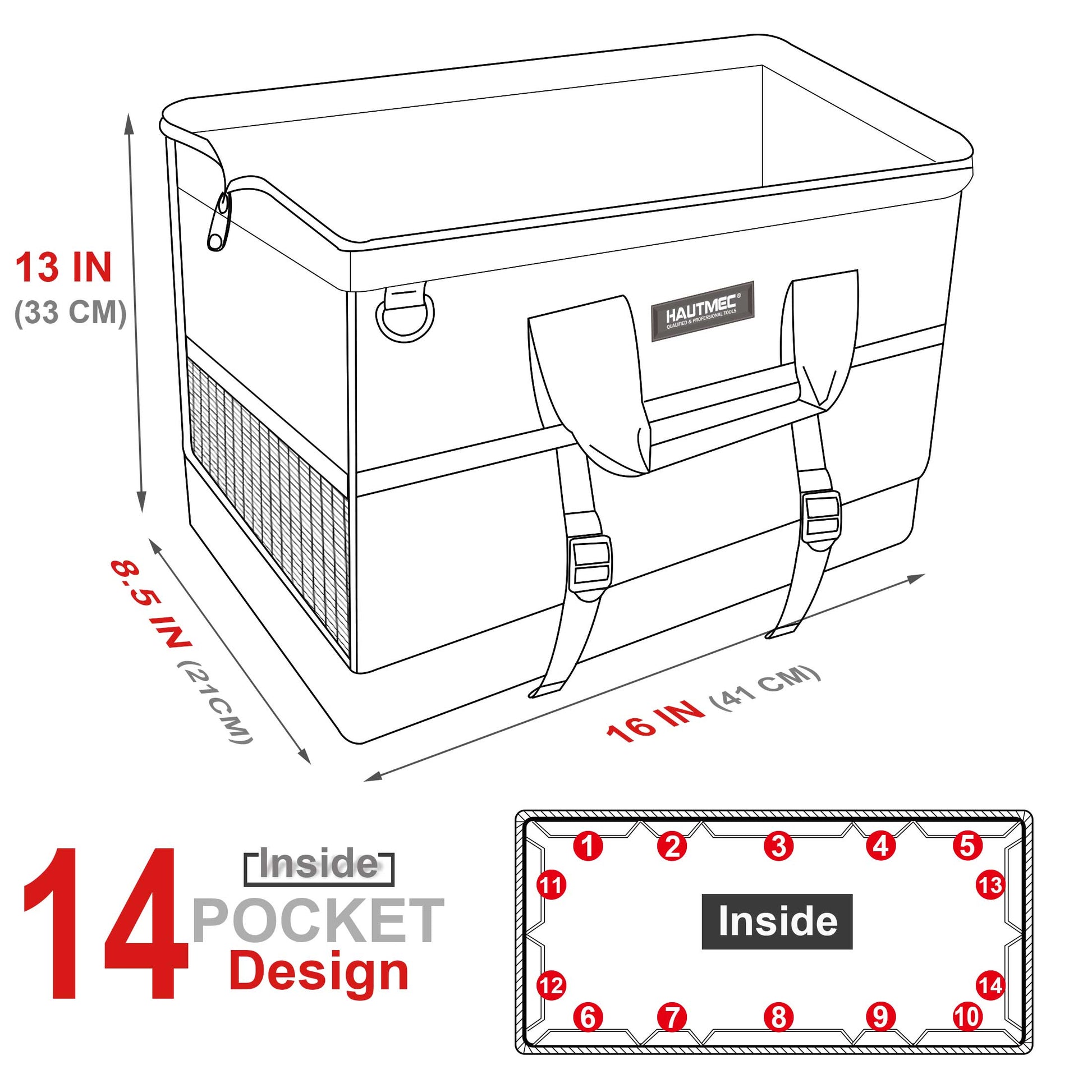 - Organizer Tool Bag: Wide open mouth design with 15 sturdy pockets inside, 8 exterior pockets and a large interior main loading room for quick find and organize your wrenches, screwdrivers, pliers, and other utility accessories items. Size:16” x 13” x 8.5”.