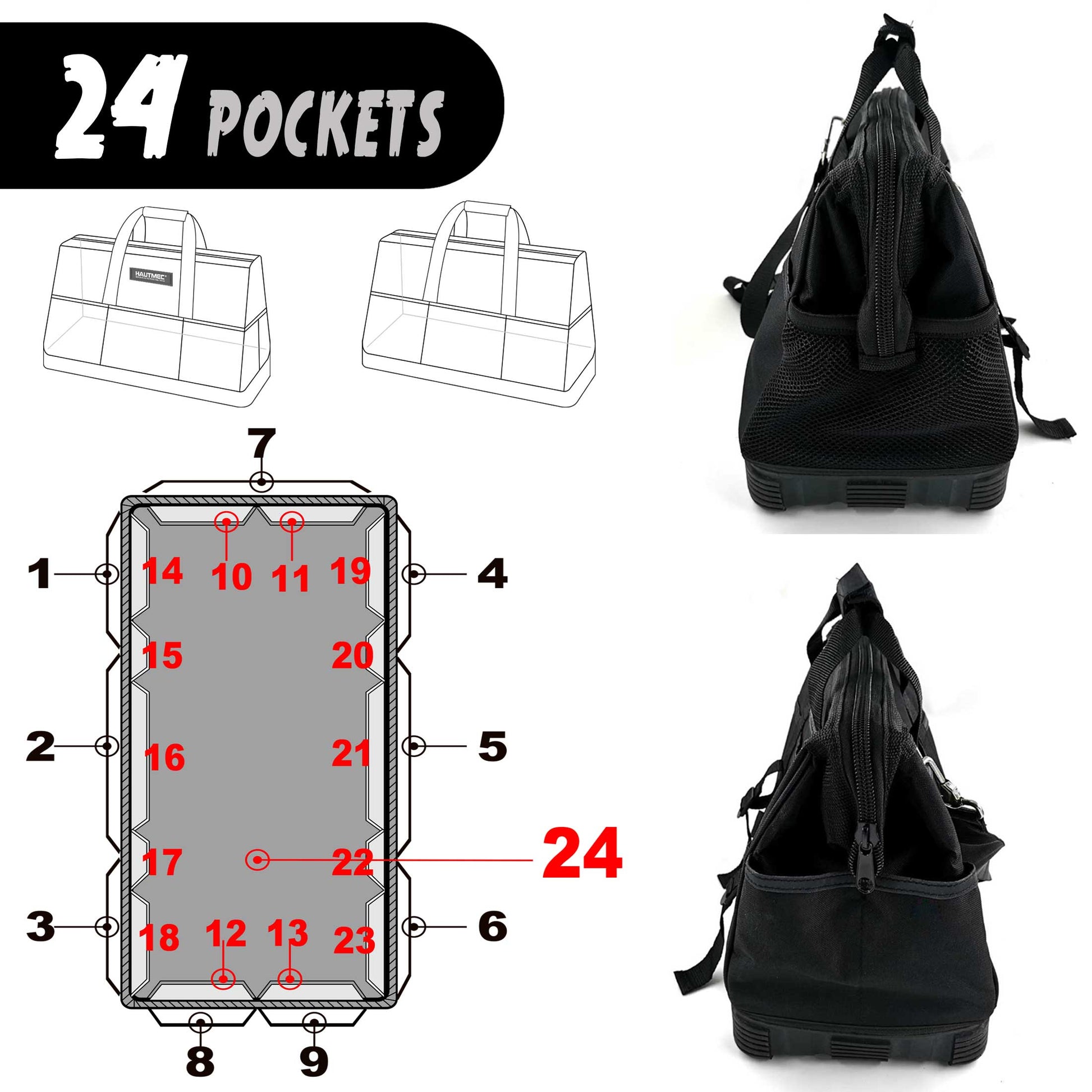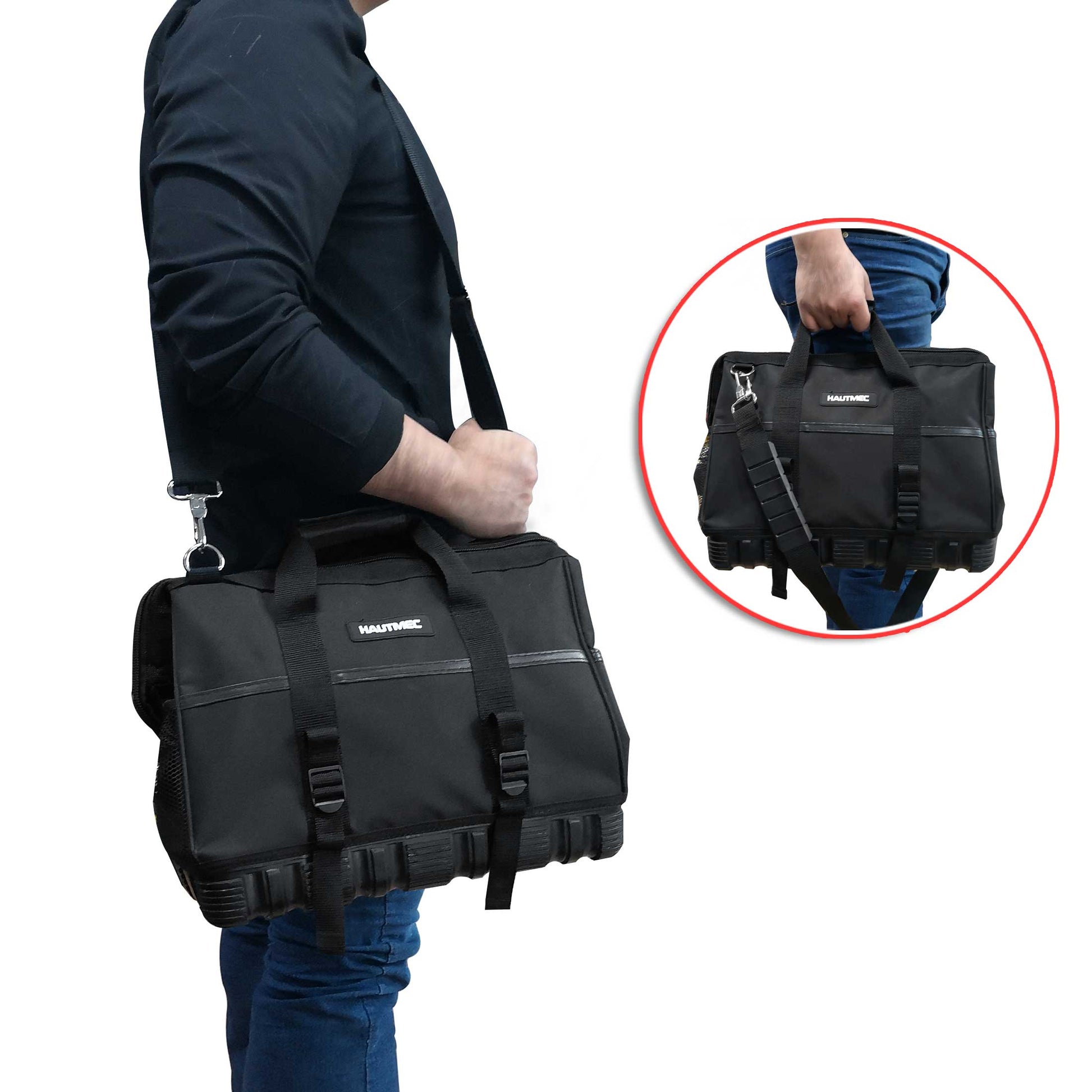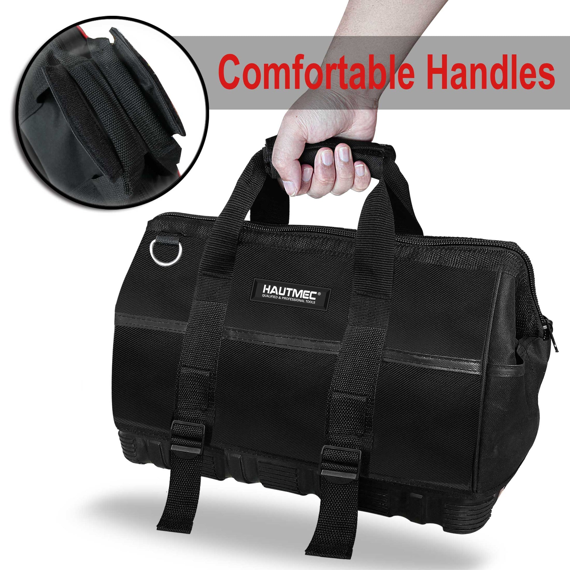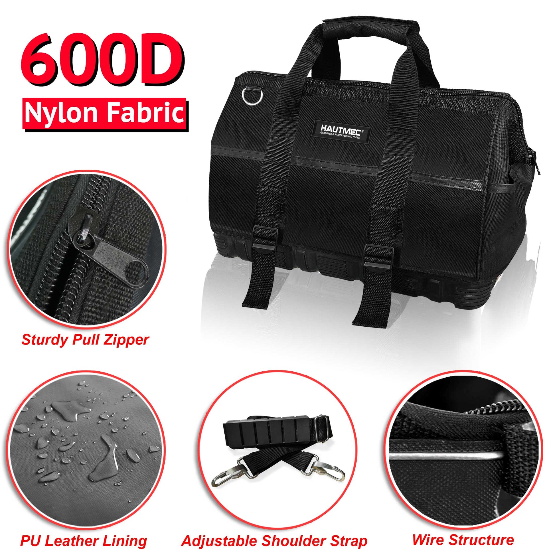 HAUTMEC 16-inch Heavy Duty Wide Open Mouth Tool Bag, Shoulder Organizer Bag with Water-Proof Molded Base, Double 600D Fabric, Black, HT0096