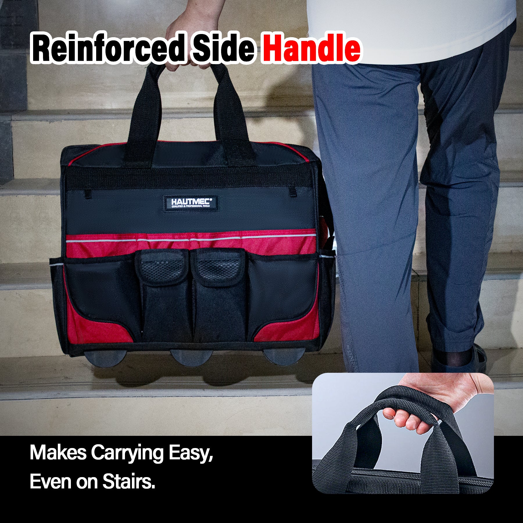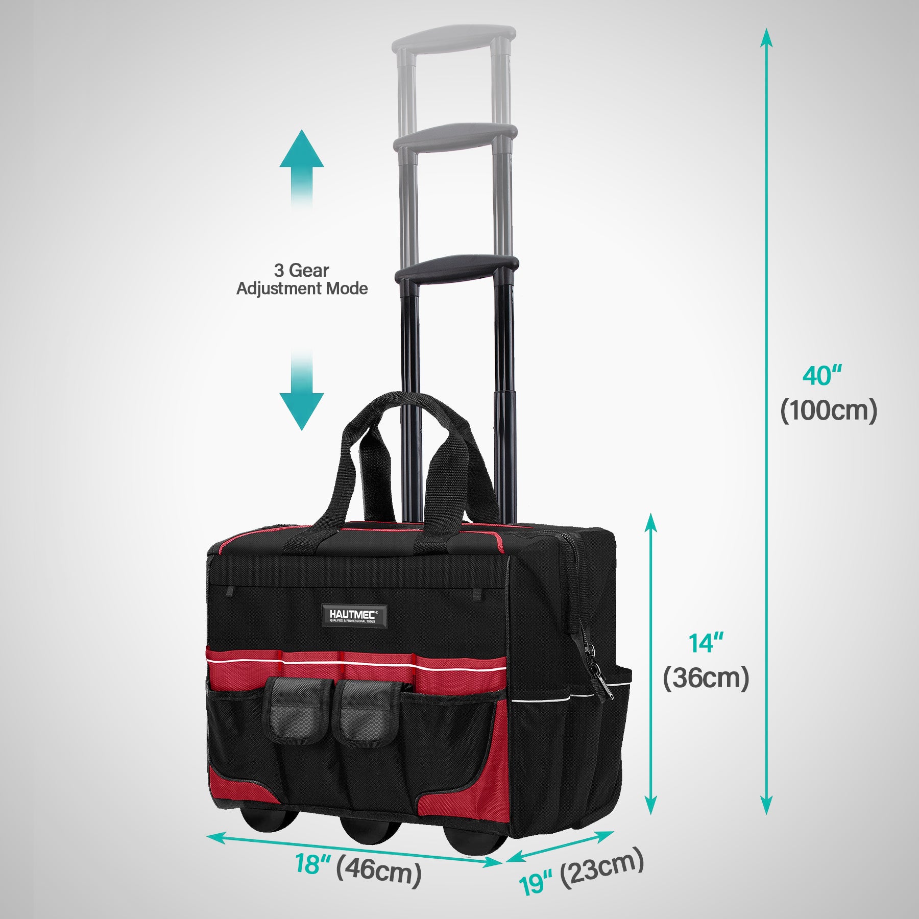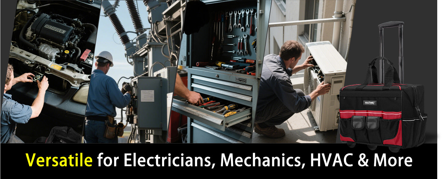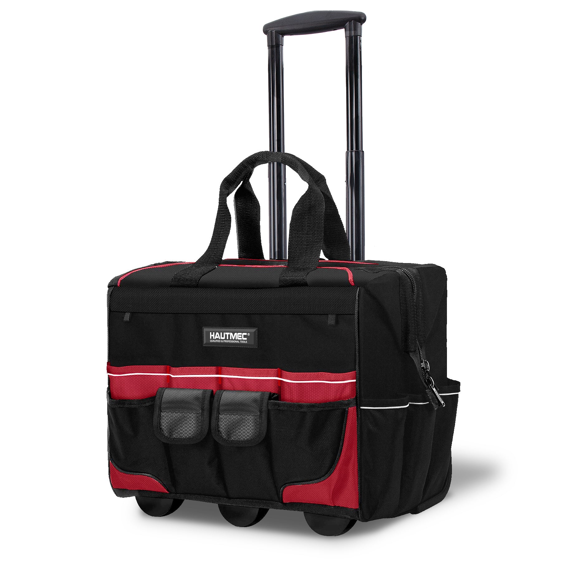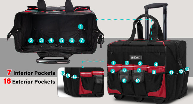 HAUTMEC 18" Rolling Tool Bag with Wheels, 23-Pocket Portable Tool Box Organizer with 600D Water-Resistant Fabric, Wide-Mouth Design, Oversized Wheels & Telescoping Handle - HT0059