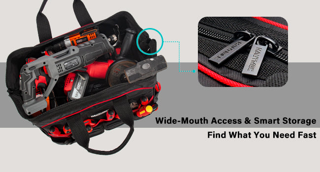 - 【Wide-Opening & Upright Structure】The rugged construction with a rivet-reinforced base keeps the bag upright and the wide-mouth opening provides easy access and a clear view of all your tools