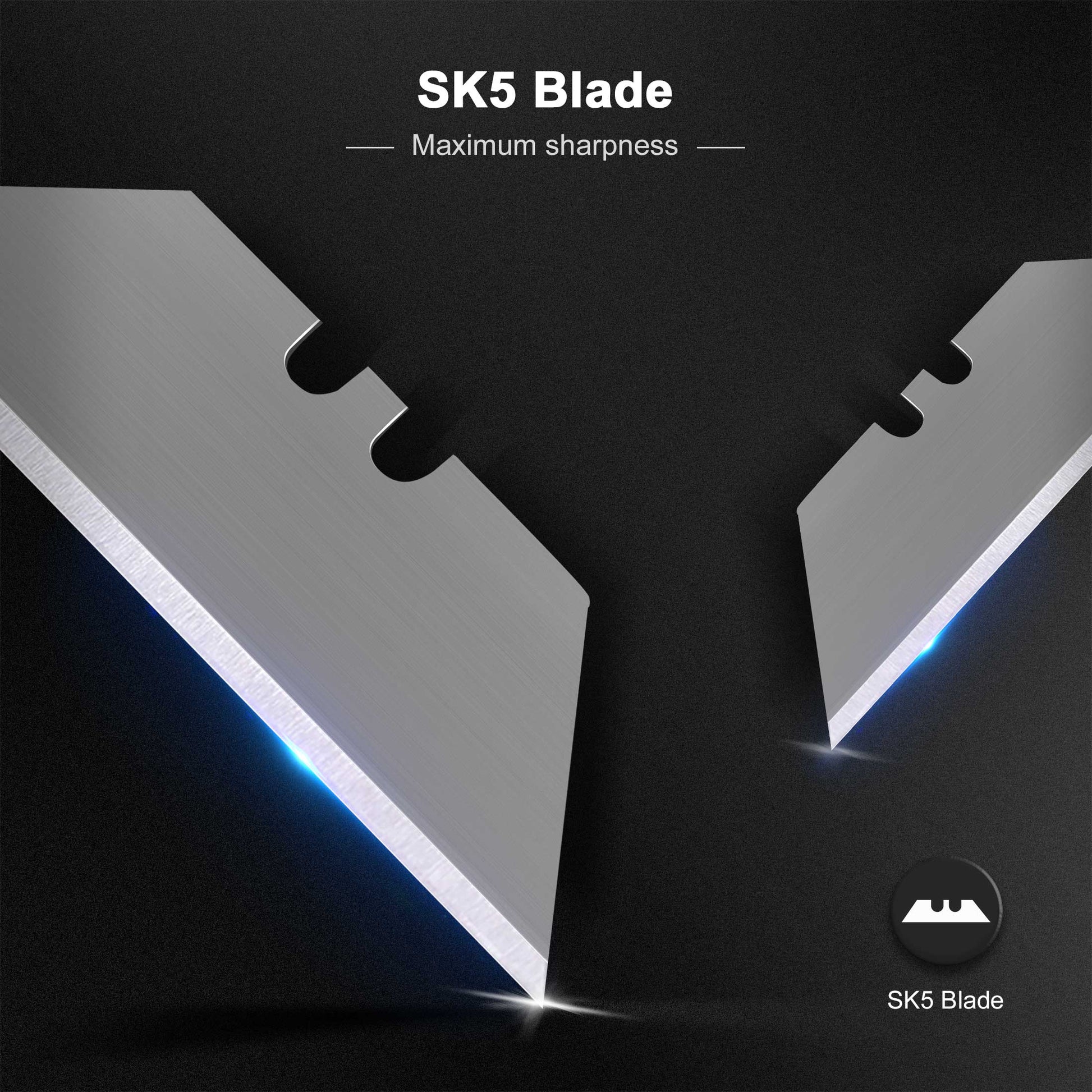 - 【Premium Quality】Blades play a vital role in knives. This knife comes with a SK5 blade which is greater in edge retention, hardness, sharpness and durability. It ensures the blade can easily cut through a variety of materials like drywall, cardboard, cartons, leather, carpets and more