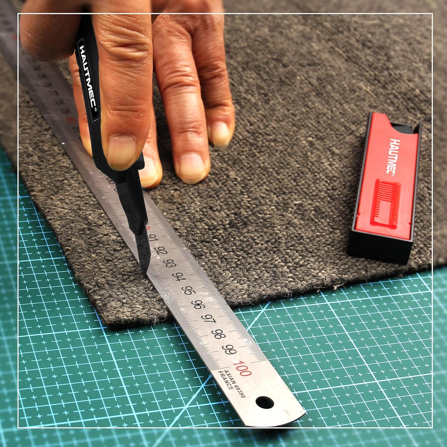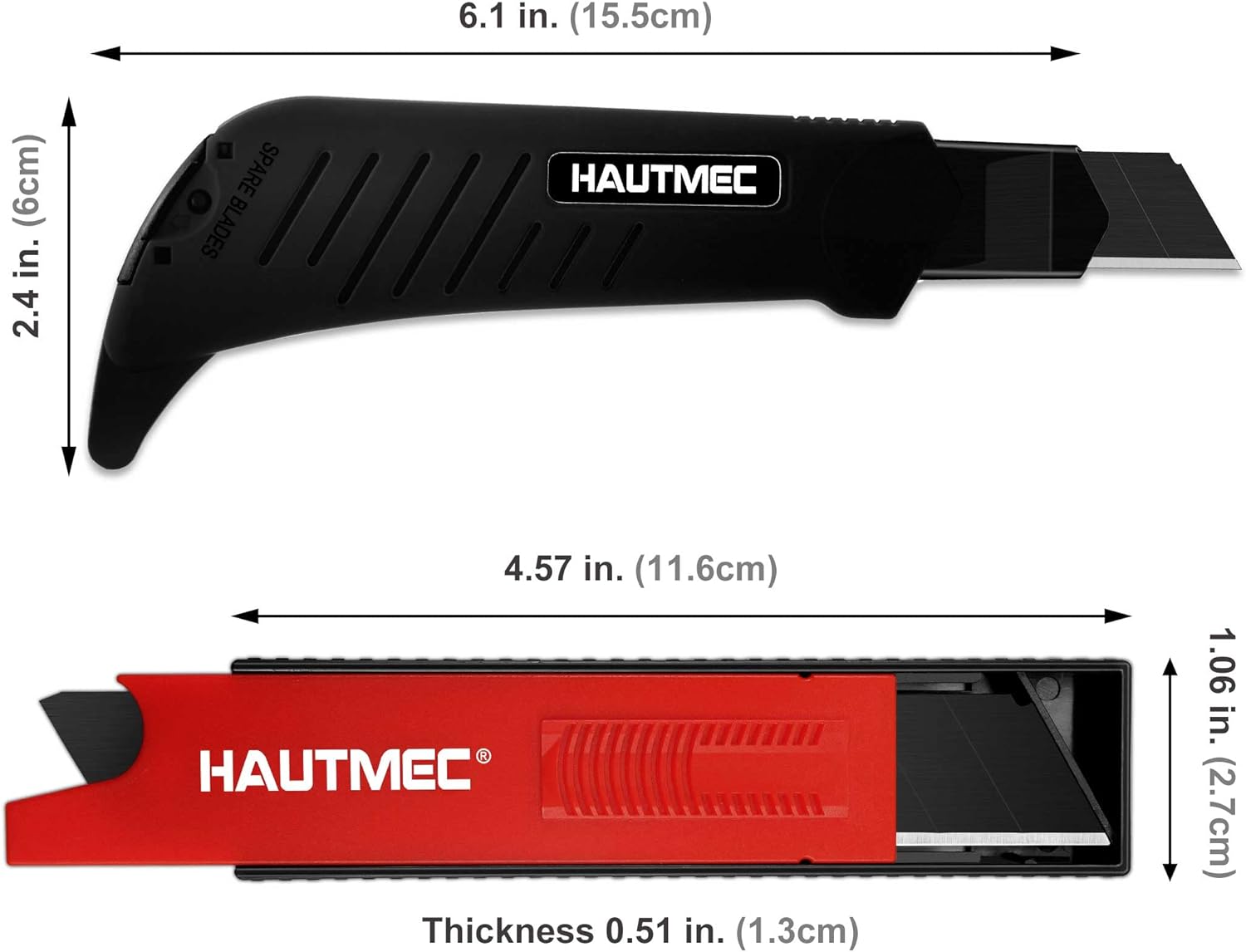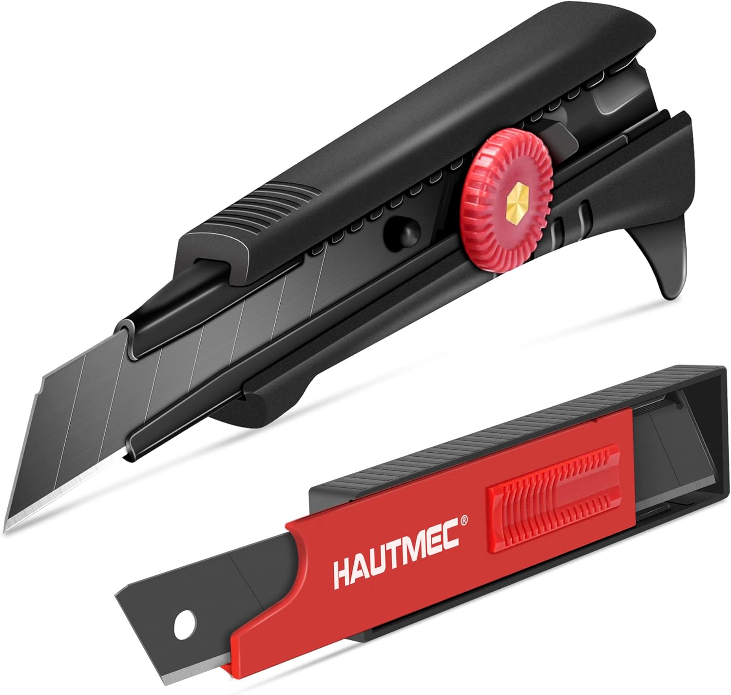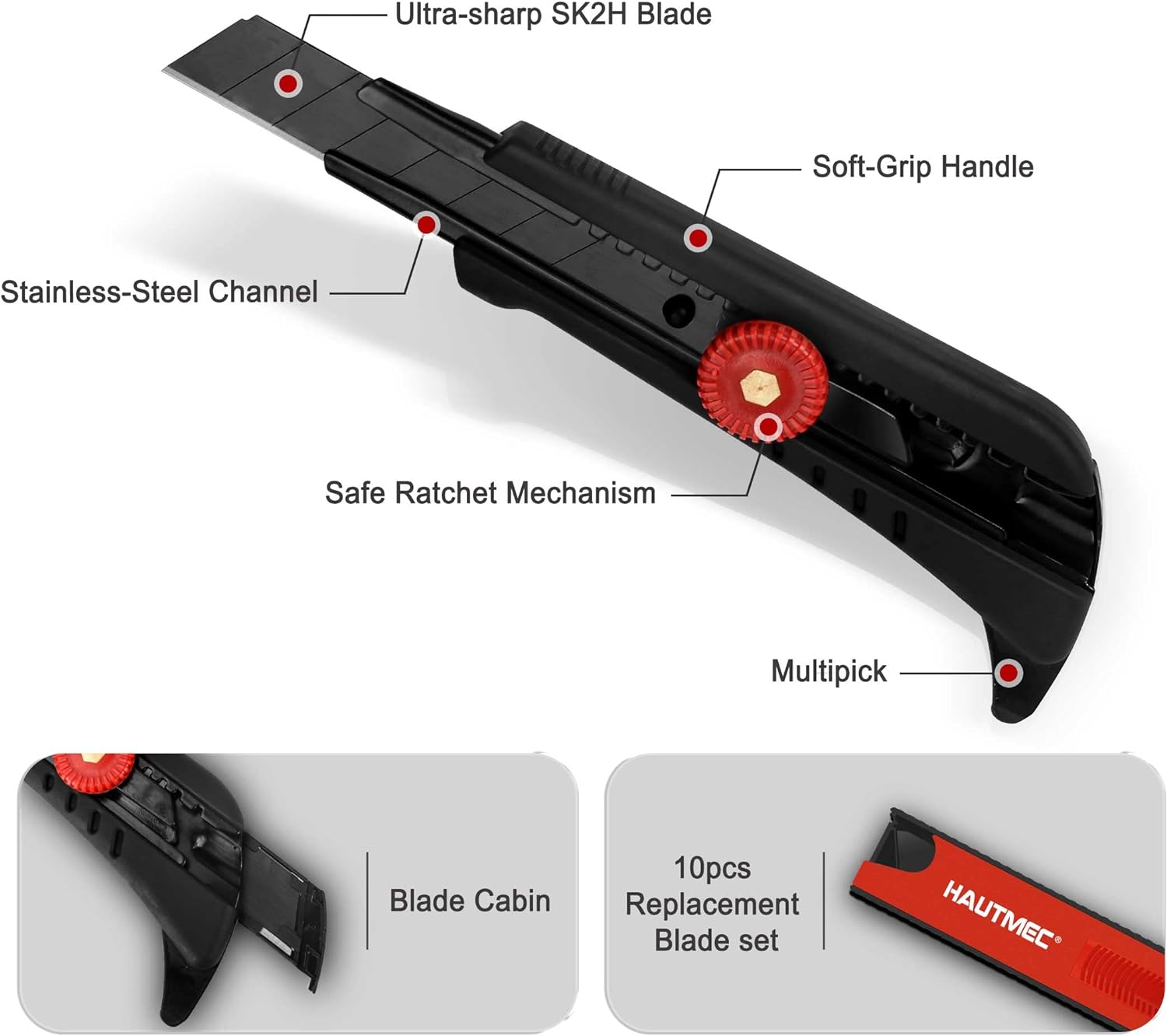 HAUTMEC 18mm Heavy Duty Utility Knife with Multi-Pick and 10pcs Blade set, Snap Off Ultra-Sharp Black Retractable Box Cutter, Ratchet & Soft-grip Cutter HT0249-KN