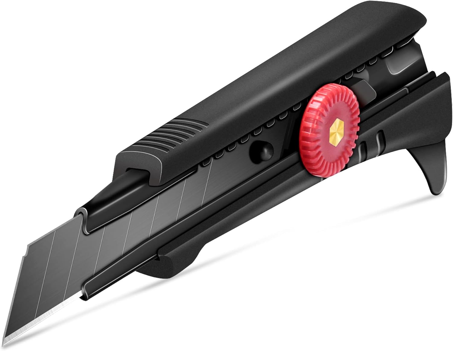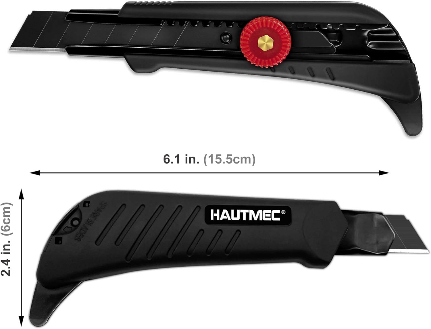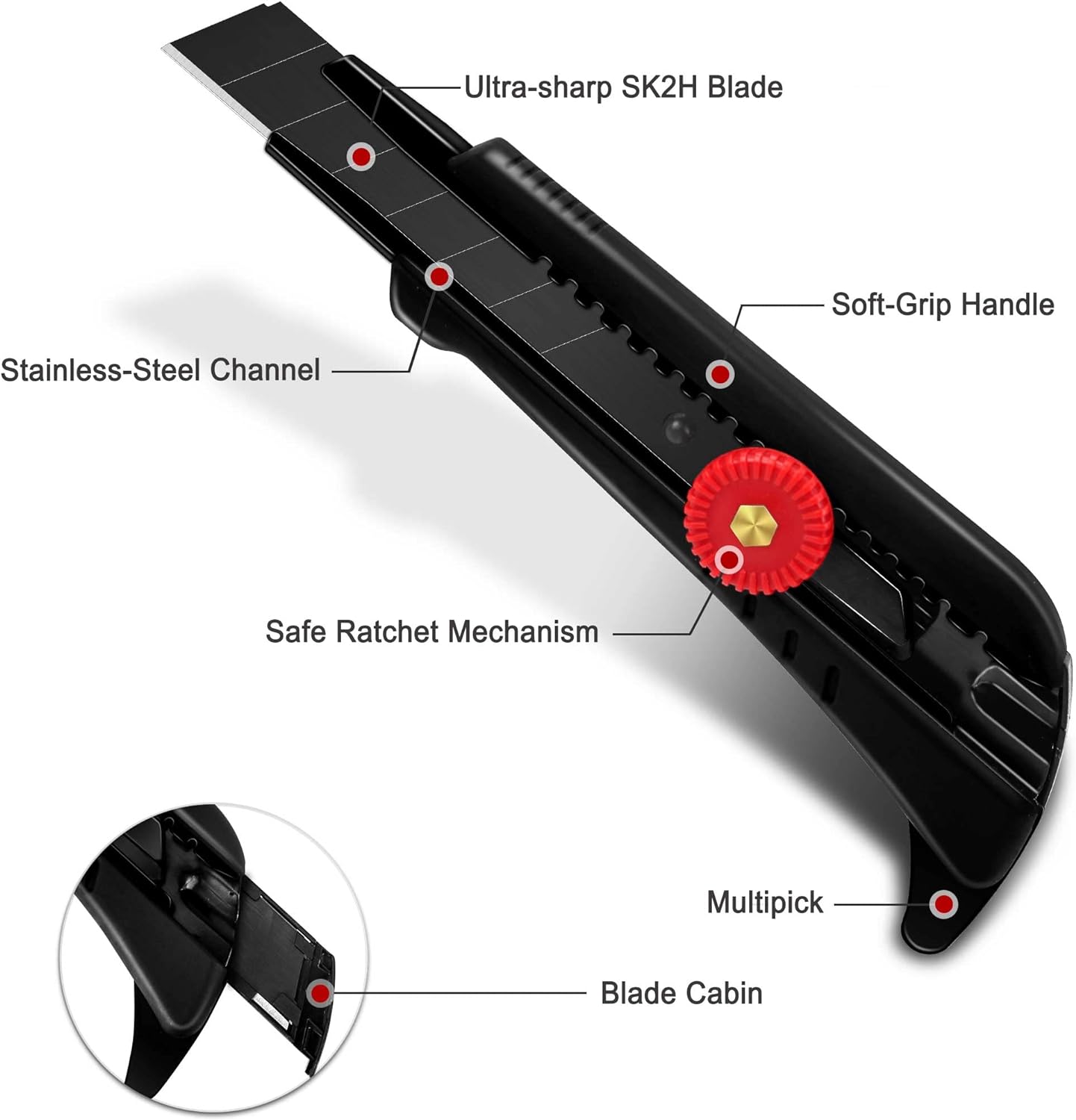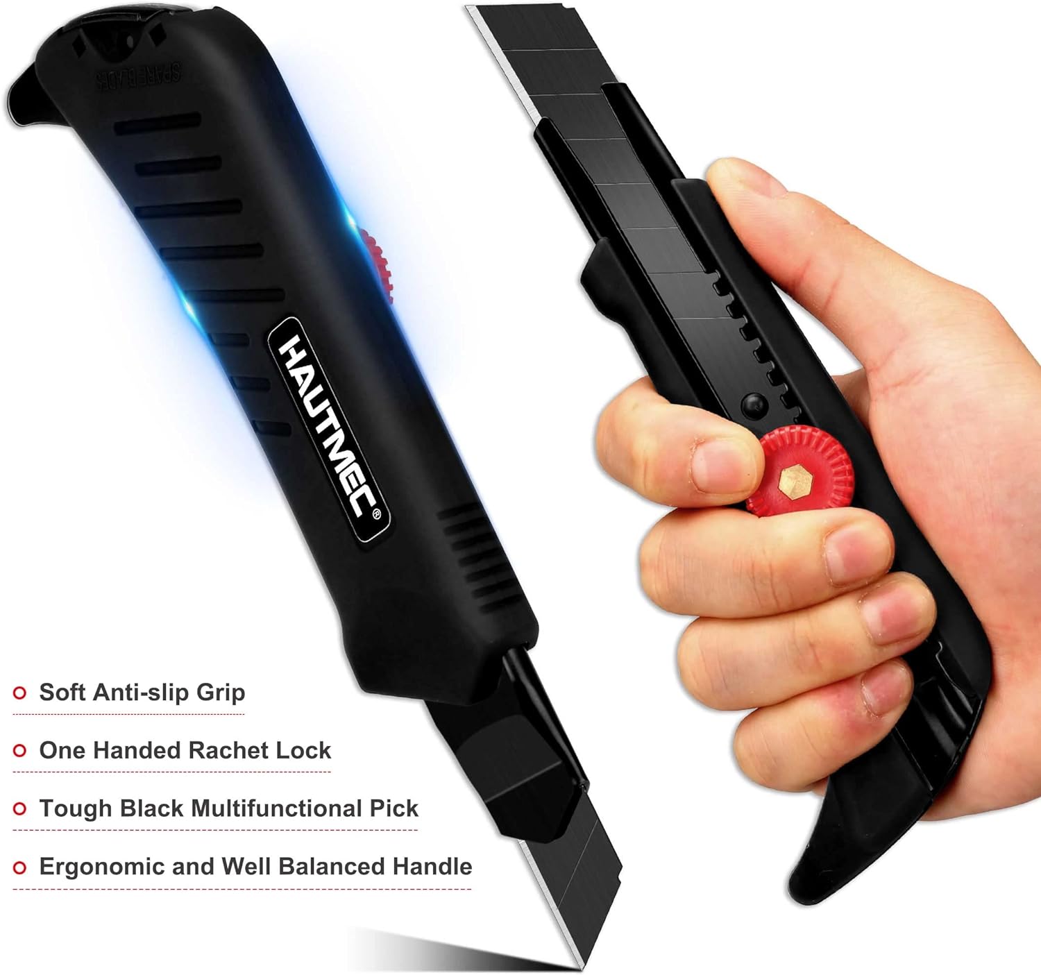 HAUTMEC 18mm Heavy Duty Utility Knife with Multi-Pick, Snap Off Ultra-Sharp Black Retractable Box Cutter, Ratchet & Soft-grip Cutter HT0248-KN