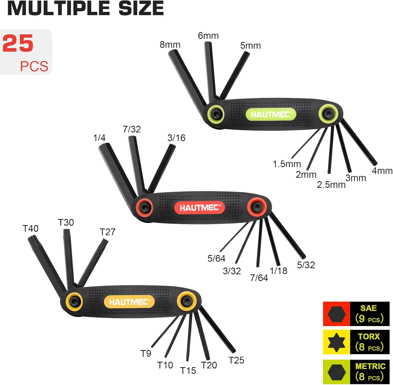 - 25 PCS Multiple Size: The 3-pack allan wrench sets comprises an 9-piece SAE set : 5/64", 3/32", 7/64", 1/8", 9/64", 5/32", 3/16", 7/32", 1/4"; an 8-piece METRIC allen wrench set : 1.5mm, 2mm, 2.5mm, 3mm, 4mm; 5mm, 6mm, 8mm; an 8-piece TORX wrench set : T9, T10, T15, T20, T25, T-27, T30 ,T40. With this kind of range of sizes you will have a hard time finding a job you can't tackle.