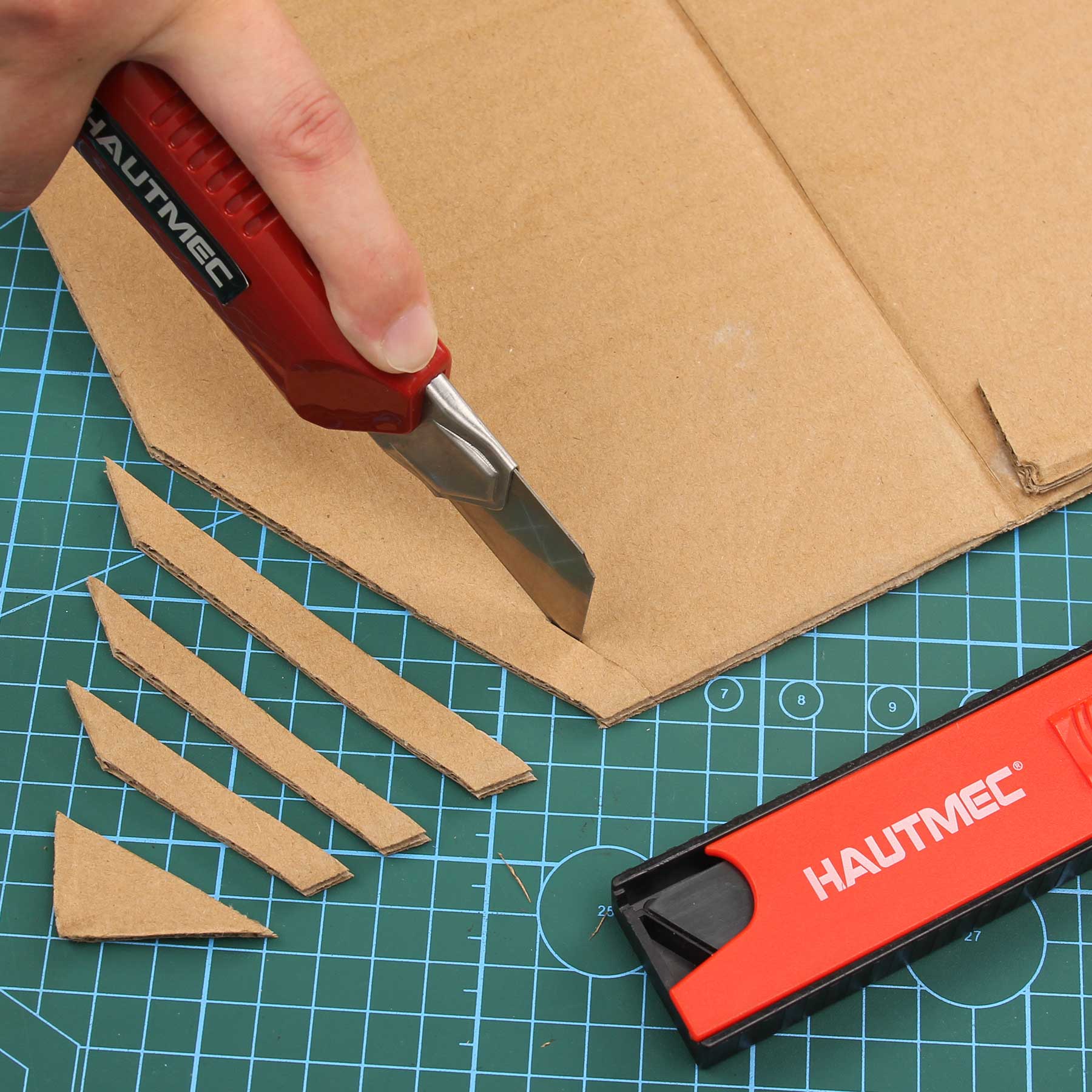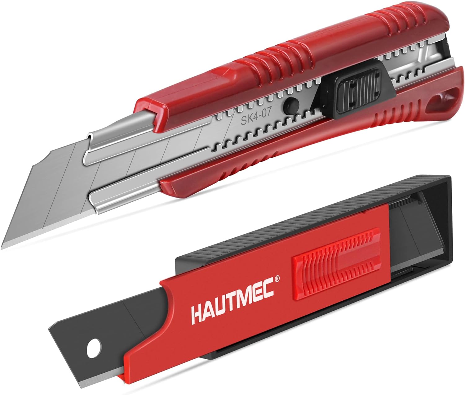 - 【Extra Heavy Duty Knife】HAUTMEC 25mm Extra Heavy-Duty Utility Knife will satisfy your heavy-duty job site expectations. It has durable thick blades which cut through hard materials easily. With its sturdy handle, you are free from worries caused by accidental dropping and pounding. The blade is secured in stainless steel channel which provides a strong support for the blade to cut. Strengthened box for the 10pcs blades facilitates safe storage and avoids outside damage to the blades
