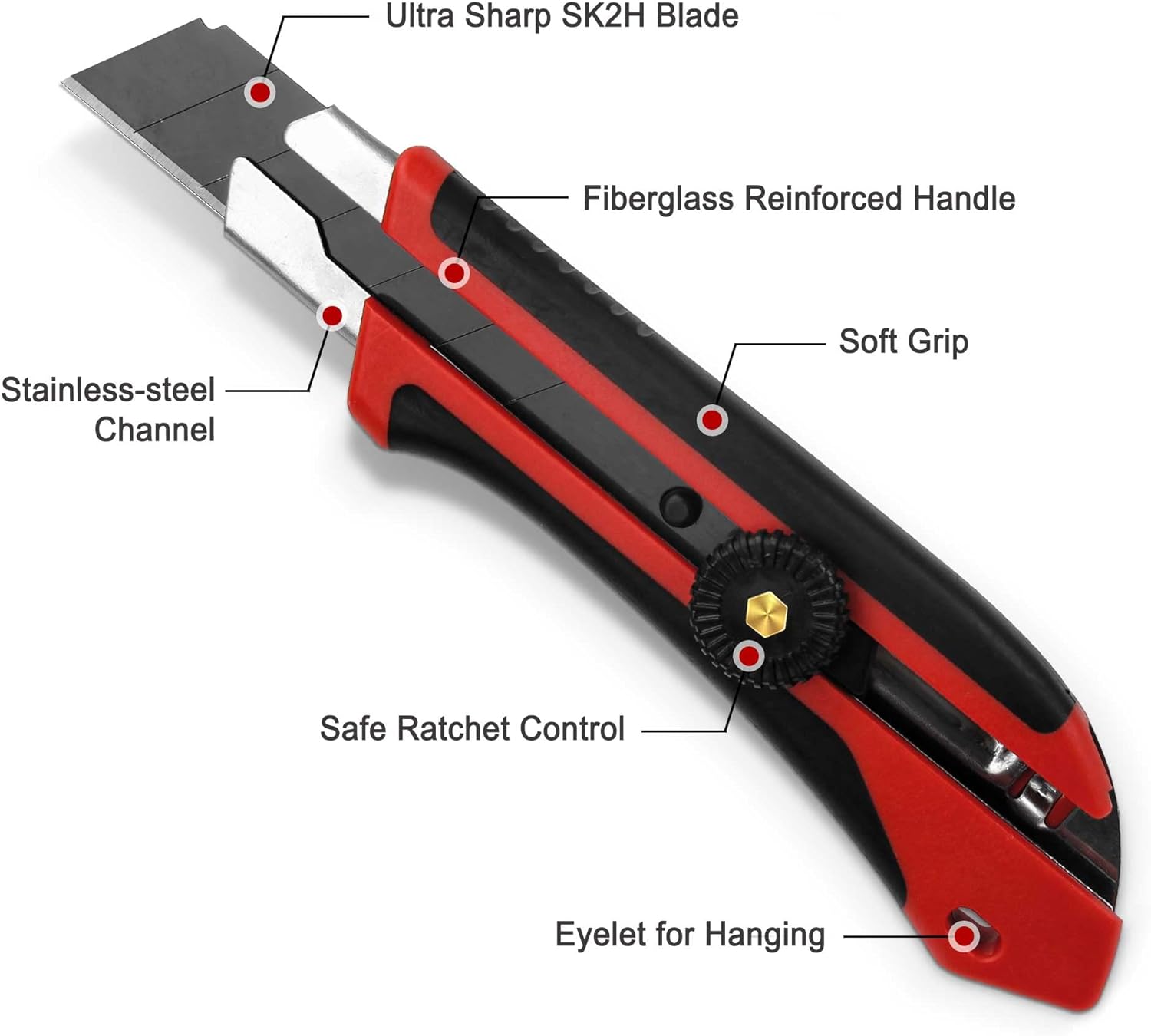 - ULTRA SHARP 25mm BLADE - The strong 0.7mm-thick SK2H black blades are designed with upgraded tech and have better sharpness, edge retention and durability, effectively cutting through a variety of materials like drywall, cardboard, cartons, leather, carpets and more