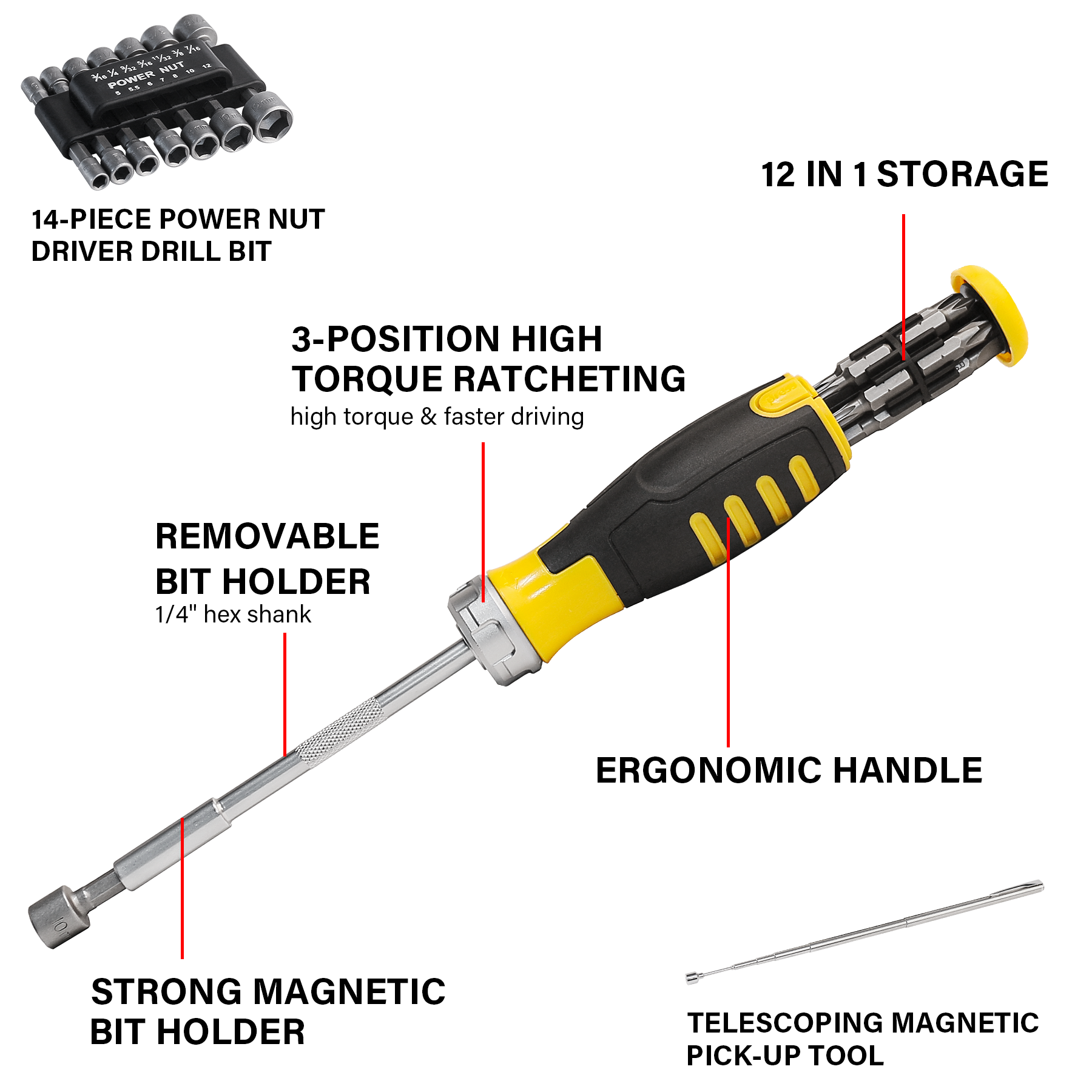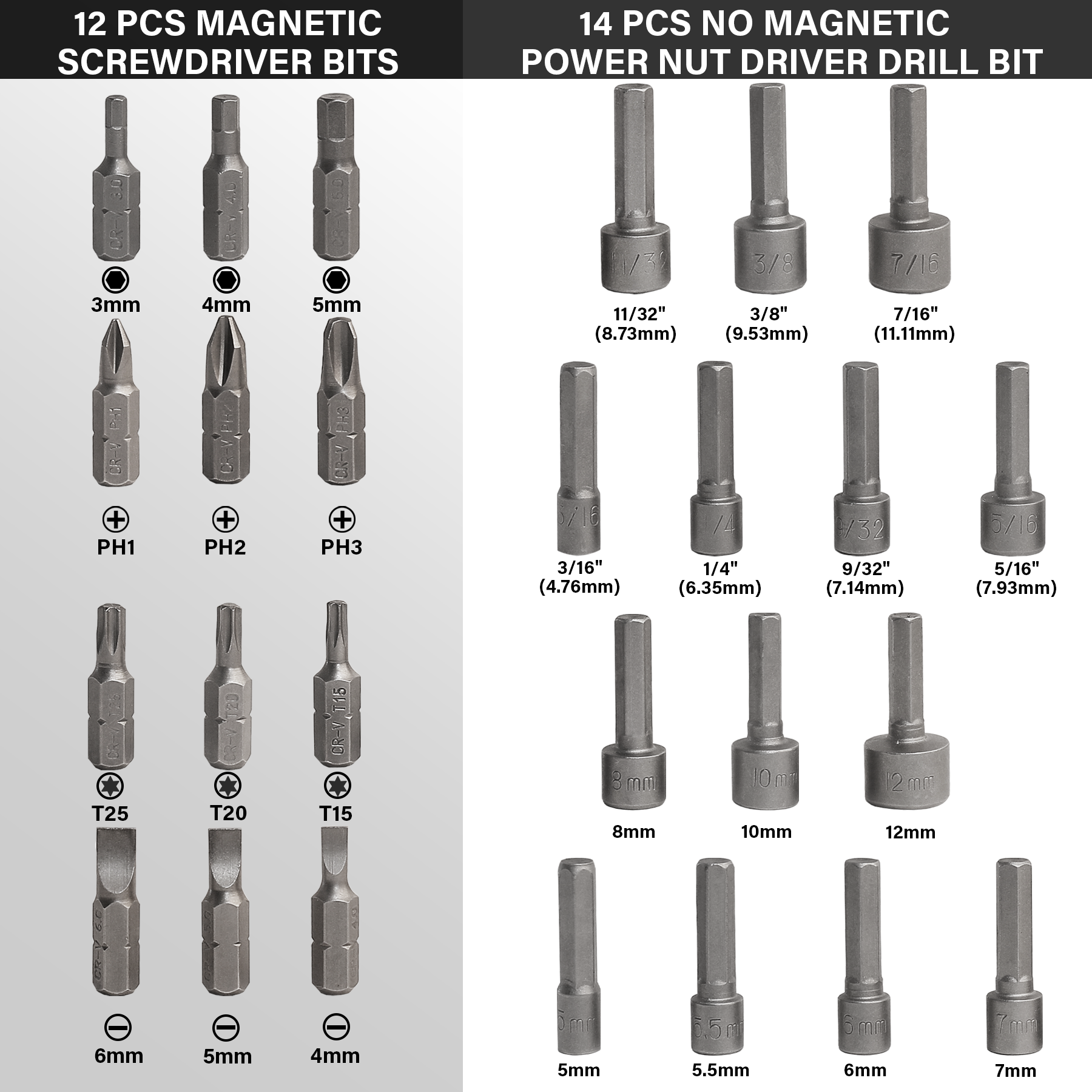 - Multi-functional: Freatures multi bits making it real multi screwdriver tool all in one, including 12pcs 1/4" CRV screwdriver bits in Phillips, Slotted, Torx, and Hex, 14pcs 1/4" nut driver bits in SAE and metric