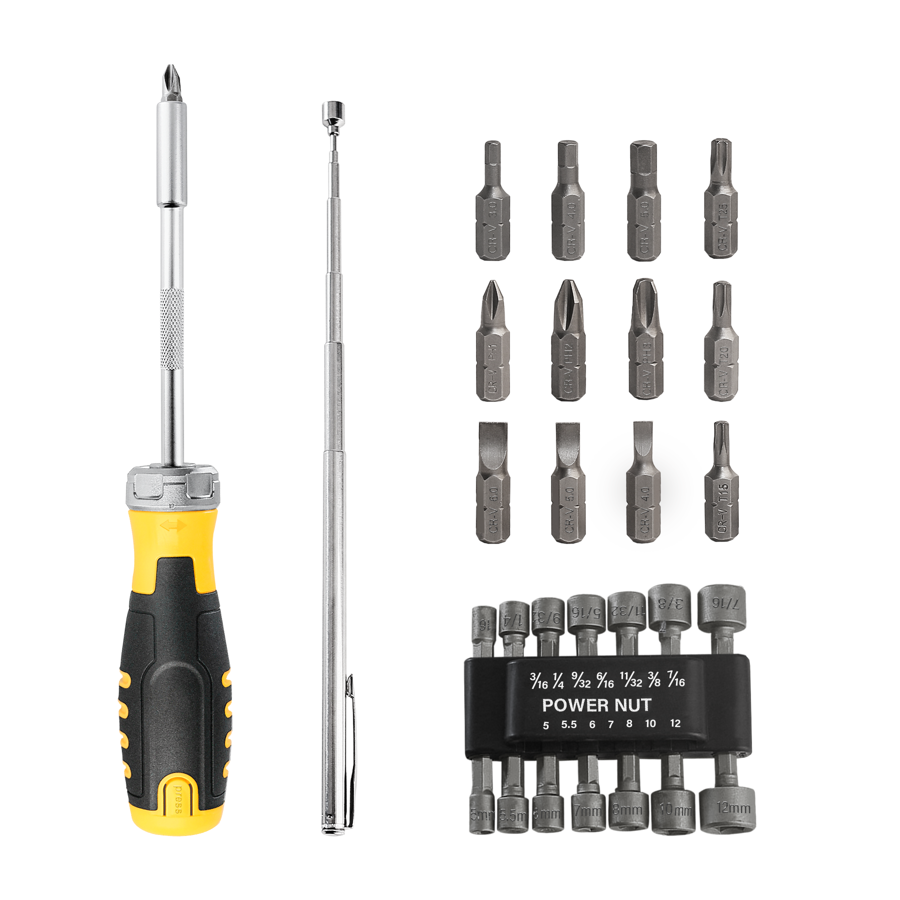 HAUTMEC 28 Pcs Magnetic Ratcheting Screwdriver Set, Multi-bit Screw Driver Set Including CRV Screwdriver Bits, Nut Driver Set and Telescoping Magnetic Pickup Tool for DIY, Electronics, Auto Repair,HT0443