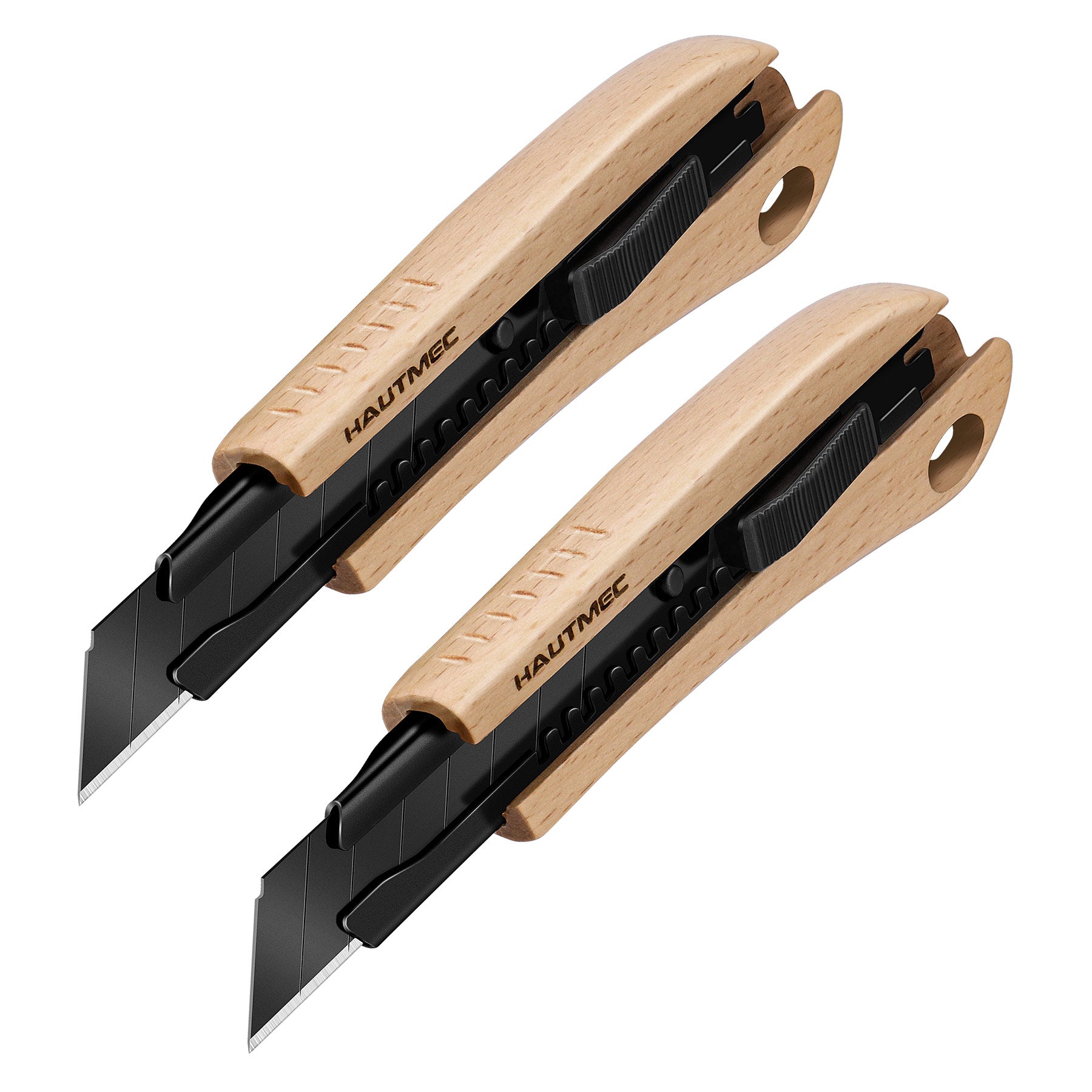 HAUTMEC 2PCS 18mm Retractable Utility Knife Wooden Handle, Heavy Duty Box Cutter Autolock and Snap off with SK2H Ultra Sharp Black Blade, Wooden Recyclable Handle Design, HT0352-2PC