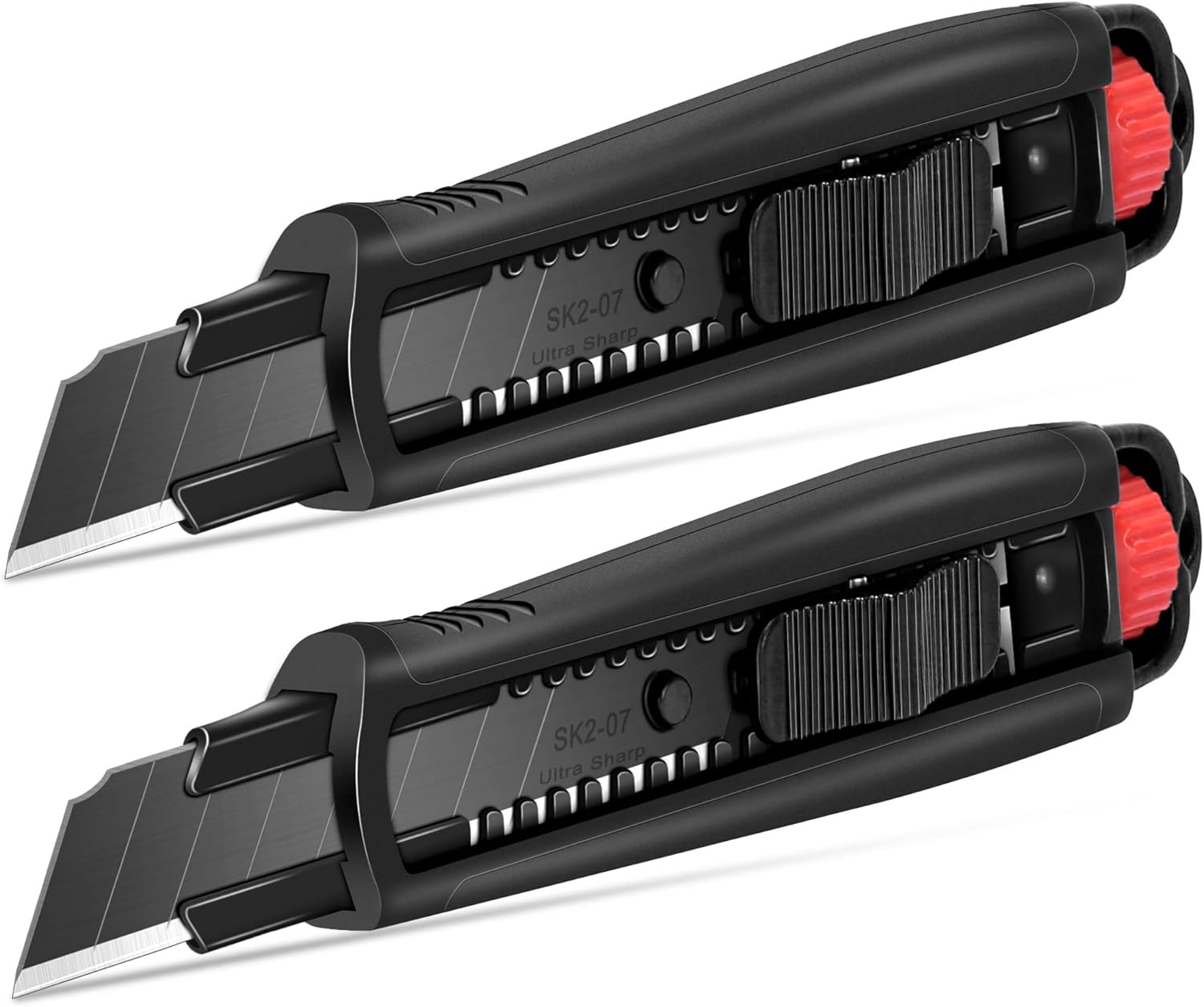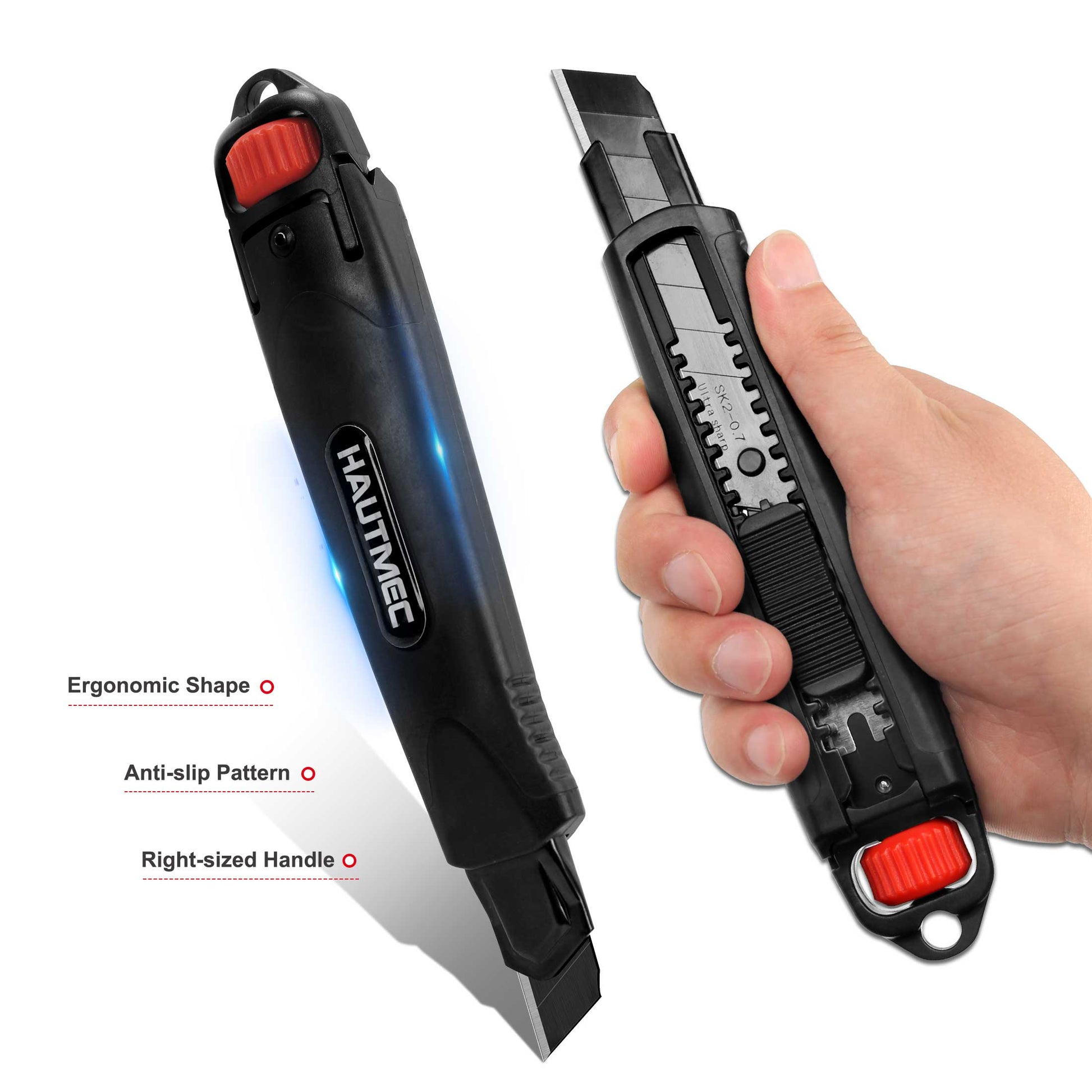 HAUTMEC 2PCS HAUTMEC 18mm Extra Heavy Duty Utility Knife with Double Lock Mechanism, Auto-Lock and Ratchet- Lock for Double Safety, SK2 Sharp Black Blade for Industrial or Construction Applications HT0136-2PC
