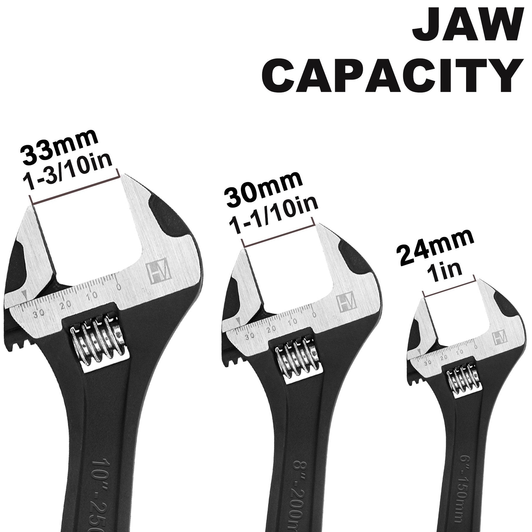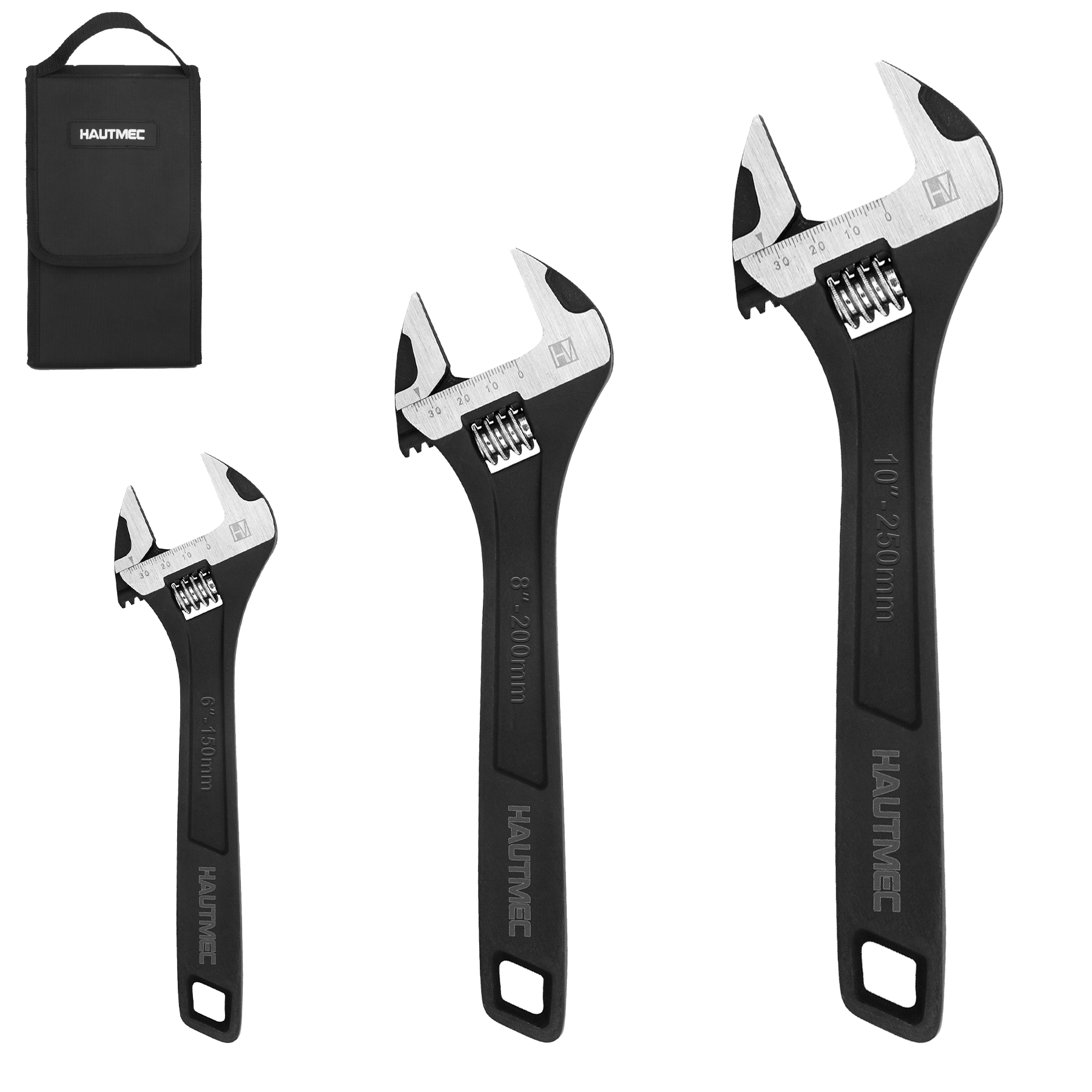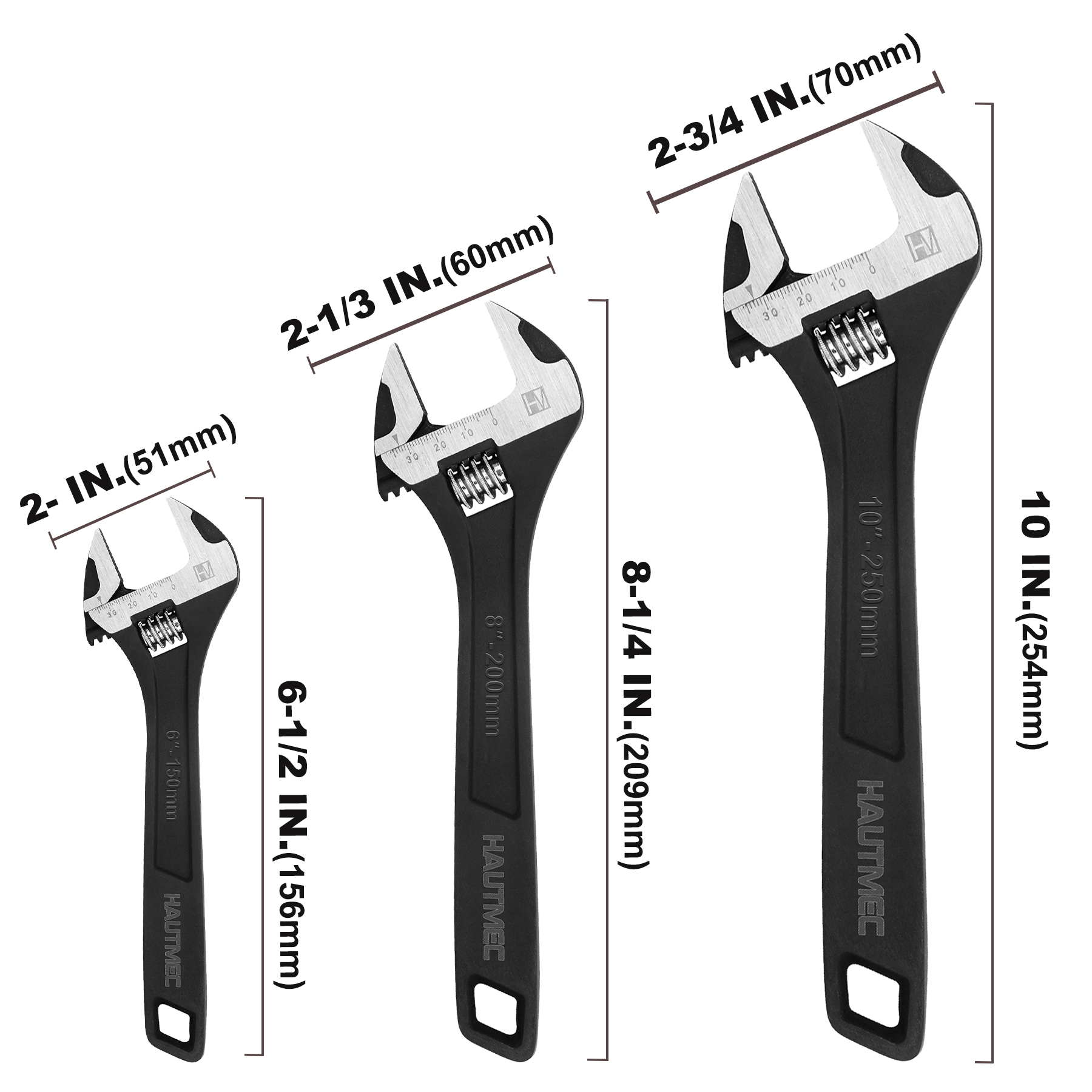 HAUTMEC 3PCS Adjustable Wrench Set Extra Wide Jaw Black Finish Adjustable Wrenches Drop-Forged CR-V Steel Metric & SAE Scales 6 in. 8 in. 10 in. for Home Garage Workshop DIY,HT0422
