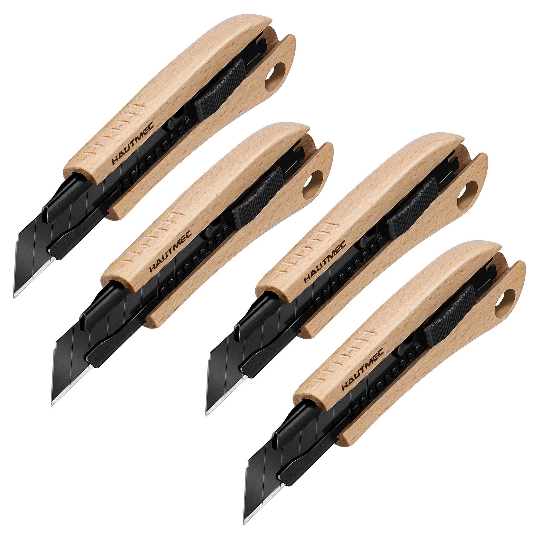 HAUTMEC 4PCS 18mm Retractable Utility Knife Wooden Handle, Heavy Duty Box Cutter Autolock and Snap off with SK2H Ultra Sharp Black Blade, Wooden Recyclable Handle Design, HT0352-4PC