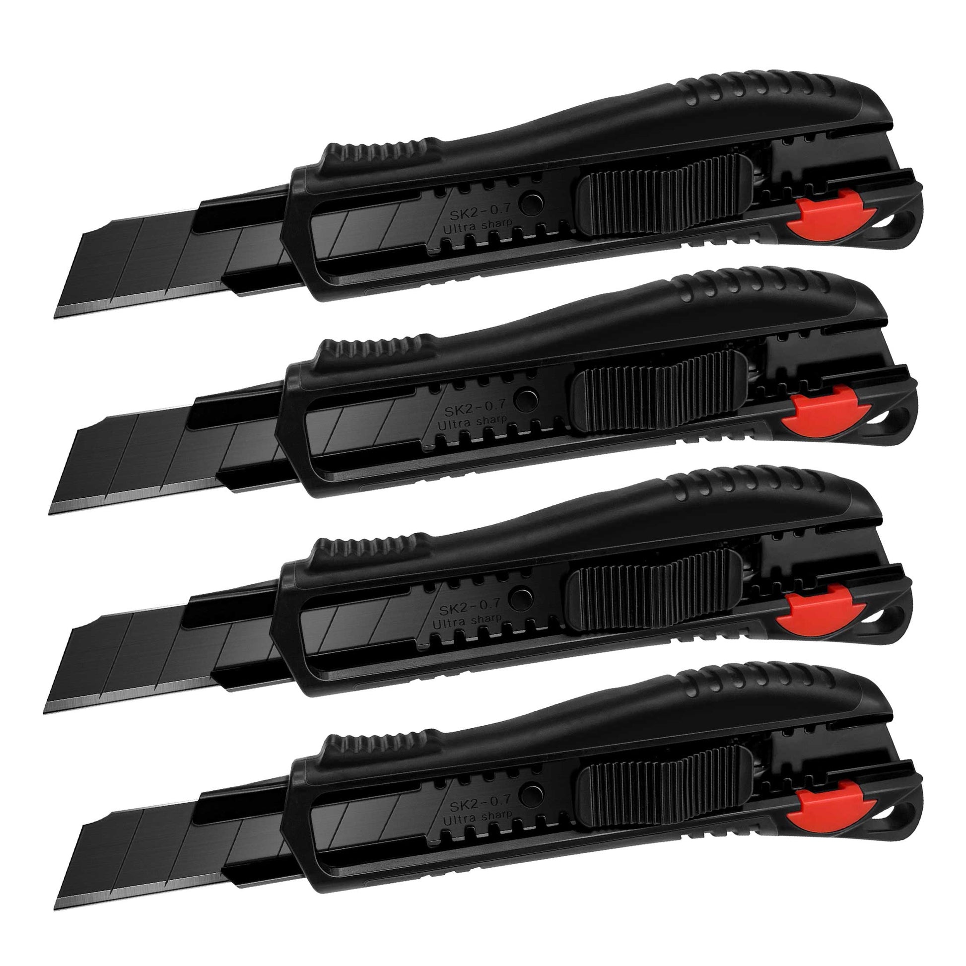 HAUTMEC 4PCS18mm Utility Knife Box Cutter with Safety Quick Change Button, Snap off Black SK2 Ultra Sharp Blade, Anti-Slip Ergonomic Rubber Handle for Leather, Rubber, Cartons, Boxes HT0081-4PC