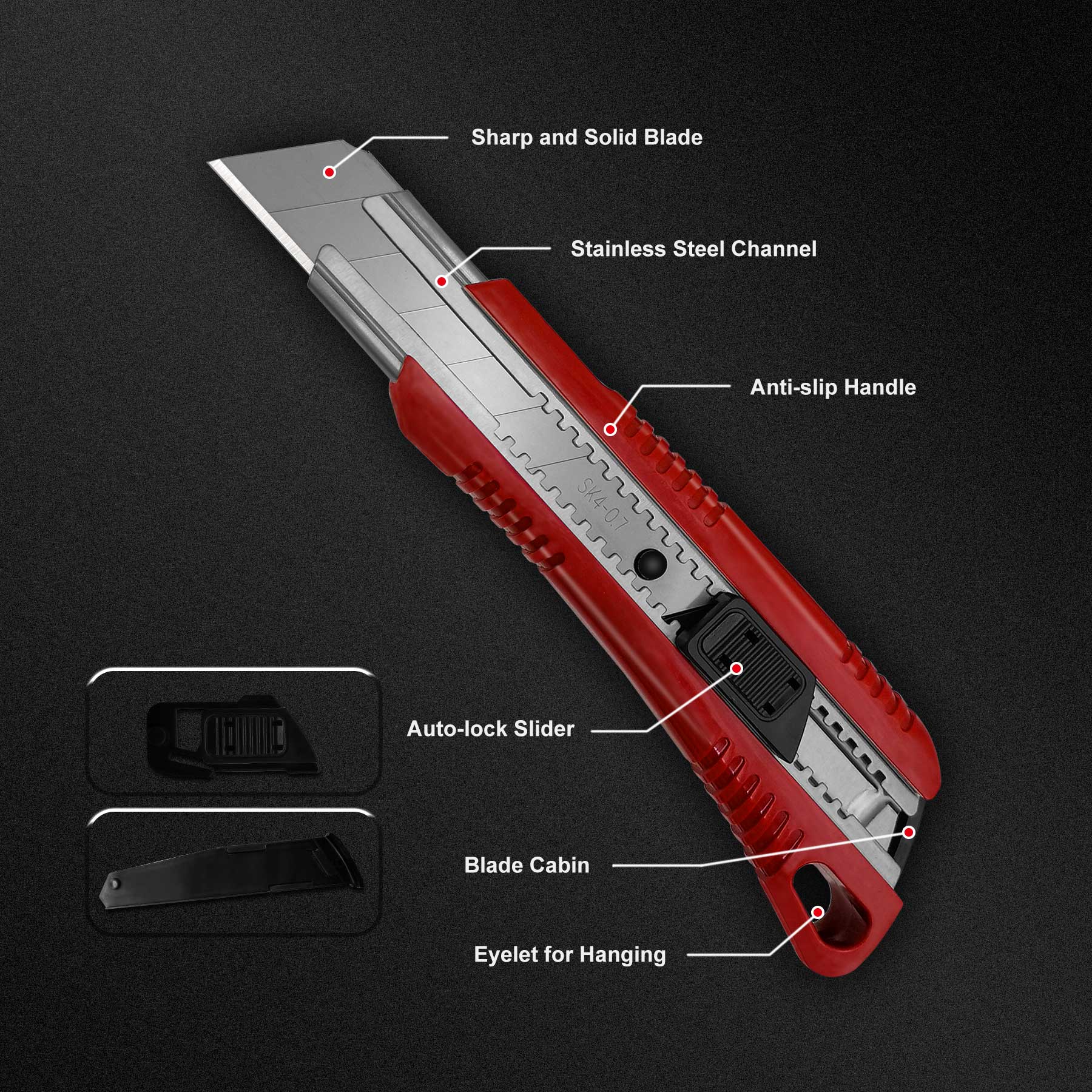 - 【Quality Sharp Blade】Blades play a vital role in knives. This knife has 3pcs 25mm Extra Heavy-Duty SK4 blades which are greater in edge retention, thickness, sharpness and durability than traditional blades, effectively cutting through a variety of materials like drywall, cardboard, cartons, leather, carpets and more
