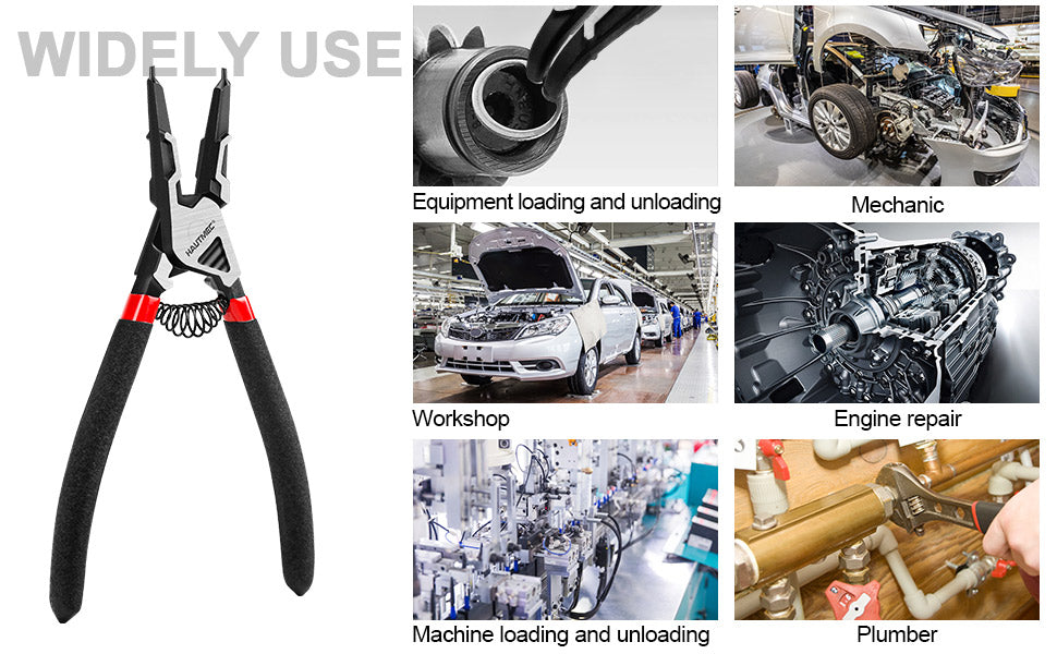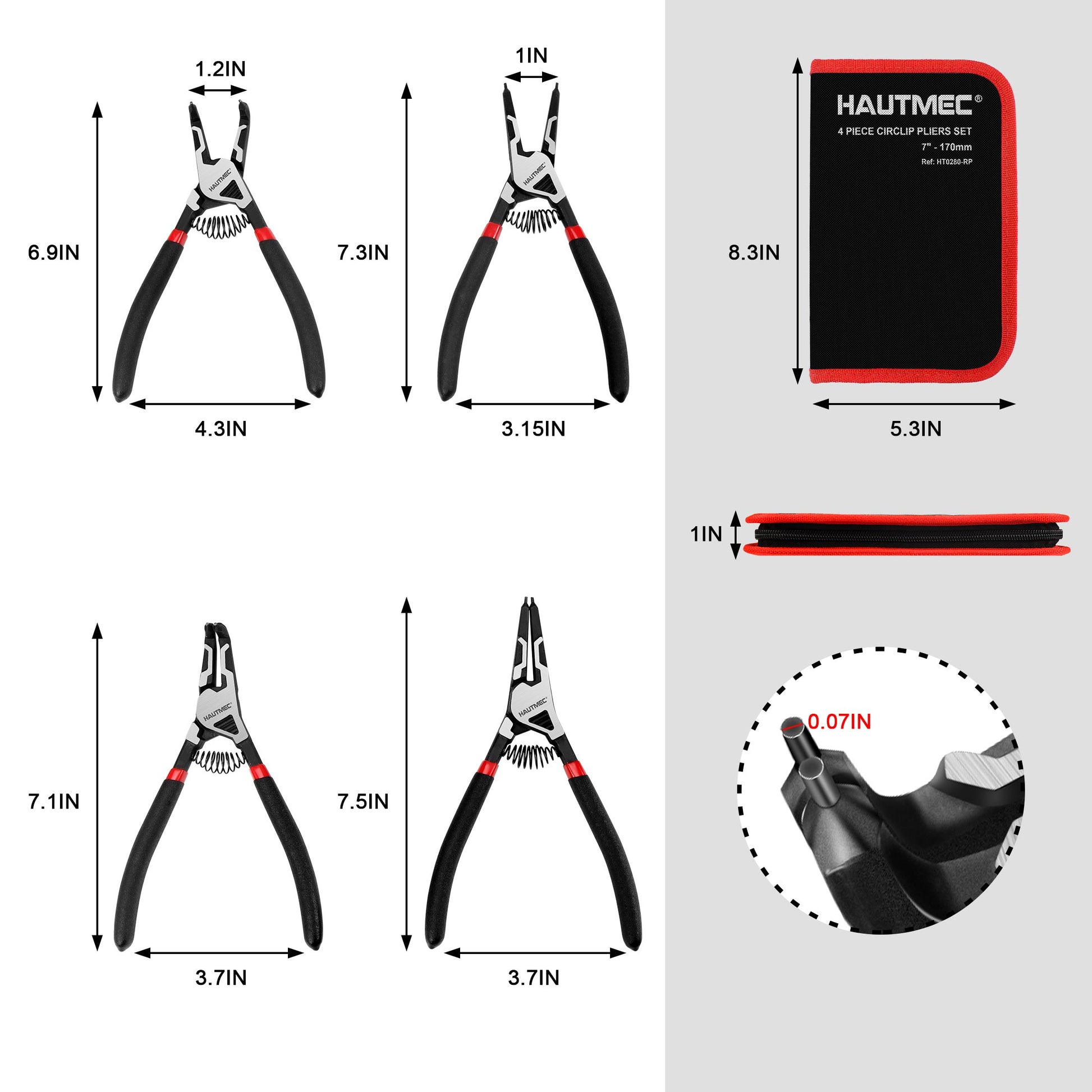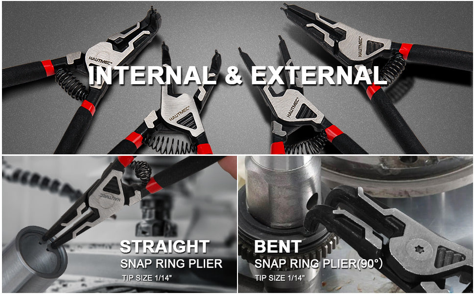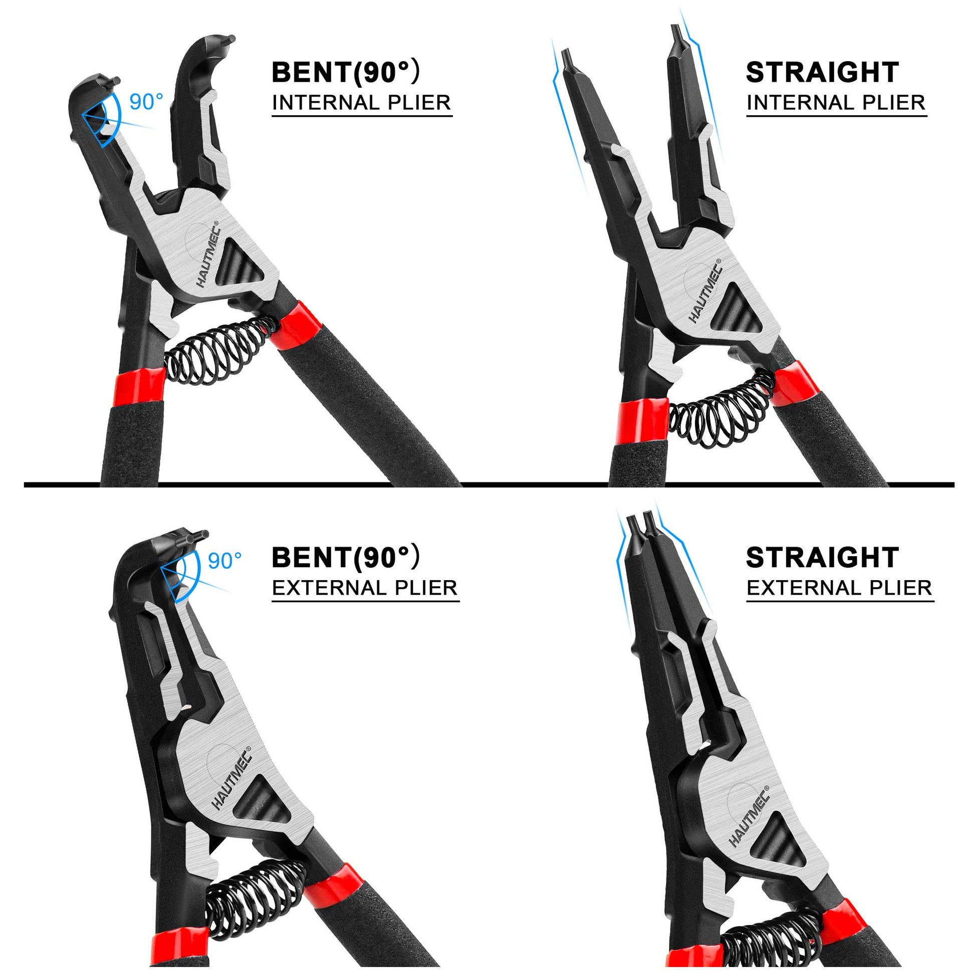 - Package Include:4pcs 7 inch snap ring pliers with 1pc straight internal circlip pliers,1pc 90-degree angled internal circlip pliers,1pc straight external circlip pliers and 1pc 90-degree angled external circlip pliers
