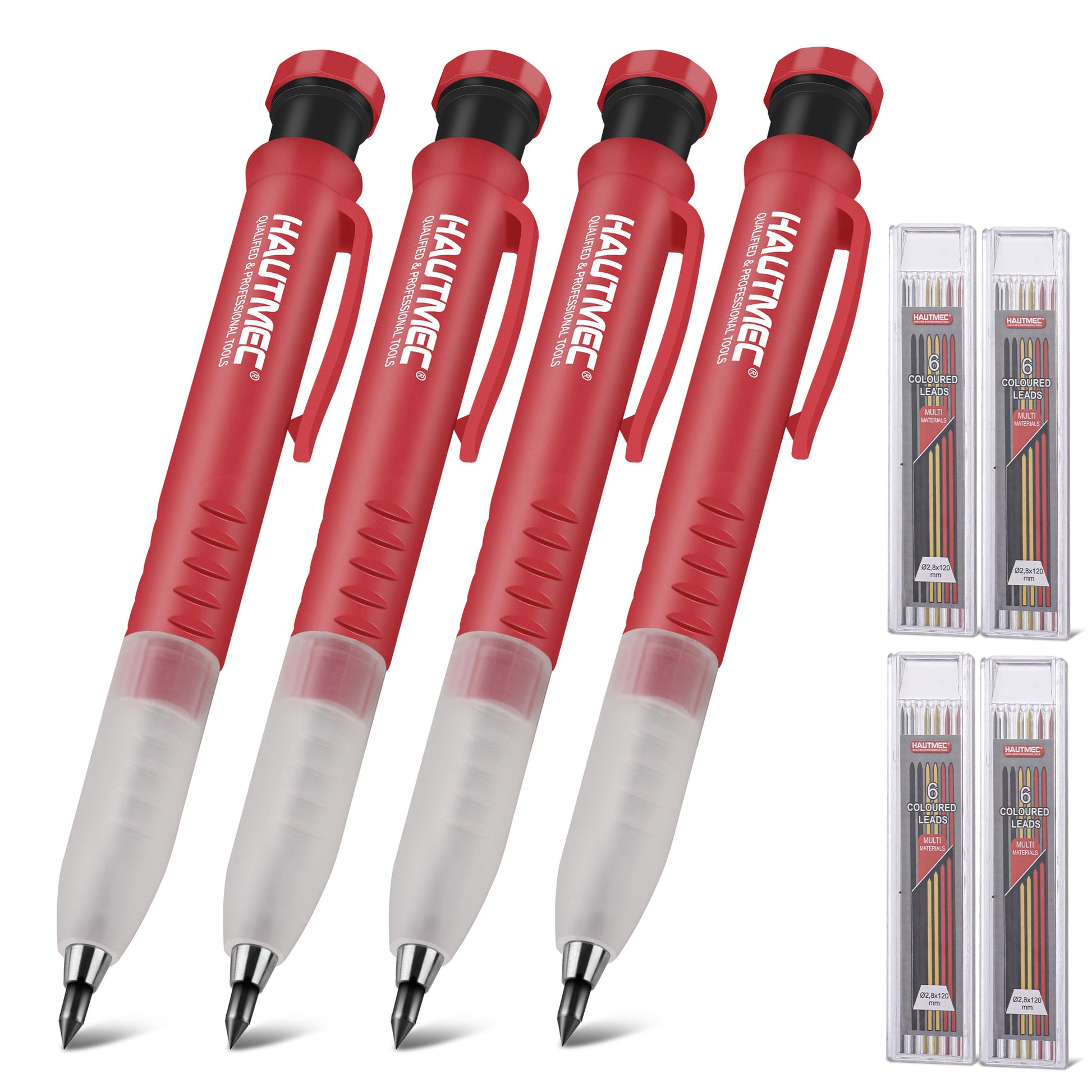 HAUTMEC 4 Pack 3-in-1 Carpenter Pencils with Removable Finger Grip, Built-in Sharpener and 28 Leads (3 Colors), Mechanical Construction Pencil for Deep Marking Scribing, Pro Tracer Pencil, HT0293-4