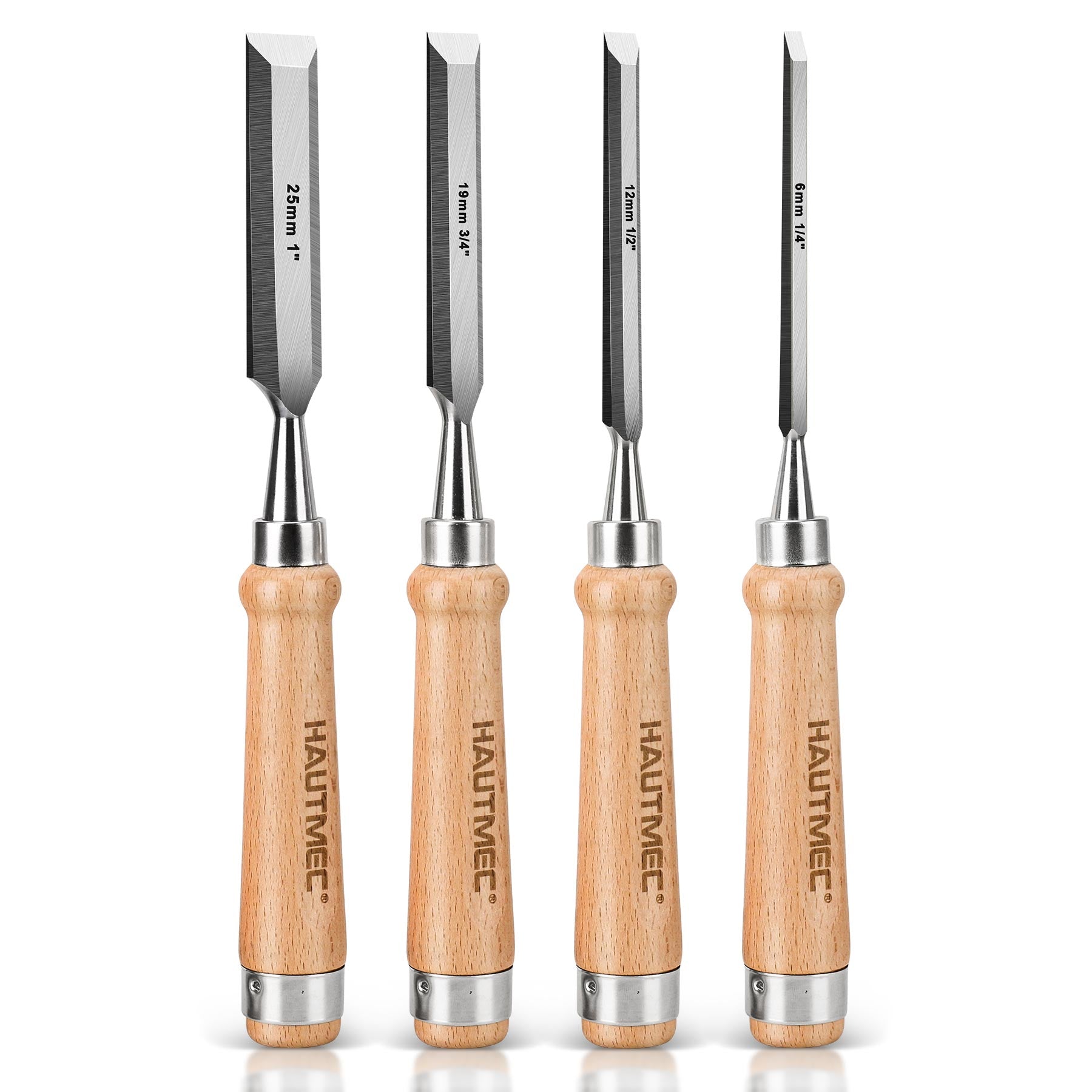 HAUTMEC 4PCS Wood Chisel Set for Woodworking, Carpentry Carving Tool with Bevel Edged Steel Blade, High Impact Handle for Woodcutting Sharpening HT0235-WW