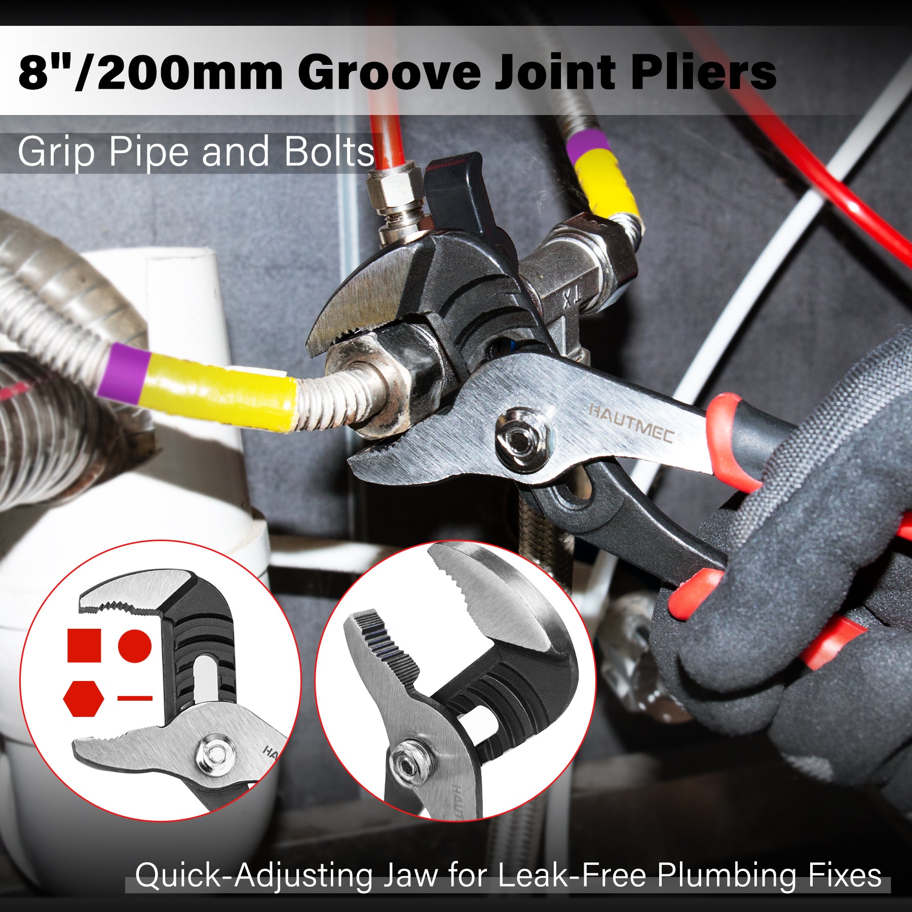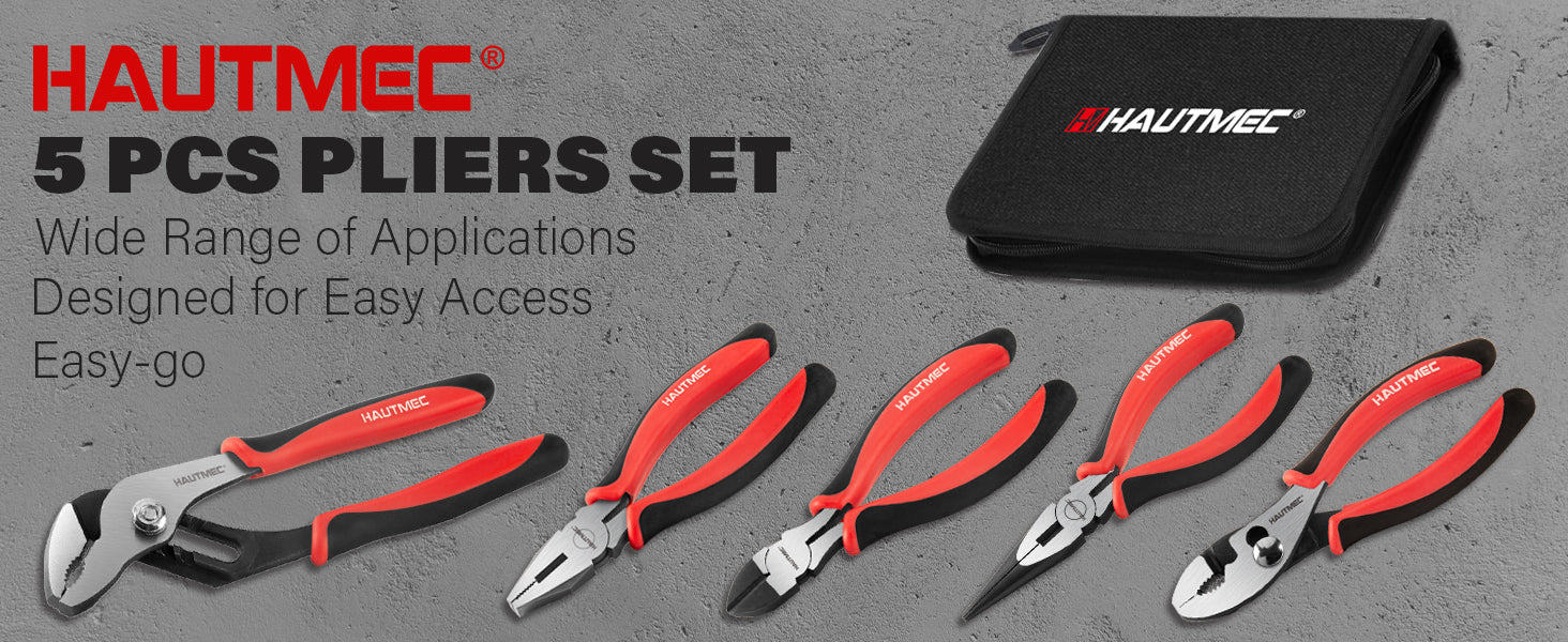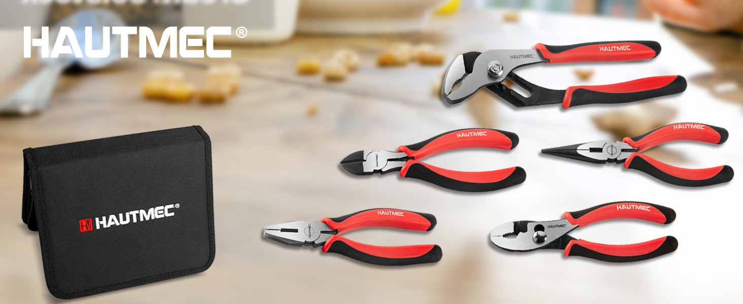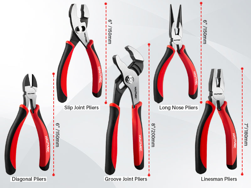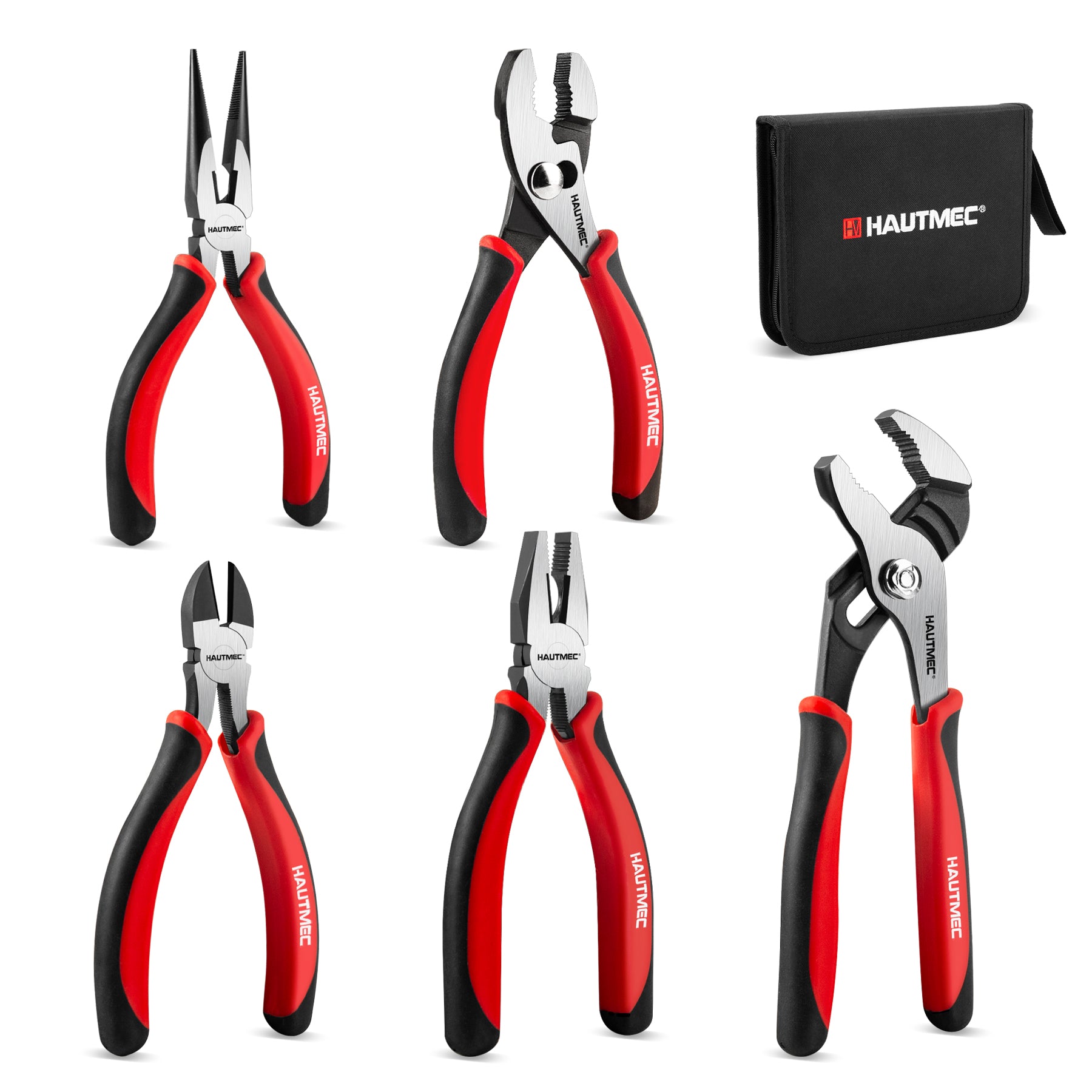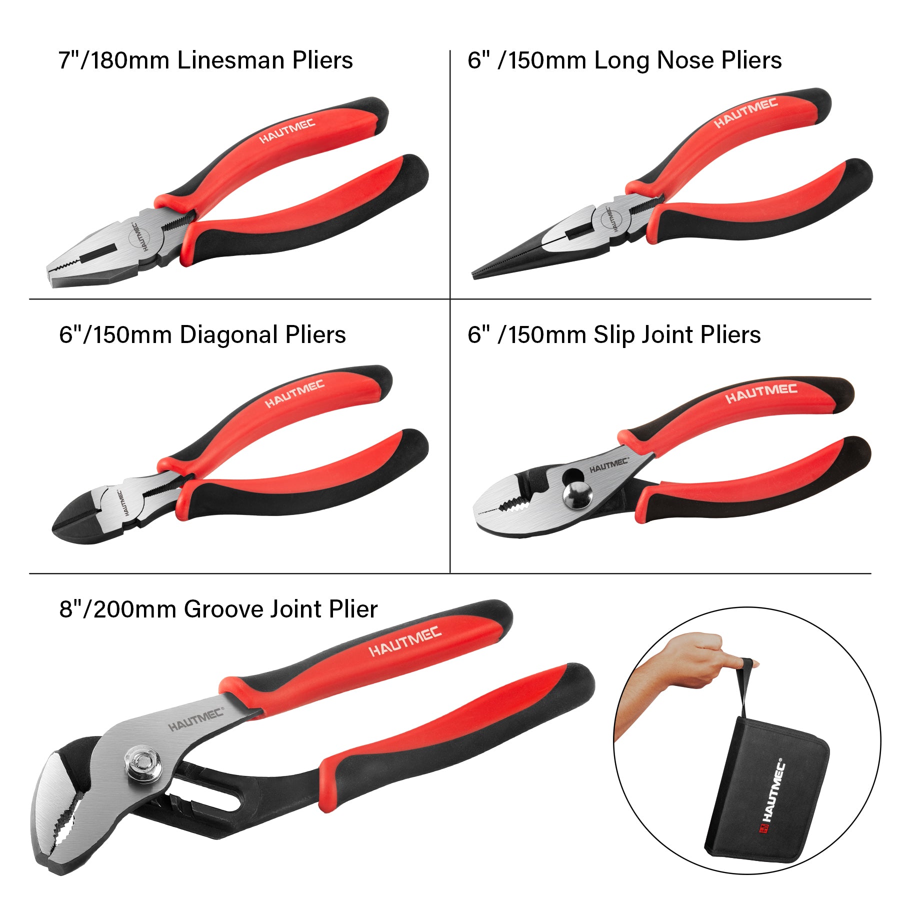 HAUTMEC 5-Piece Pliers Set with Bi-Material, Including 6" Slip-joint, Long Nose, Diagonal Cutters, 7" Linesman Pliers, 8" Groove Joint Plier, for Home Maintenance, Basic Repair & DIY, HTPTM25035