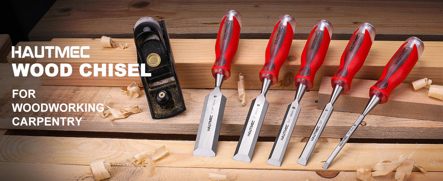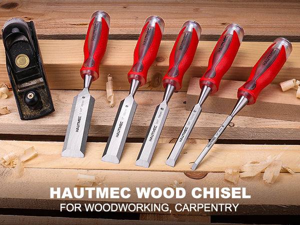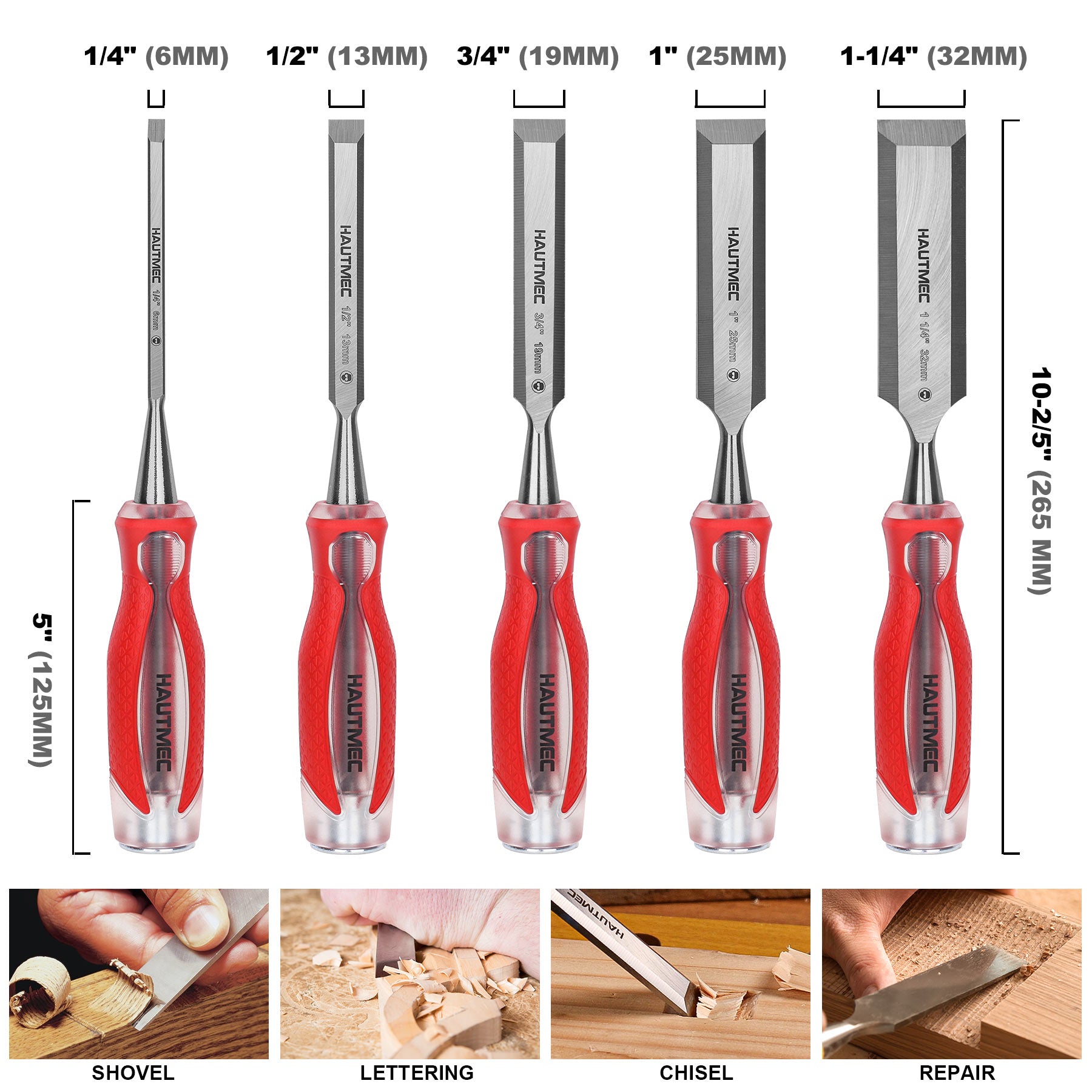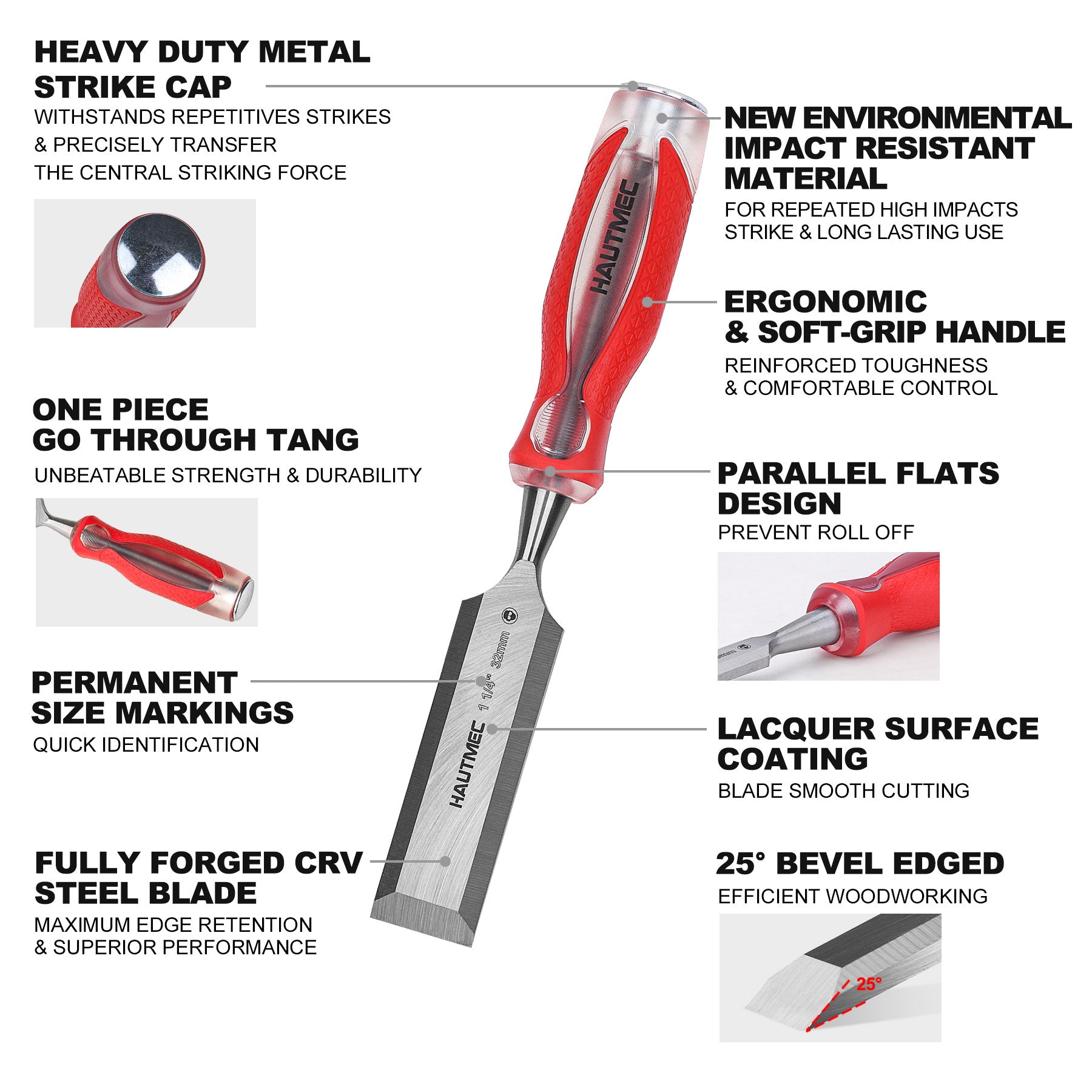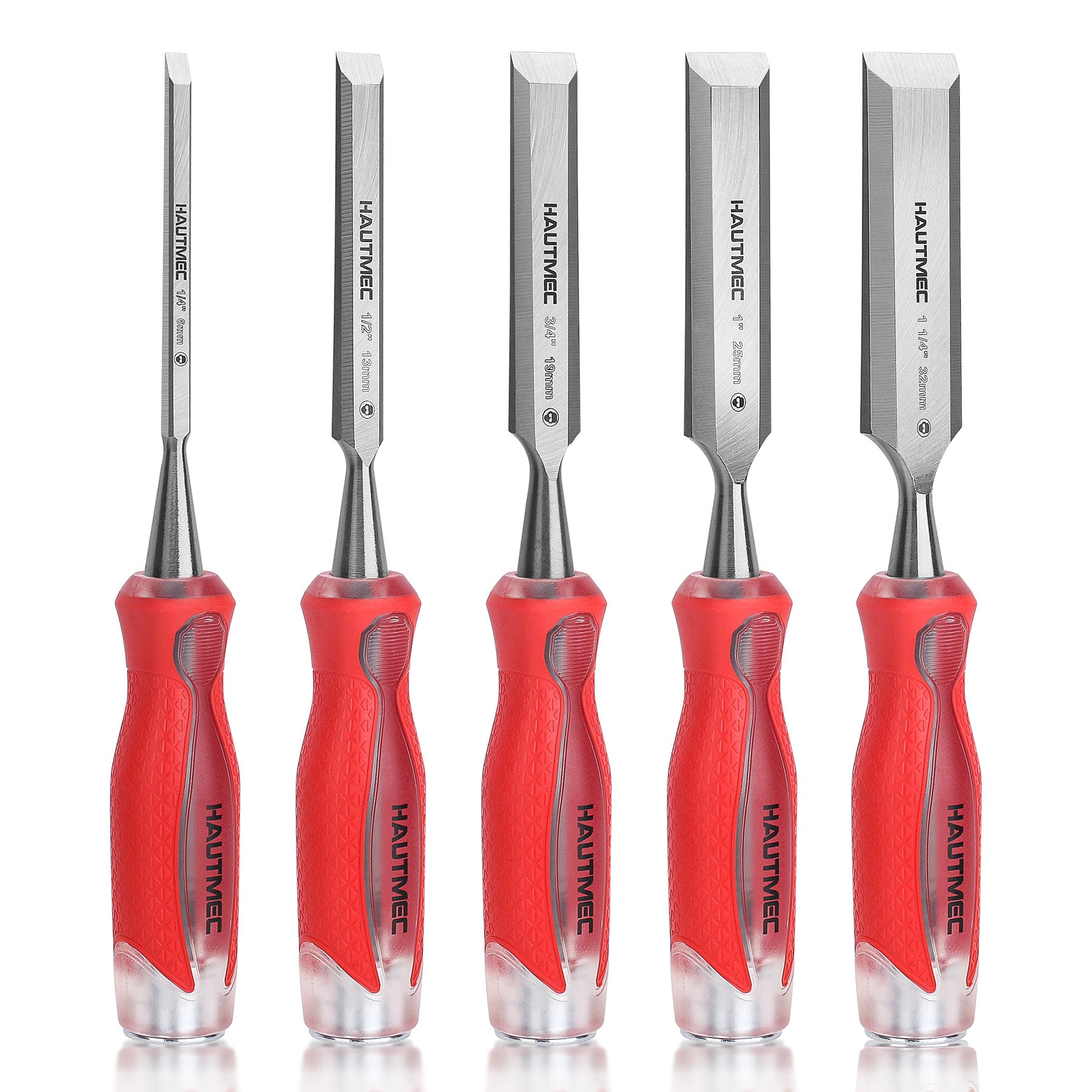 HAUTMEC 5-Piece Wood Chisel Set – High-Impact Drop-Forged CRV Steel, Fully Polished Beveled Edge Blades, Heavy-Duty Strike Cap & Extended Anti-Skid Handle – HT0365