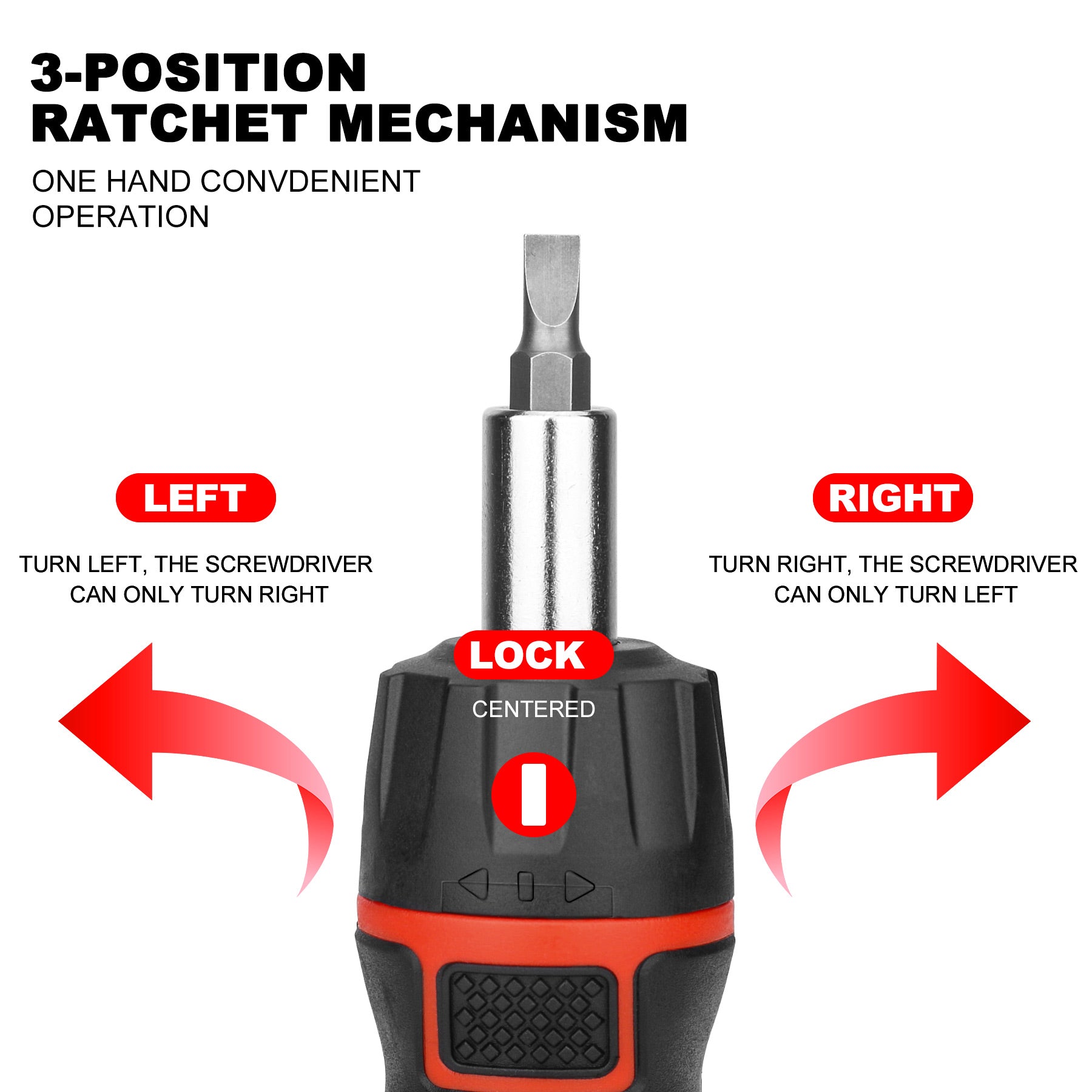 - Three-Position Ratchet: Ratcheting mechanism with three position that allows user to work faster and more efficiency in clockwise and counter-clockwise ratcheting and locked position.