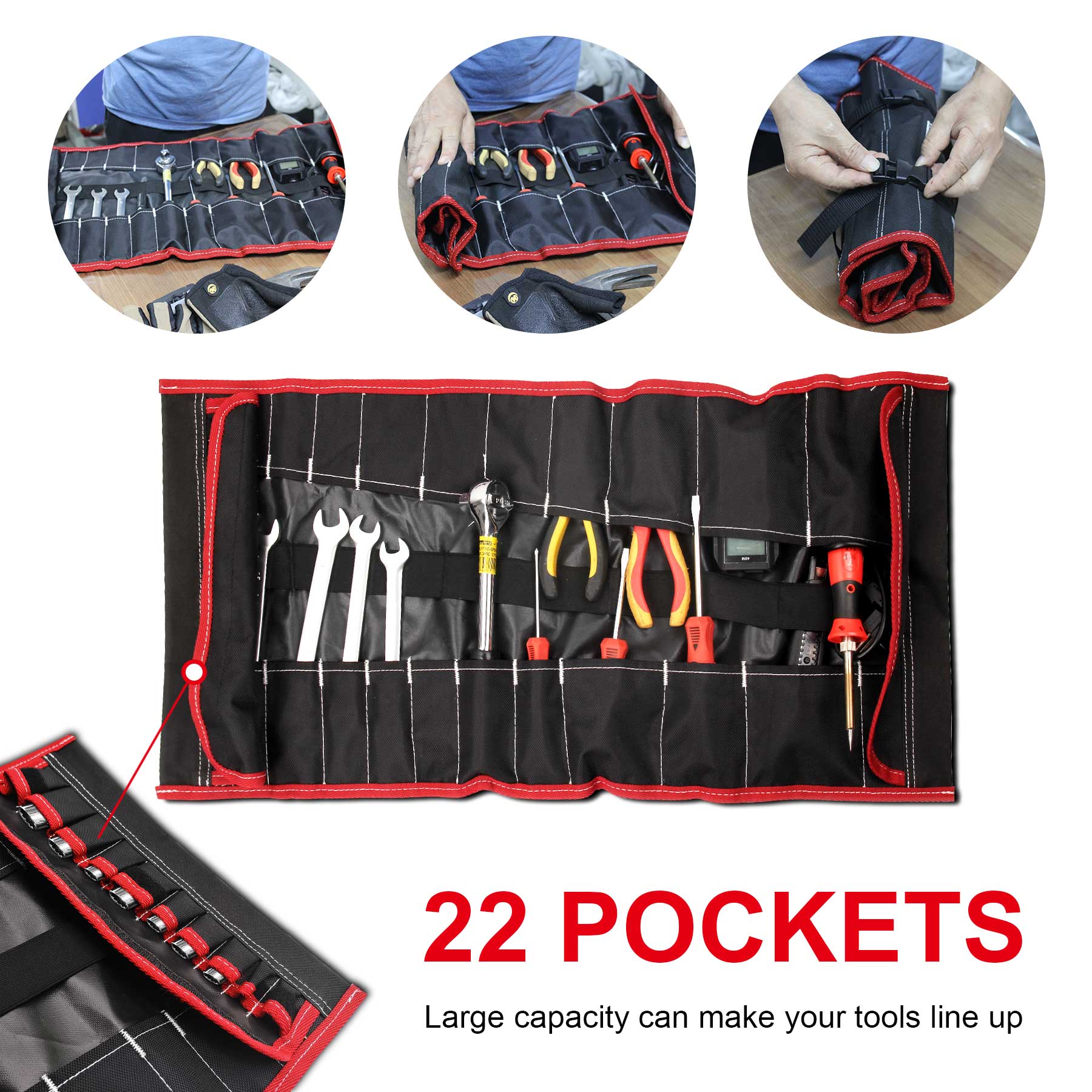 - Manage Your Space: 22 pockets for various accessories such as wrenches, screwdrivers, pliers, etc. There are also 10 plug pockets with covers on the side for fixing sockets and other small tools to keep your tools in order